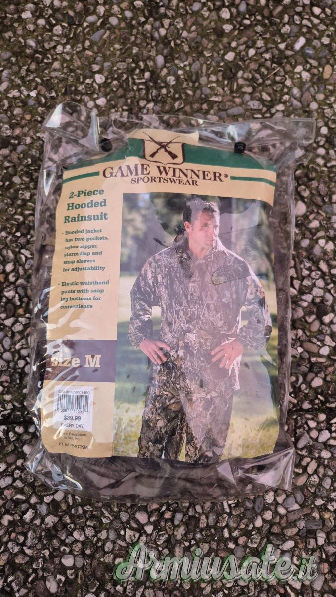 Vendo completo antipioggia originale Americano acquistato nel negozio Bass Pro Shops, taglia M (veste largo) nuovo mai utilizzato.