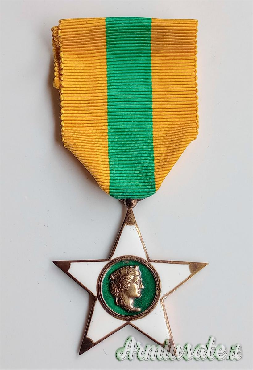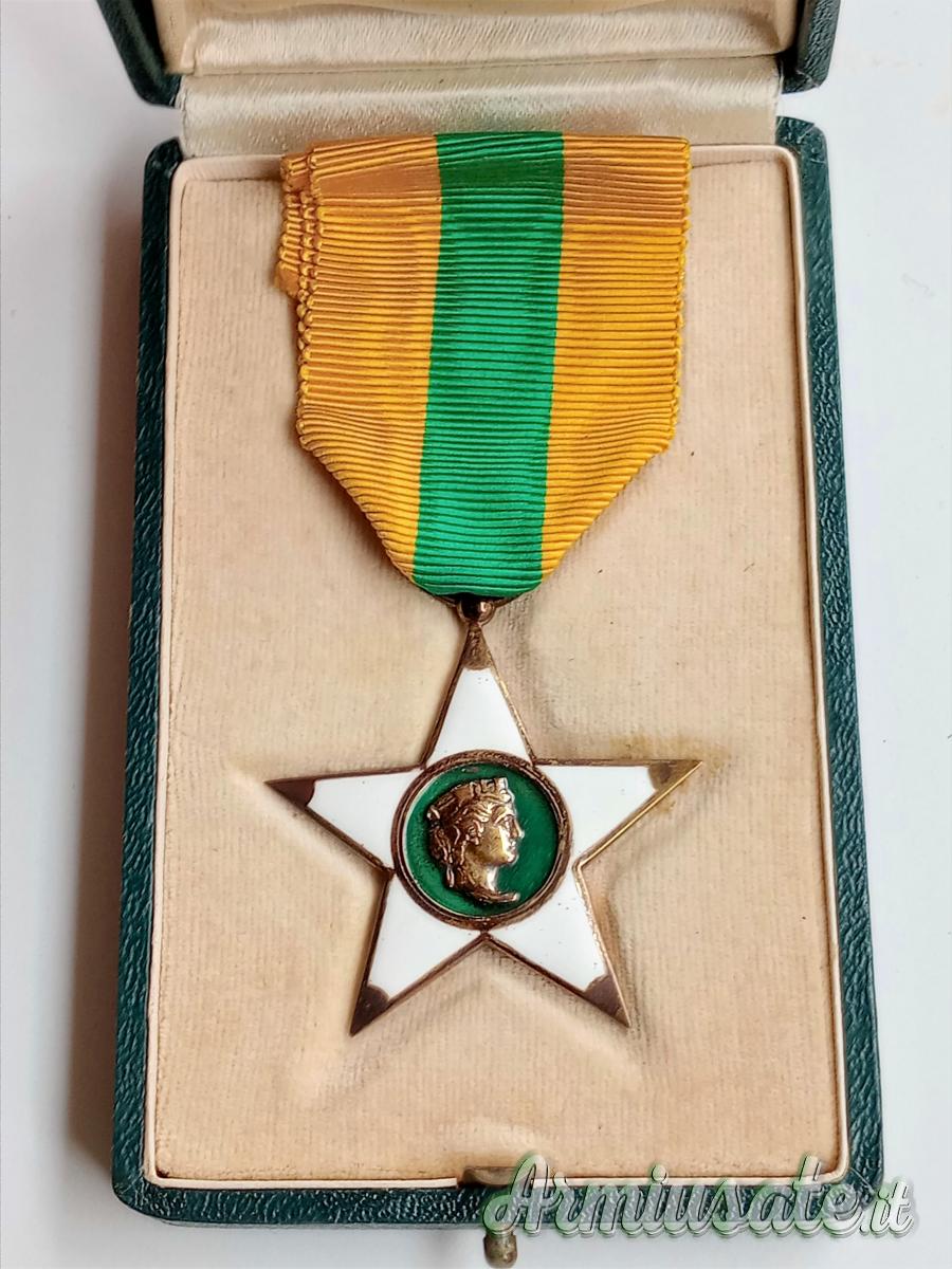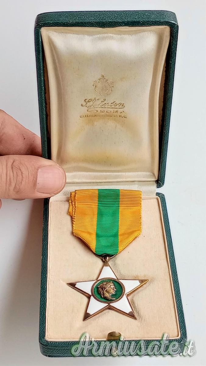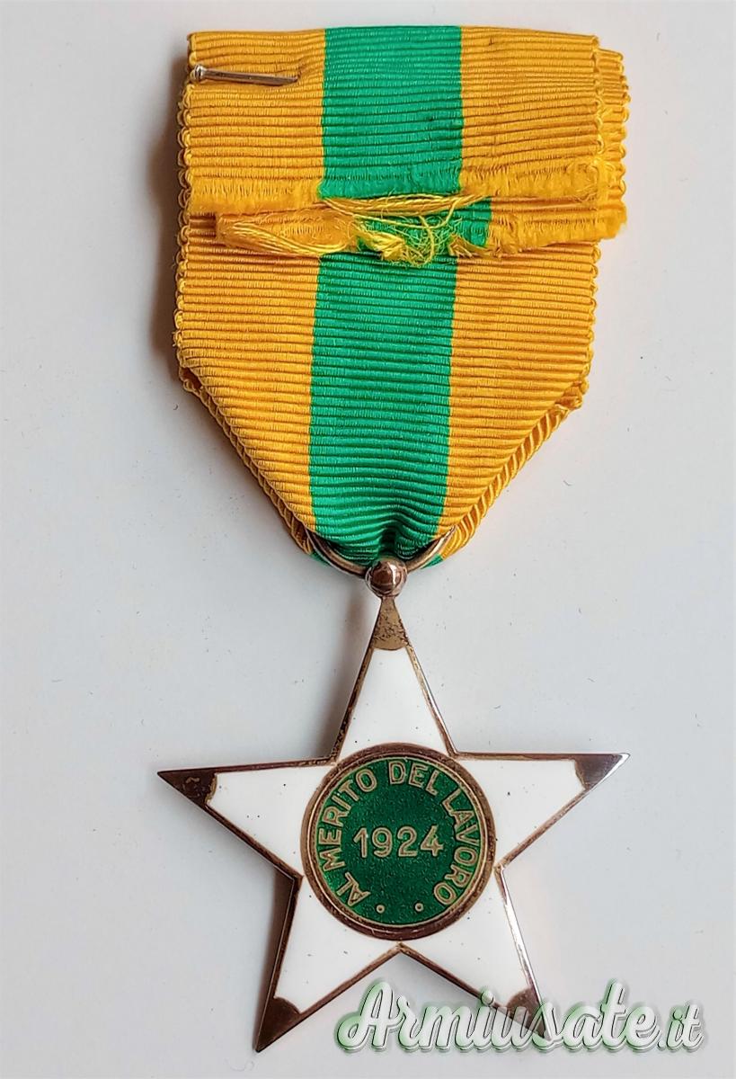 CENNI STORICI: L’affascinante decorazione risale al R.D. 1º maggio 1898, n. 195. Infatti, il Re UMBERTO I istituì una "Decorazione del merito agrario ed industriale" per gli imprenditori agricoli e industriali e una “medaglia d'onore” per i loro dipendenti. Con il R.D. 9 maggio 1901, n. 168, il re Vittorio Emanuele III trasformò questa decorazione nello “Ordine cavalleresco al merito agrario, industriale e commerciale”. L'onorificenza poteva essere conferita anche ai dipendenti operai (art. 2, c. d). Nel 1923 l'ordine, che nel frattempo aveva mutato denominazione in “Ordine al merito del lavoro”, venne sdoppiato. Il R.D. 30 dicembre 1923, n. 3031, restrinse l'accesso all'ordine ai soli imprenditori e, contemporaneamente, il R.D. 30 dicembre 1923, n. 3167, istituì per i lavoratori la “Stella al merito del lavoro” che da allora ebbe vita autonoma. Questa decorazione, con il tipo immodificato, è stata assegnata anche durante il periodo della Repubblica Italiana. La decorazione consiste in «una stella a cinque punte in smalto bianco; il centro è in smalto color verde chiaro e reca sulla faccia diritta un rilievo in argento dorato, raffigurante la testa d'Italia Turrita e sul rovescio la scritta “AL MERITO DEL LAVORO” con l'indicazione dell'anno di fondazione (1924)» con il nastrino tricolore giallo-verde-giallo della lunghezza di 120 mm in piega coeva di 60 mm. È conforme al disegno araldico annesso al R.D. 25 gennaio 1925, n. 120.