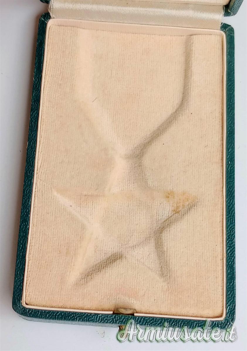 Il cimelio si presenta in “ECCELLENTI/MUSEALI” condizioni di conservazione, ancora in patina coeva, senza né difetti, né mancanze, né rotture alcuna in ogni suo componente. Misure: diametro stella = 40 mm, nastro = 140 mm di cui 70 mm in piega per parte; peso = 16,65 grammi. Scatola = 110 mm x 70 mm.