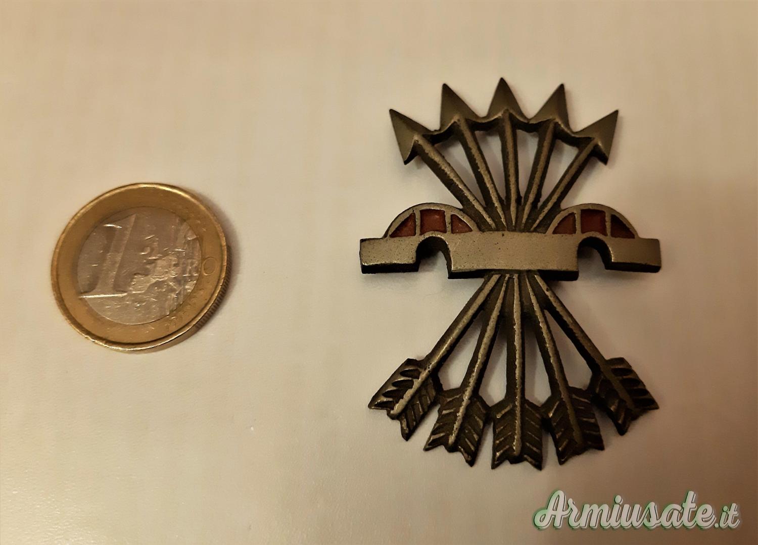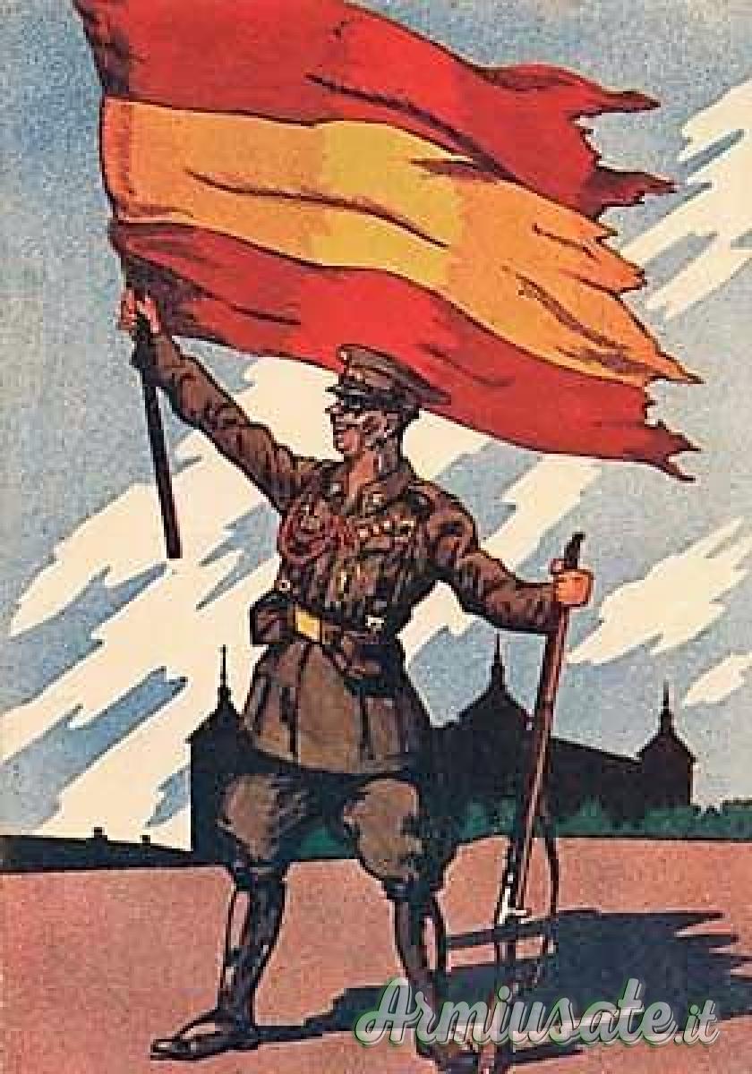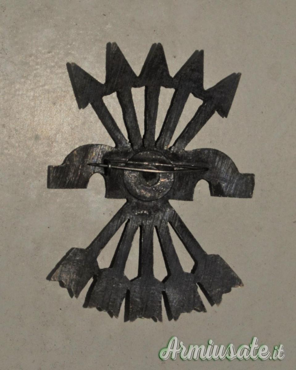 CENNI STORICI: Il “giogo e le frecce” rappresenta lo stemma araldico dai Re cattolici Ferdinando di Aragona e Isabella di Castiglia che indica l’unione fra i due rami dinastici spagnoli, simboli di riscossa contro un nemico apertamente anti-cattolico. Il “giogo”: dal latino “iugum” (autocontrollo) rappresenta la sopportazione della dura e disciplinata fatica quotidiana; le “frecce”: la capacità di intraprendere ambiziose imprese, simbolo universale del superamento delle condizioni normali e della potenza guerriera. La “Falange Española de las J.O.N.S.”, fu un partito politico fortemente nazionalista foggiato sul modello del Fascismo italiano. Esso nasceva dalla fusione dello spontaneismo ultra patriottico della “Falange Española” con la “Juntas de Ofensiva Nacional Sindicalista” (acronimo “J.O.N.S.”). Nel 1936, la Falange raccolse nelle sue fila migliaia di giovani che nel movimento falangista trovarono la “legittimazione ideologica” per una nuova crociata religiosa e patriottica in chiave anticomunista.