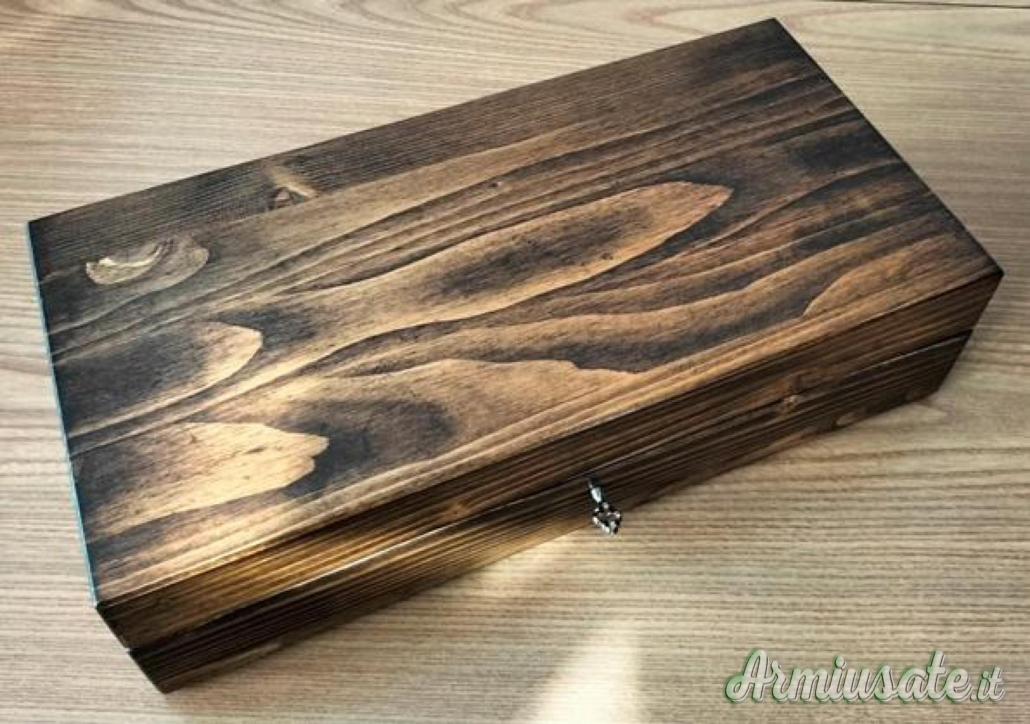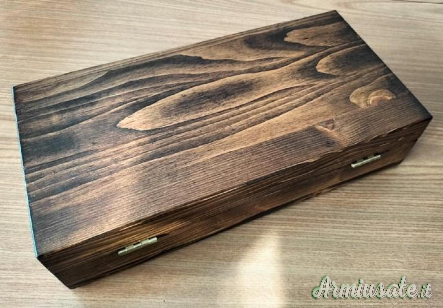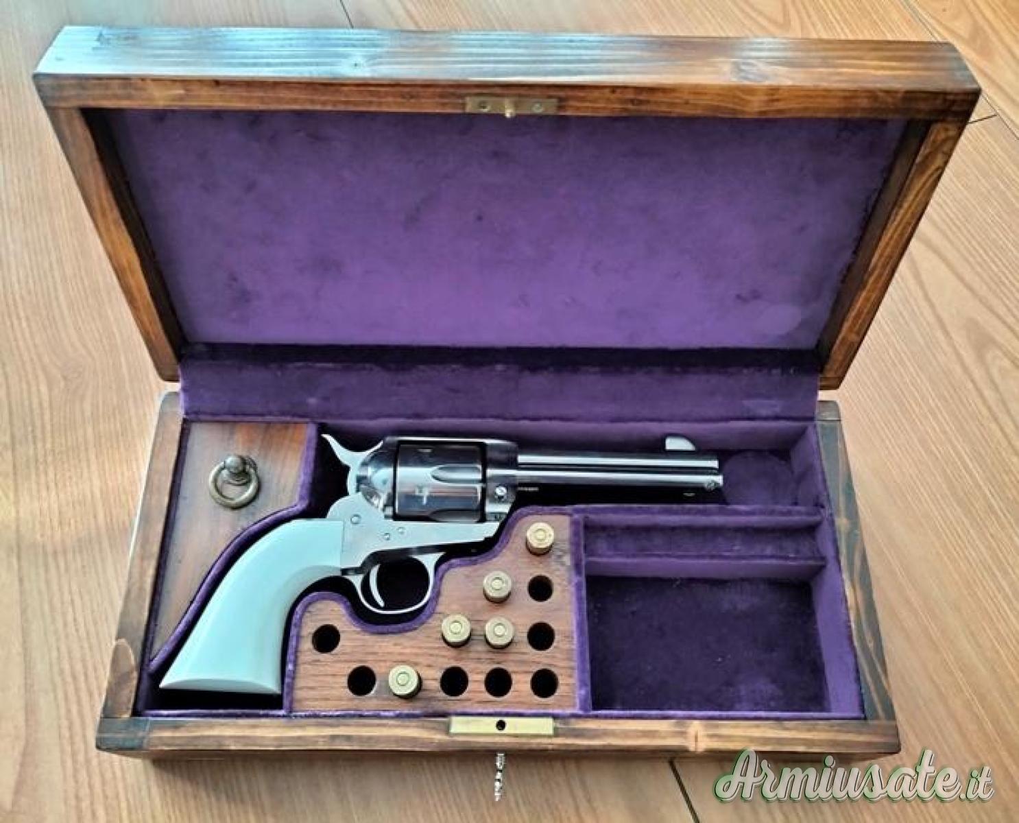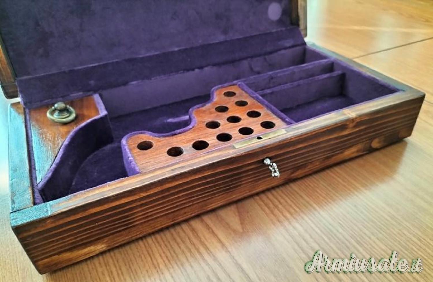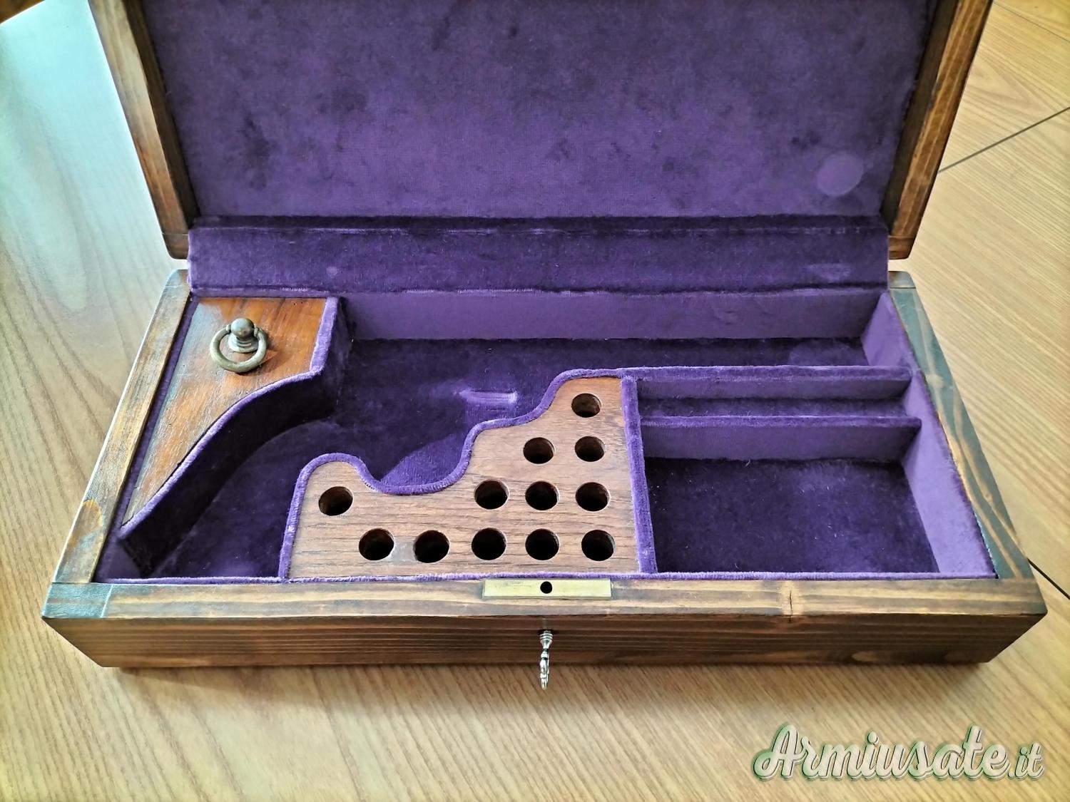Il cofanetto, di fabbricazione artigianale, è foderato internamente in velluto viola e presenta chiusura con serratura e chiave. I fori dello scomparto in legno per le cartucce sono predisposti per il cal. 45 colt.