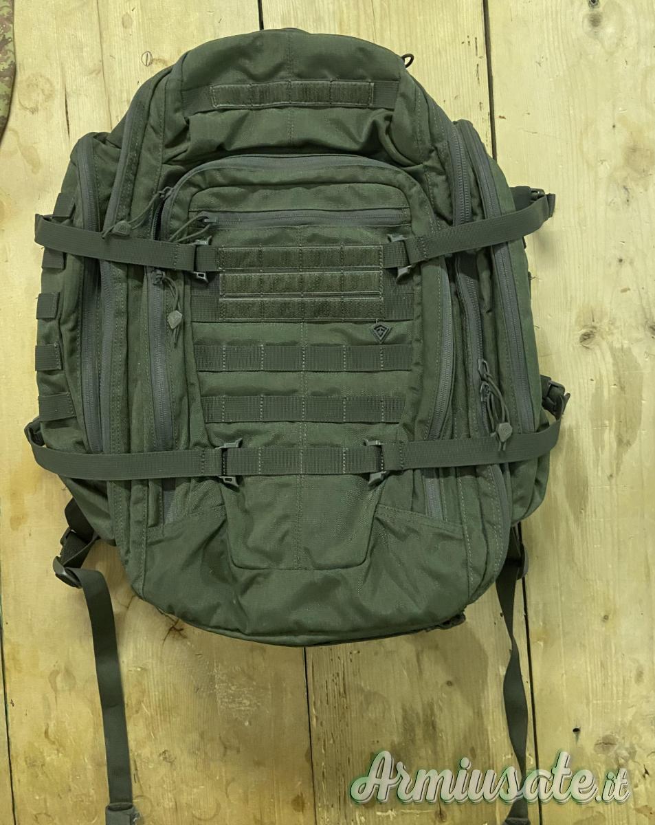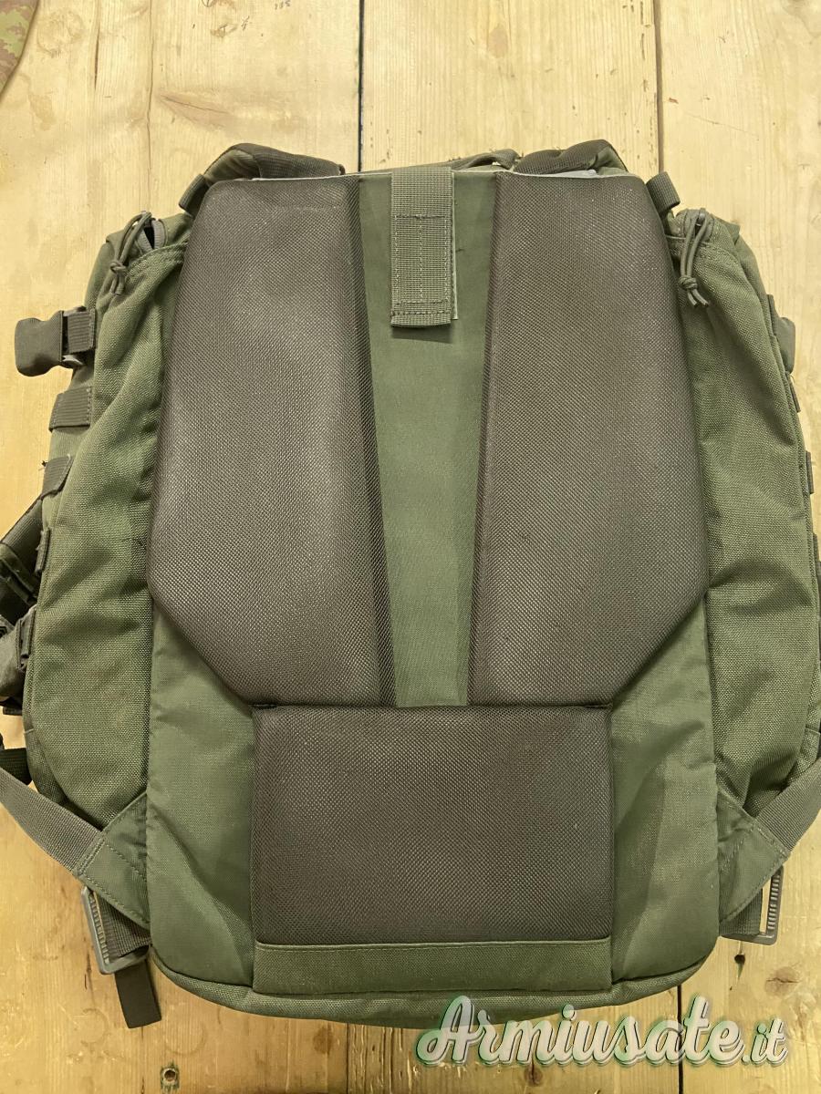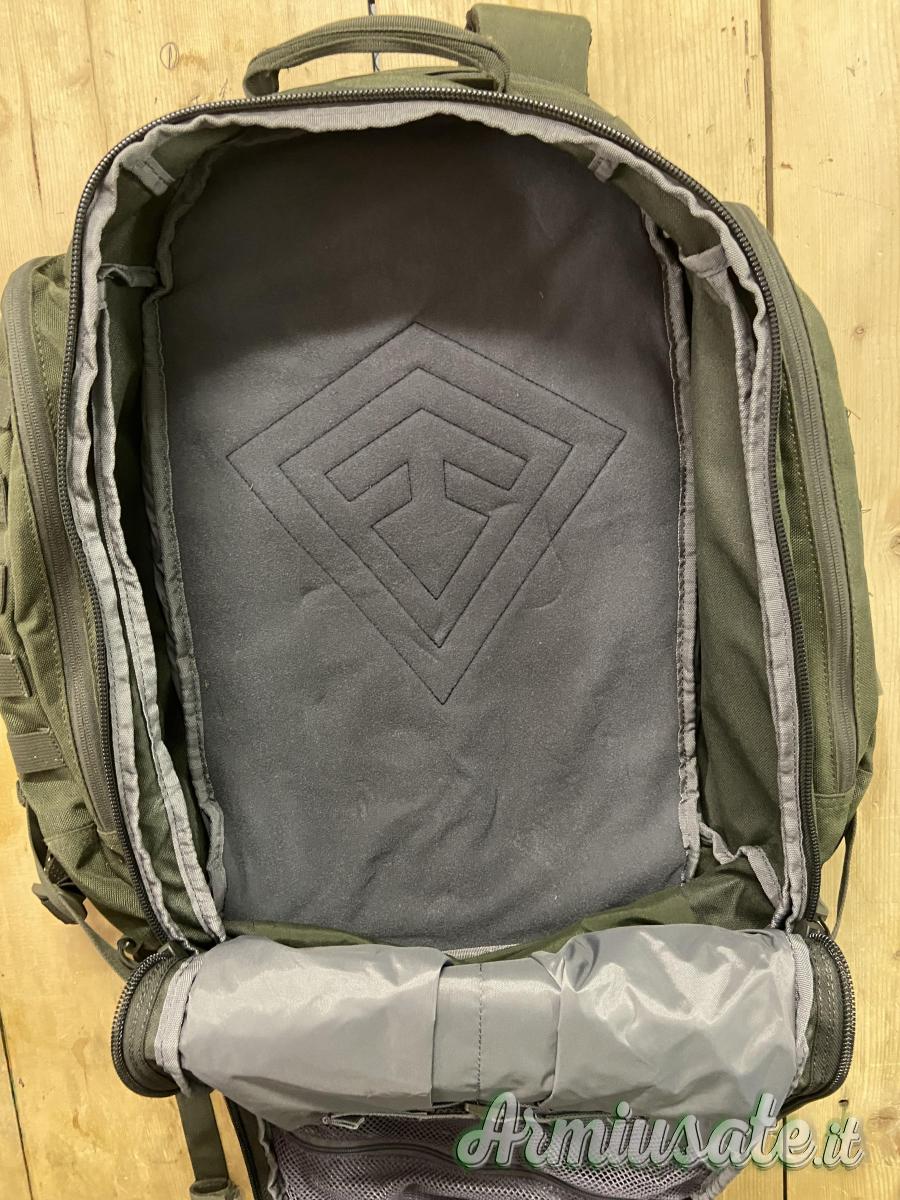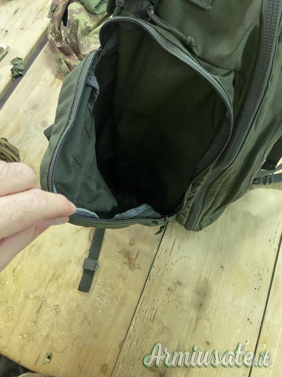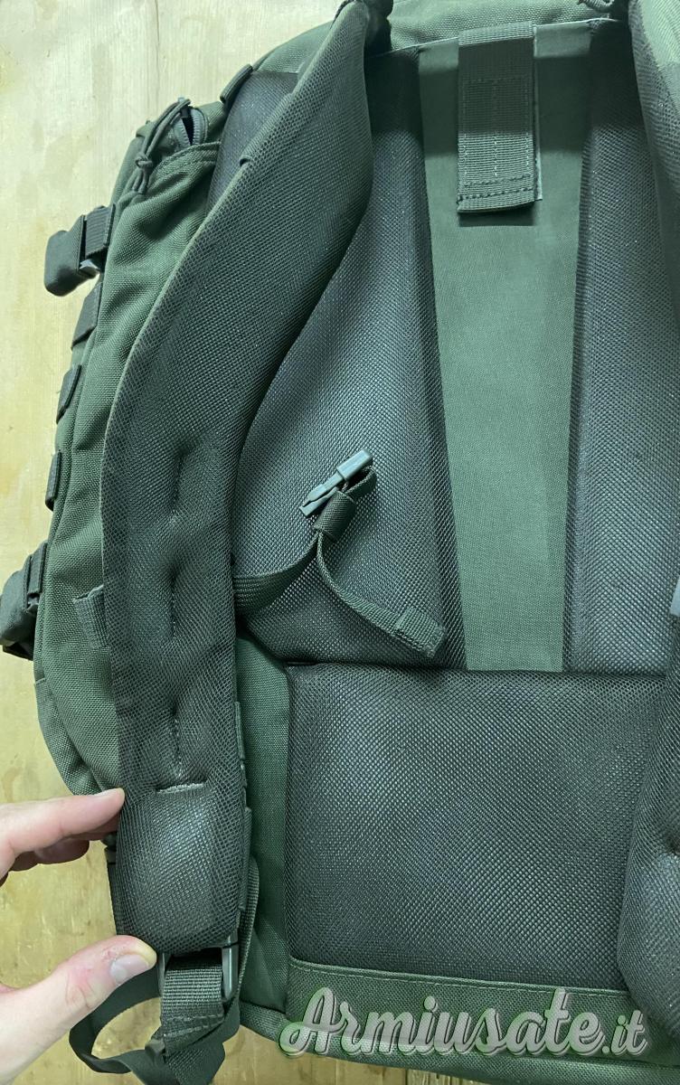 Lo zaino è dotato di sistema Hook & Hang Thru™ che ci permette di trasportare nella parte posteriore oggetti di dimensioni maggiori che possiamo far passare attraverso il compartimento che è proprio attaccato all'imbottitura della schiena.(Sacca porta fucile) Questo compartimento è dotato di zip sopra, sotto e include due ganci all'interno. Cucitura effettuata con nylon sullo spallaccio come in foto