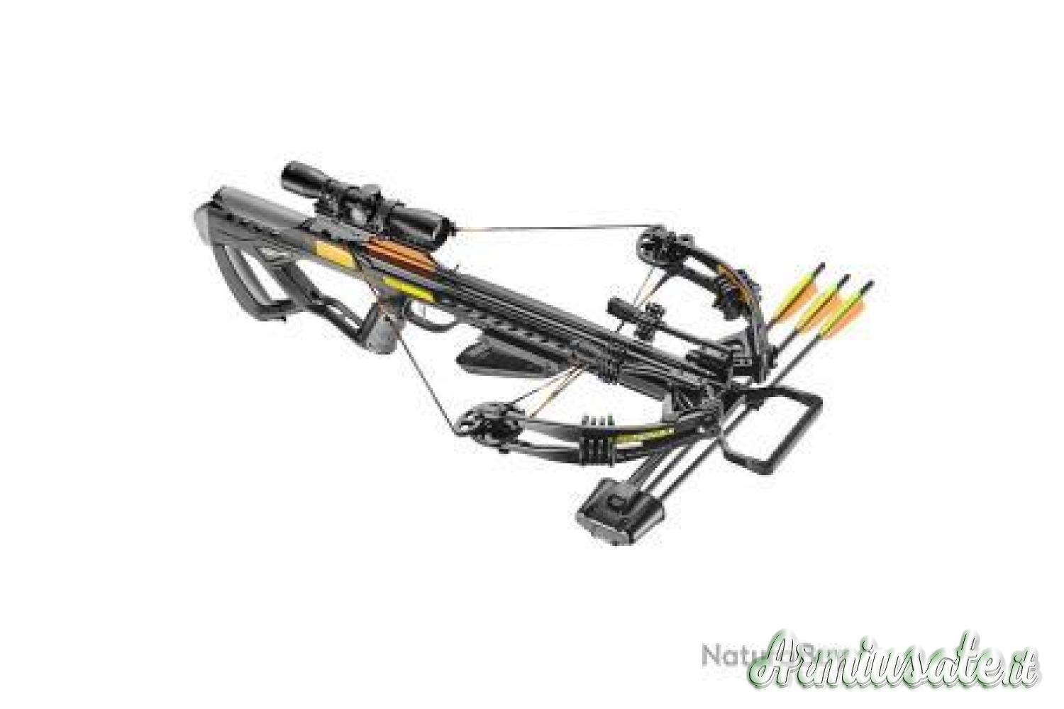 Il lacrosse rinforzato e leggero. Arco a nastro per aumentare la corsa e la velocità. Rilassamento spostato in avanti: arco a nodo. Sicurezza anti-sparatura secca. Corpo in alluminio e composito. Ferroviario tipo Picatinny per montaggio ottico. Fornito con una lunetta 4x32, una corda finta, cera per corde, un'acacia, 2 ammortizzatori per corde e 3 tratti da 20' al.