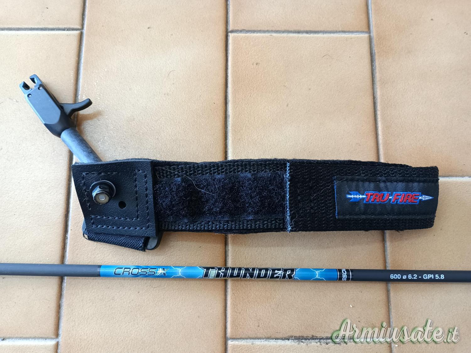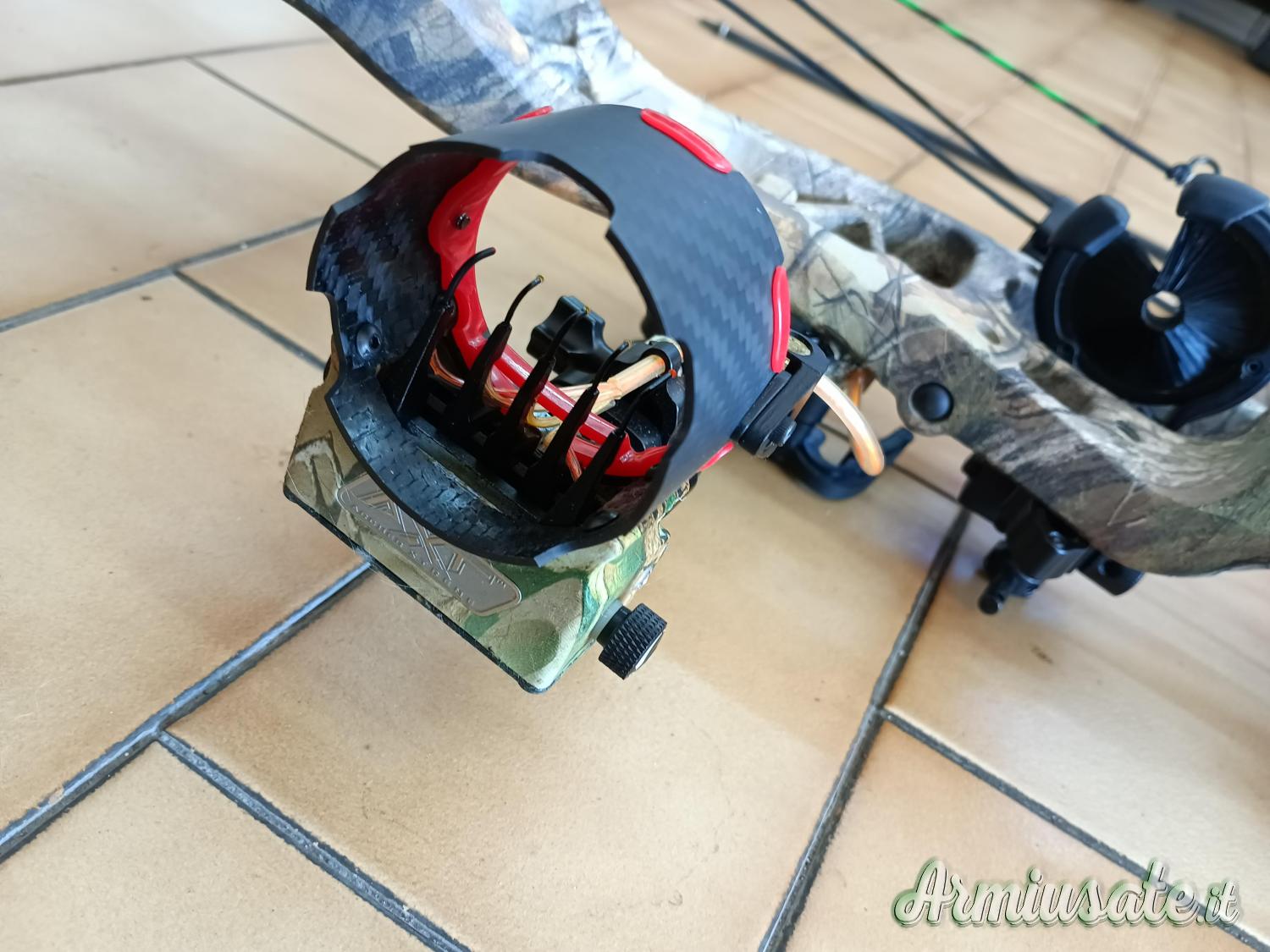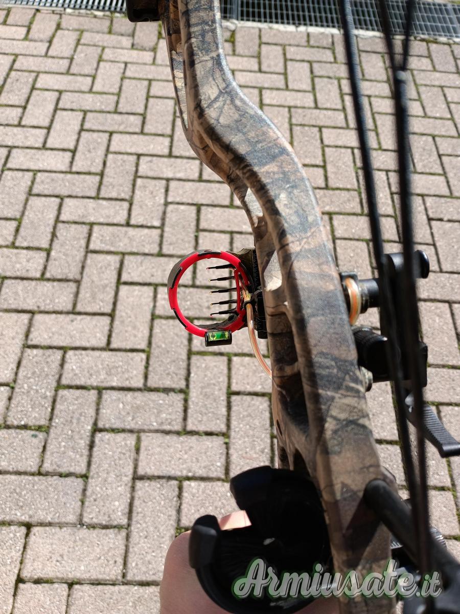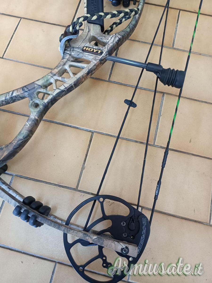 Arco Hoyt Compound 65lb da caccia per destri, riser mimetico in magnesio, flettenti mimetici, corde nuove, rest a biscottino, mirino ATX 5 pin fibra ottica in carbonio, dragona, sgancio meccanico, parabraccio.