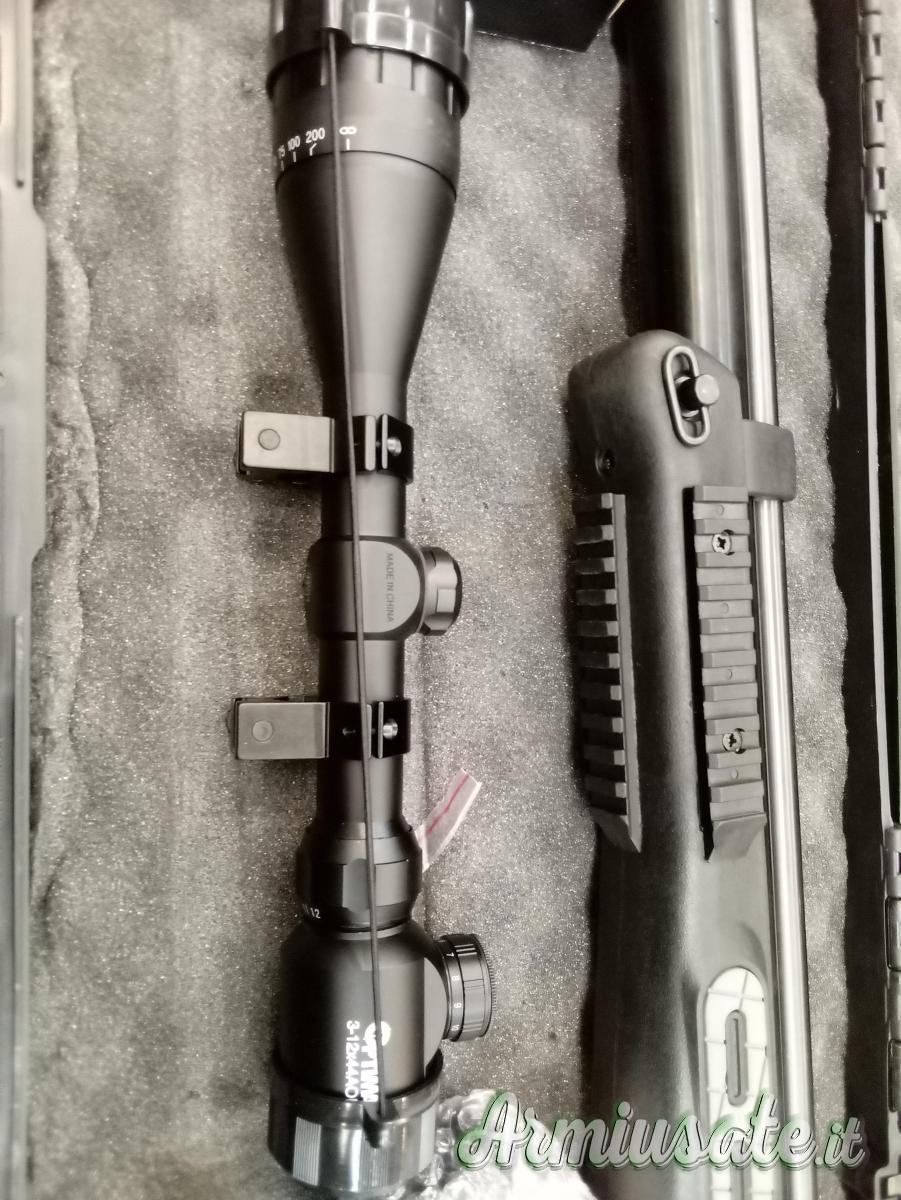 Ricca dotazione di accessori, comprendente ottica 4-12x44 con correttore di parallasse e reticolo illuminato tipo mil dot; torcia tattica a led con switch remoto, bipiede, cinghia di trasporto, manuale di istruzioni e valigia rigida.