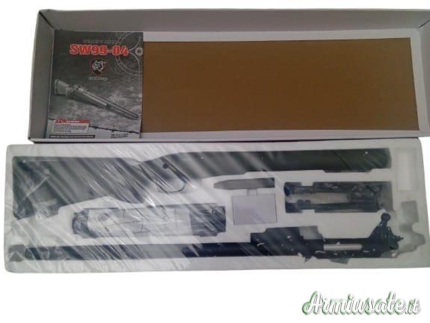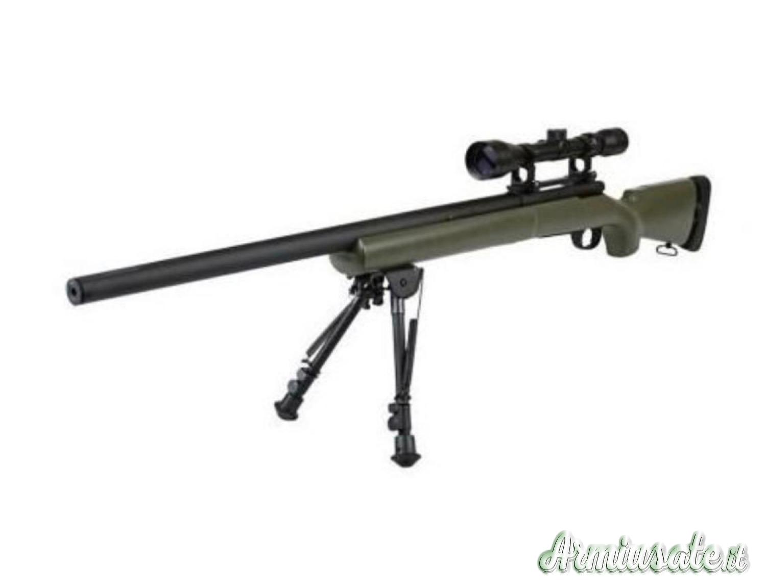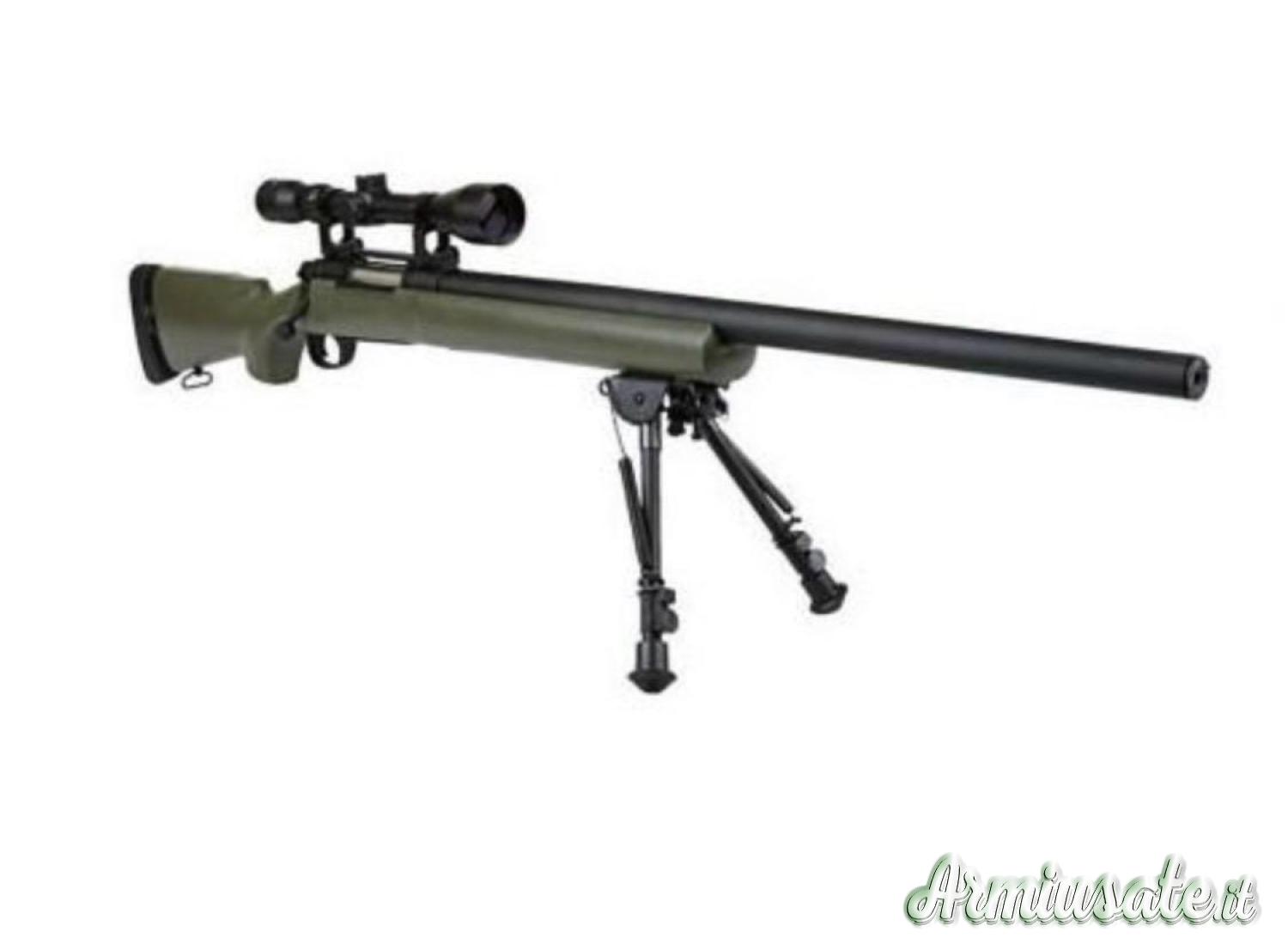 M24 con Hop up regolabile e propulsione a Molla, energia di ~1.6 Joule e una potenza di ~420 FPS, tiri potenti e precisi, grazie anche al calibro di 6mm. La capacità del caricatore è di 30 colpi. Le modalità di scatto sono Sicurezza / Semiautomatico, con un Filo per silenziatore Specifico incluso. Peso 3 kg, lunghezza 1104 mm, colore verde. Mai usato in scatola originale incartata.