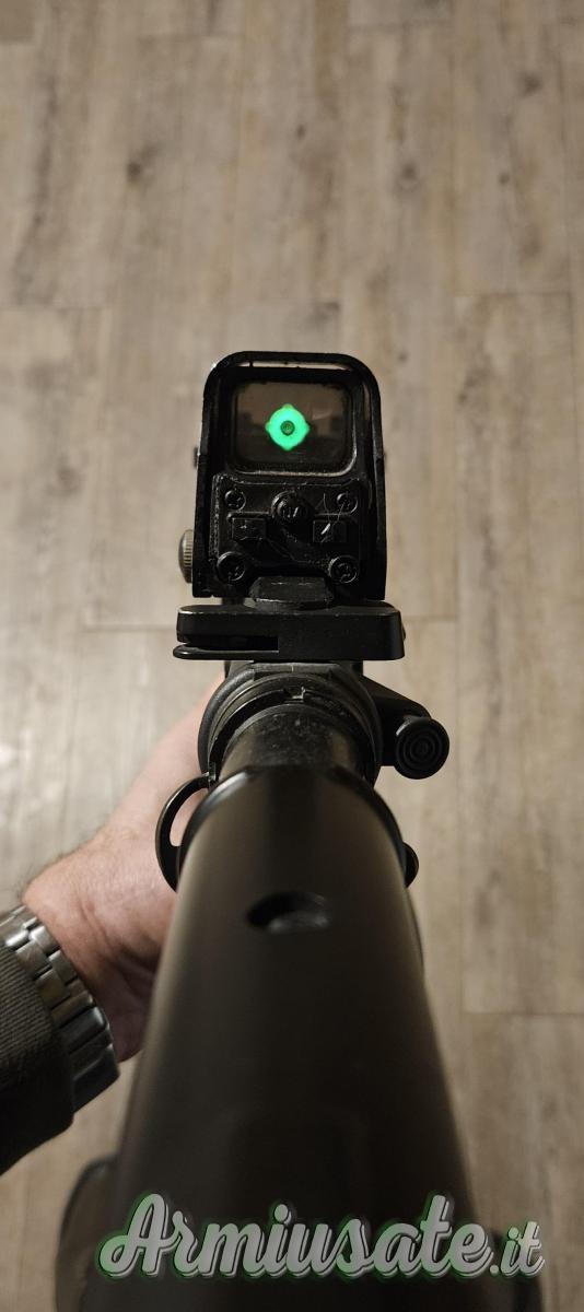 Fucile/mitragliatore con selettore di sparo semi/full auto. Dotato di silenziatore, mirino elettronico, cinghia, 2 caricatori, caricatore rapido di pallini, batteria con carica batteria, calcio regolabile e valigetta
