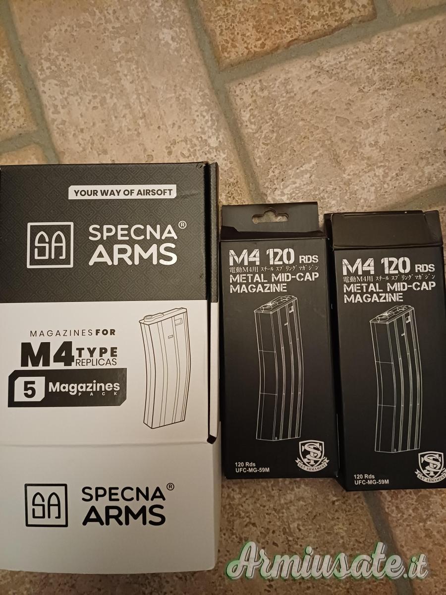 Se interessati aggiungendo 30 euro al prezzo totale vendo insieme anche set di caricatori monofilari mid-cap 120 pallini specna arms x5 (in abs) e due caricatori monofilari mid-cap 120 pallini ufc (in metallo).