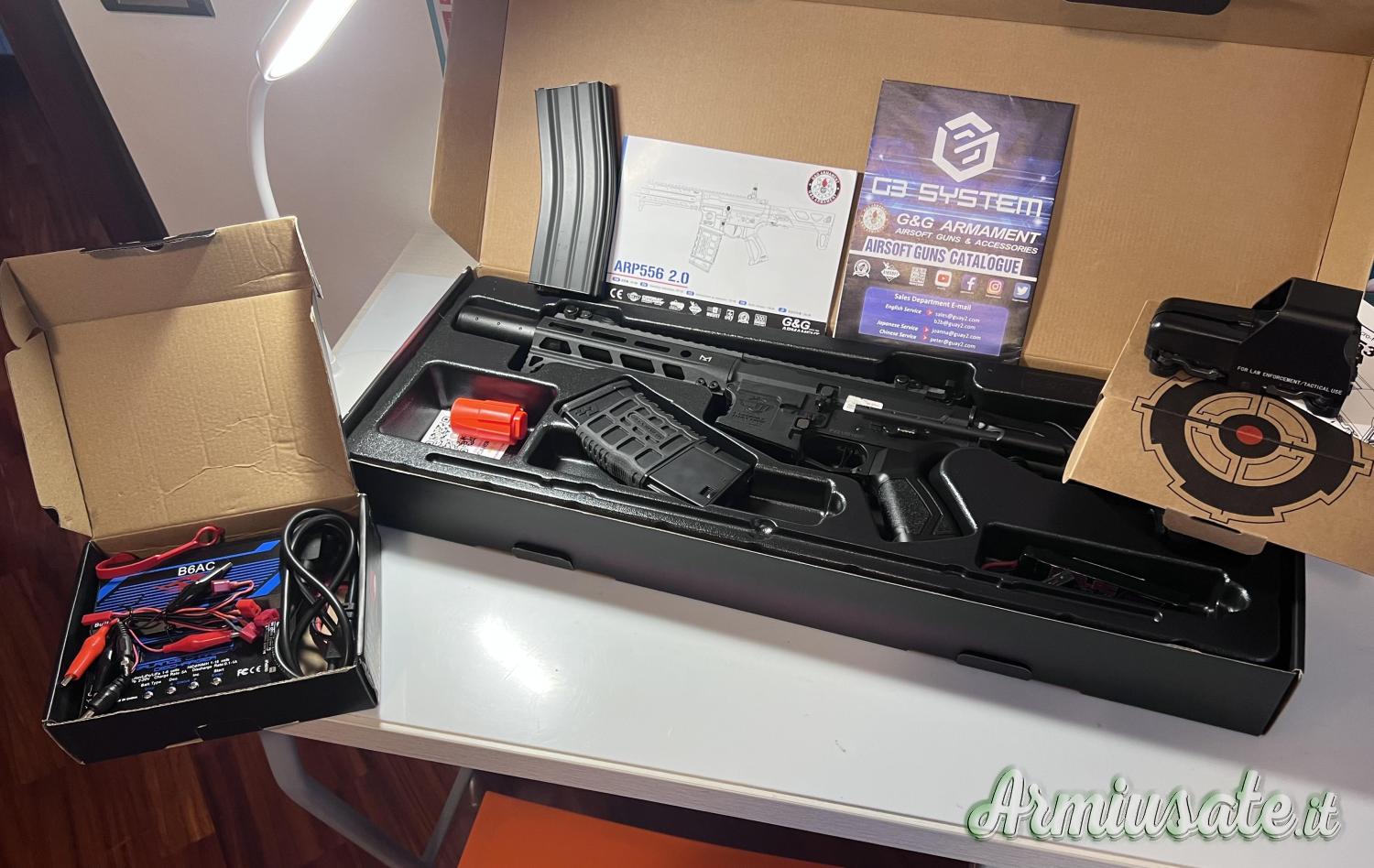 Kit completo Softair fucile G&G ARP 556 2.0 completo di batteria, carica batterie, puntatore olografico, secondo caricatore, pari al nuovo usato 5/6 volte vendo in blocco prezzo leggermente trattabile .