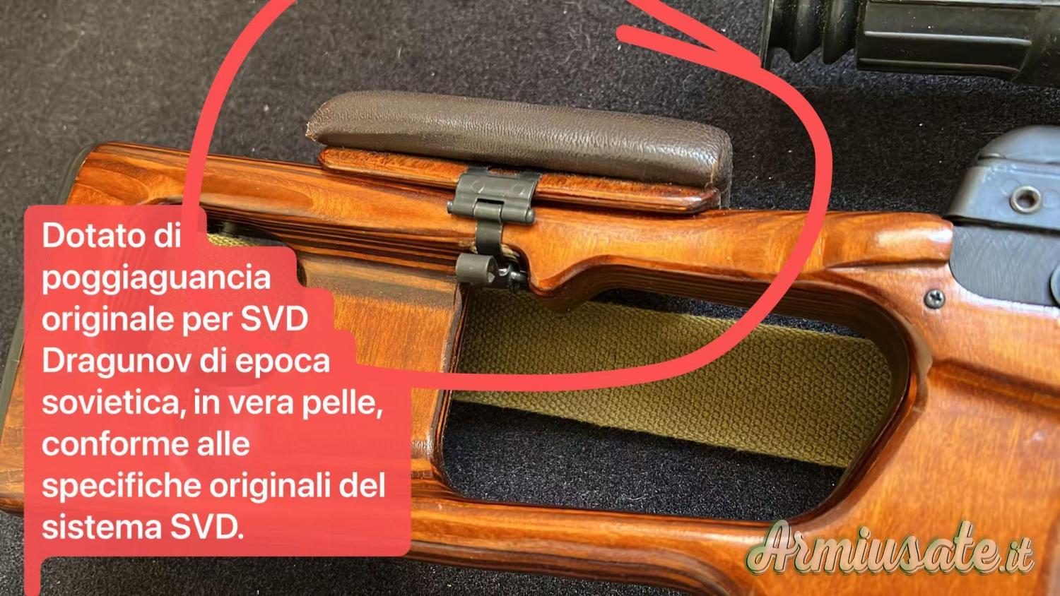 Dotato di poggiaguancia originale per SVD Dragunov di epoca sovietica, in vera pelle, conforme alle specifiche originali del sistema SVD.(300 EURO)