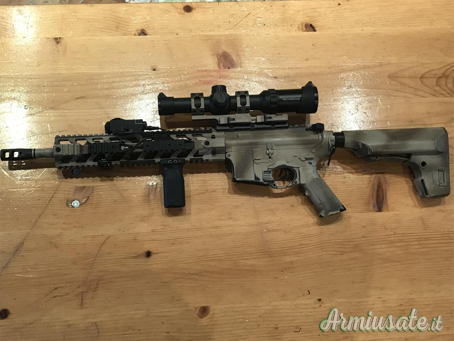 Esternamente monta compensatore, rail e calcio PTS, mini D-Ball laser rosso e IR con remoto, rialzo UTG, ottica Lpvo della VectorOptics 1-4-24 con mount 25.4/30mm Dark Earth - HM, manetta armamento maggiorata, vertical grip Magpul, poggia dito maggiorato e attacco cinghia