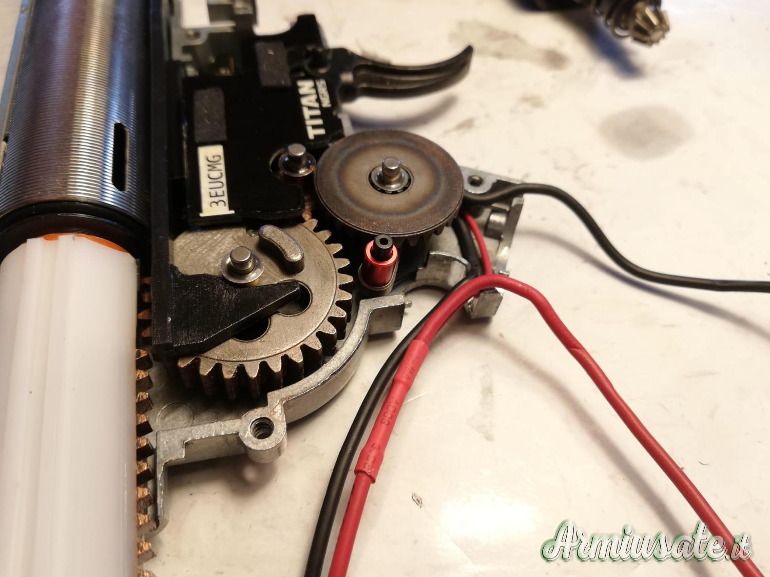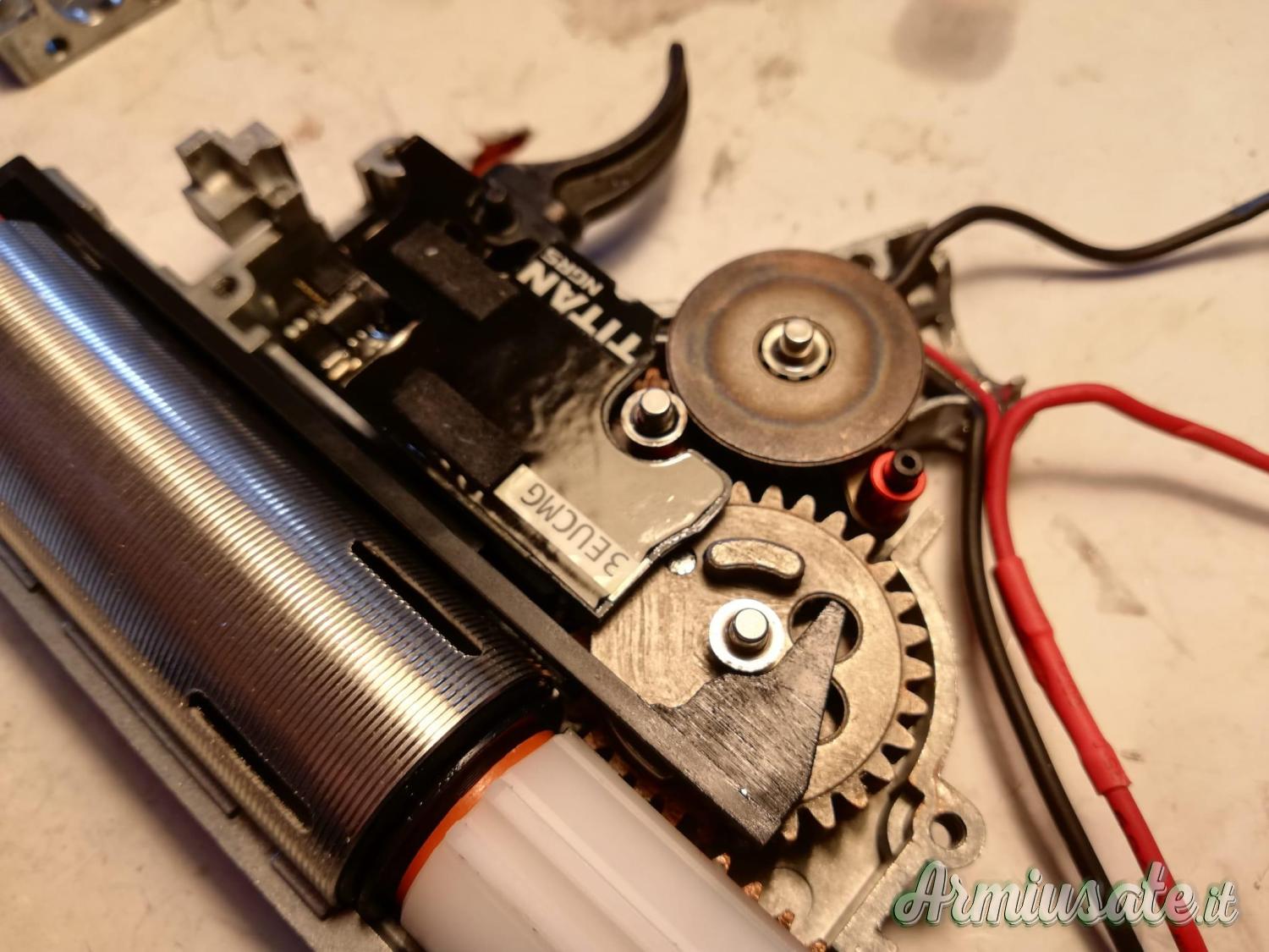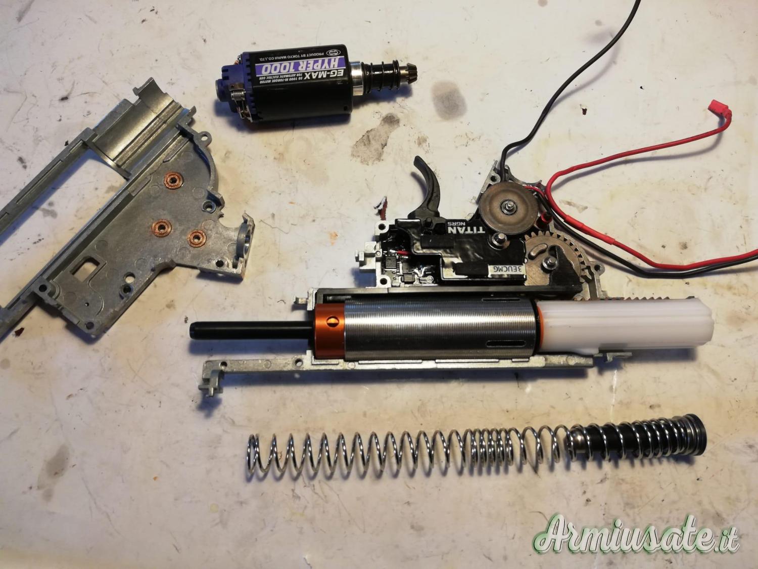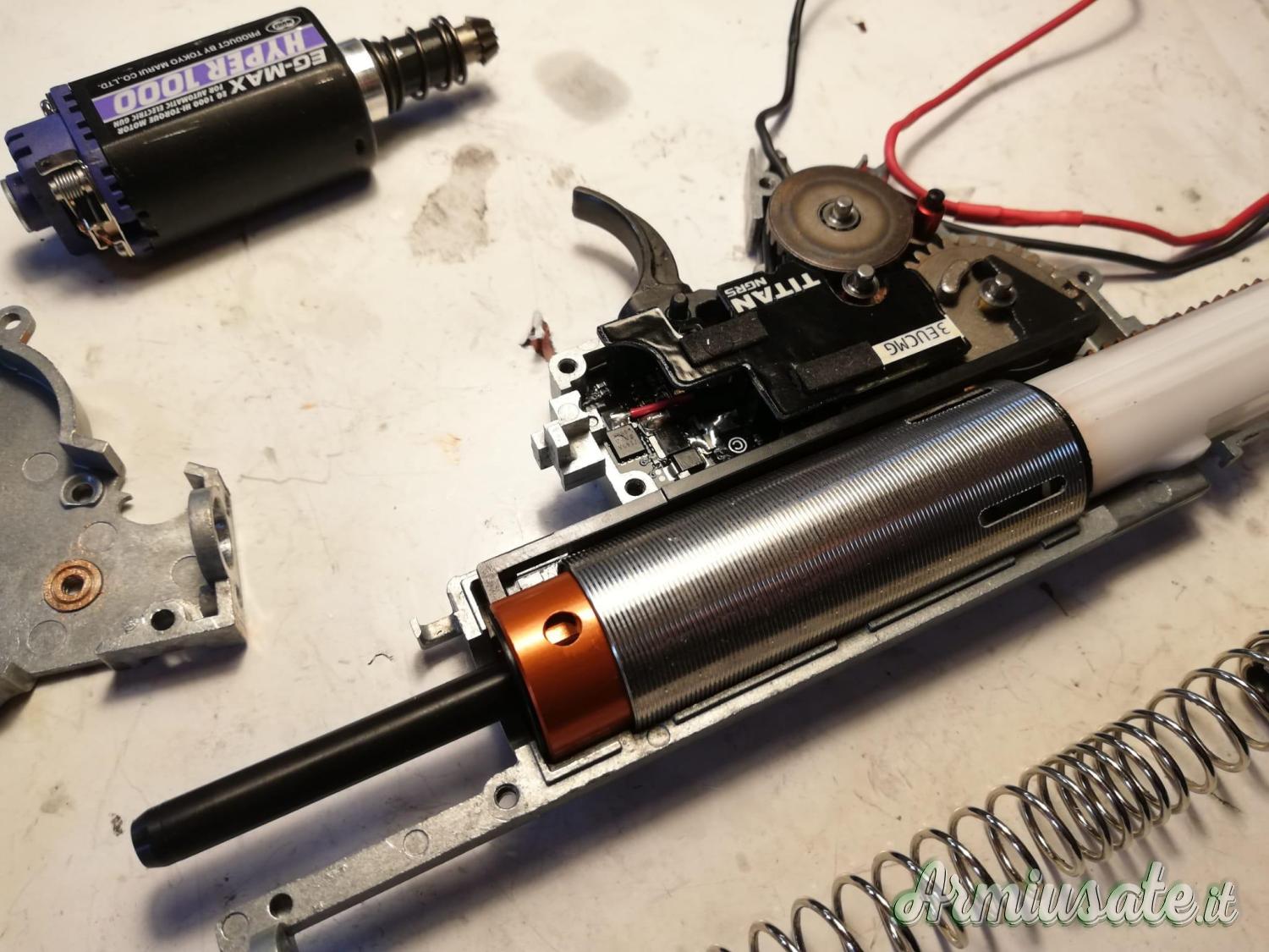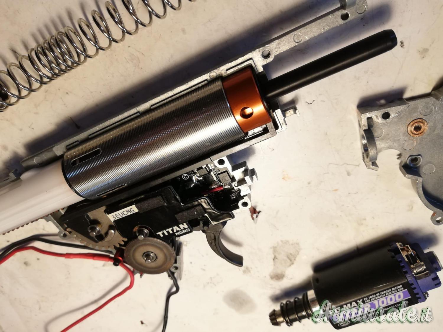 Internamente monta canna di precisione in inox Prometheus da 6.03, gruppo aria FPS, Spingi pallino Prometheus, pistone RetroArms con tutti i denti in metallo, cilindro Prometheus, ingranaggi Prometheus HI-Torque e pignone motore in inox, centralina Titan e guida molla con cuscinetto