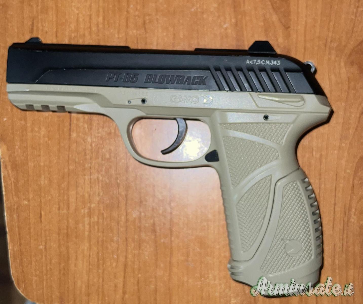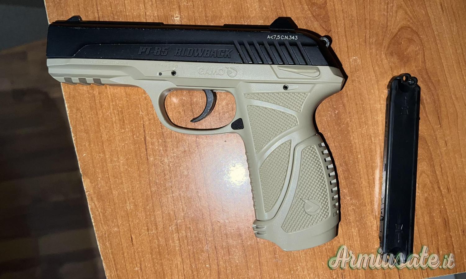 Gamo pistola PT85 Blowback CO2 in calibro 4,5mm <7,5 joule, scarrellante con caricatore a doppio tamburo.