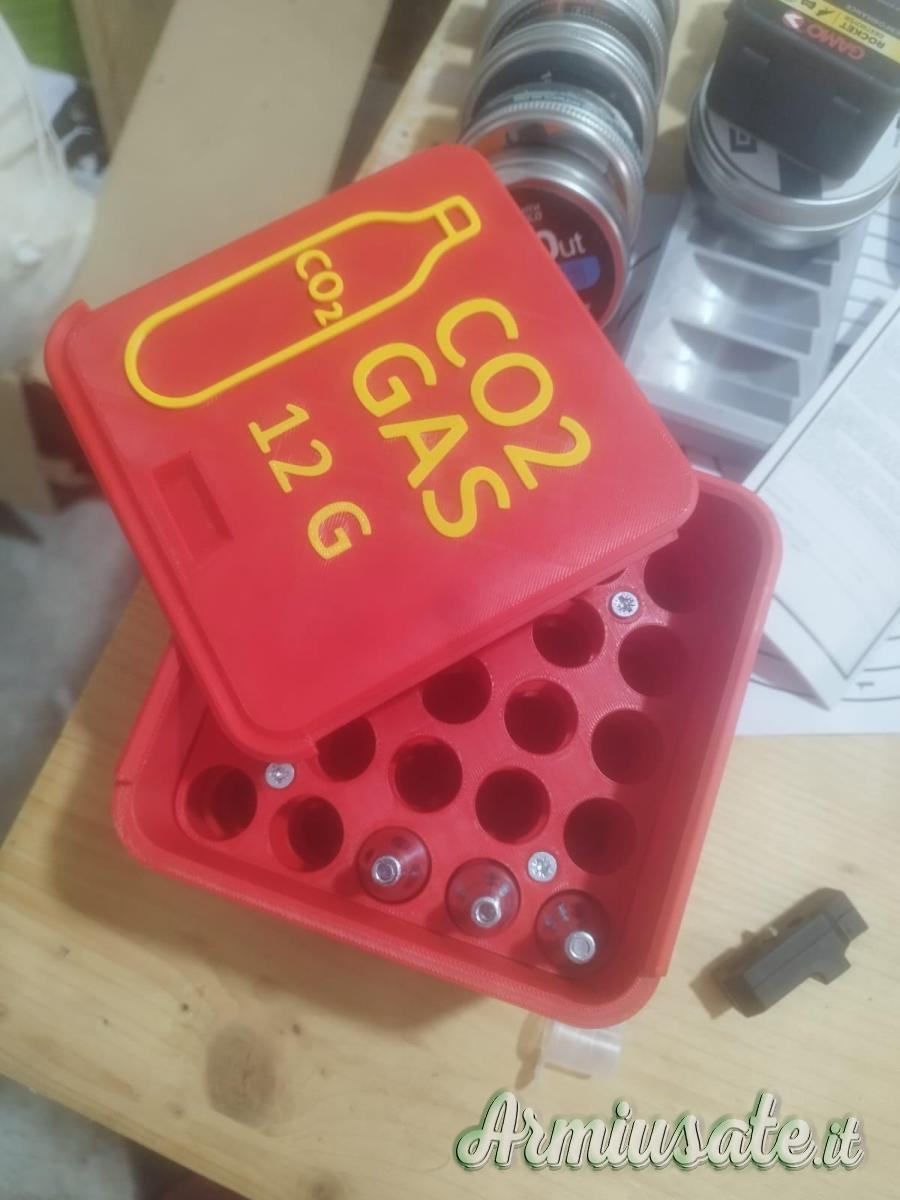 Accessori stampati in 3D: box porta-bombolette dedicato e moderatore di suono custom.I due caricatori di serie.