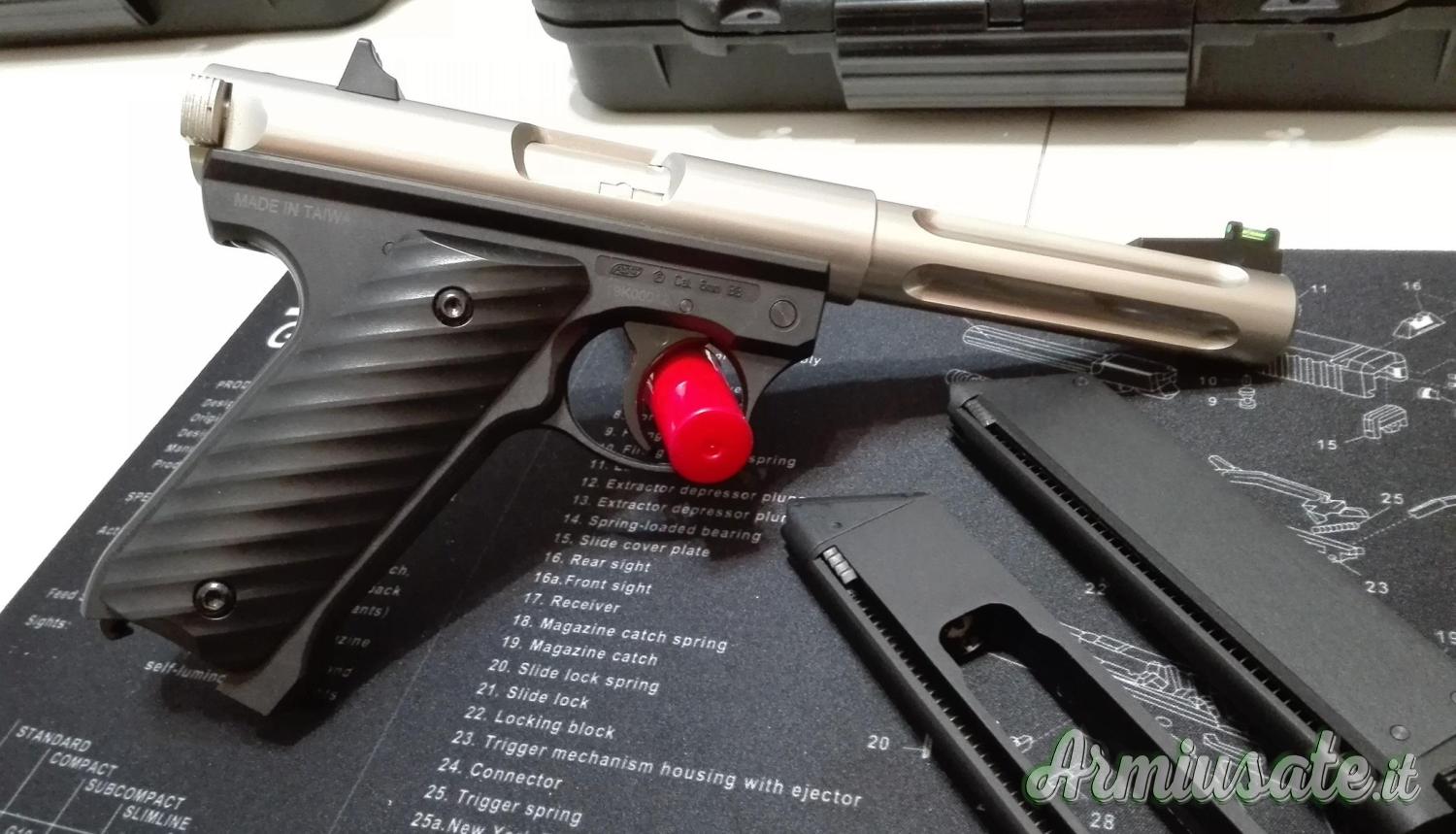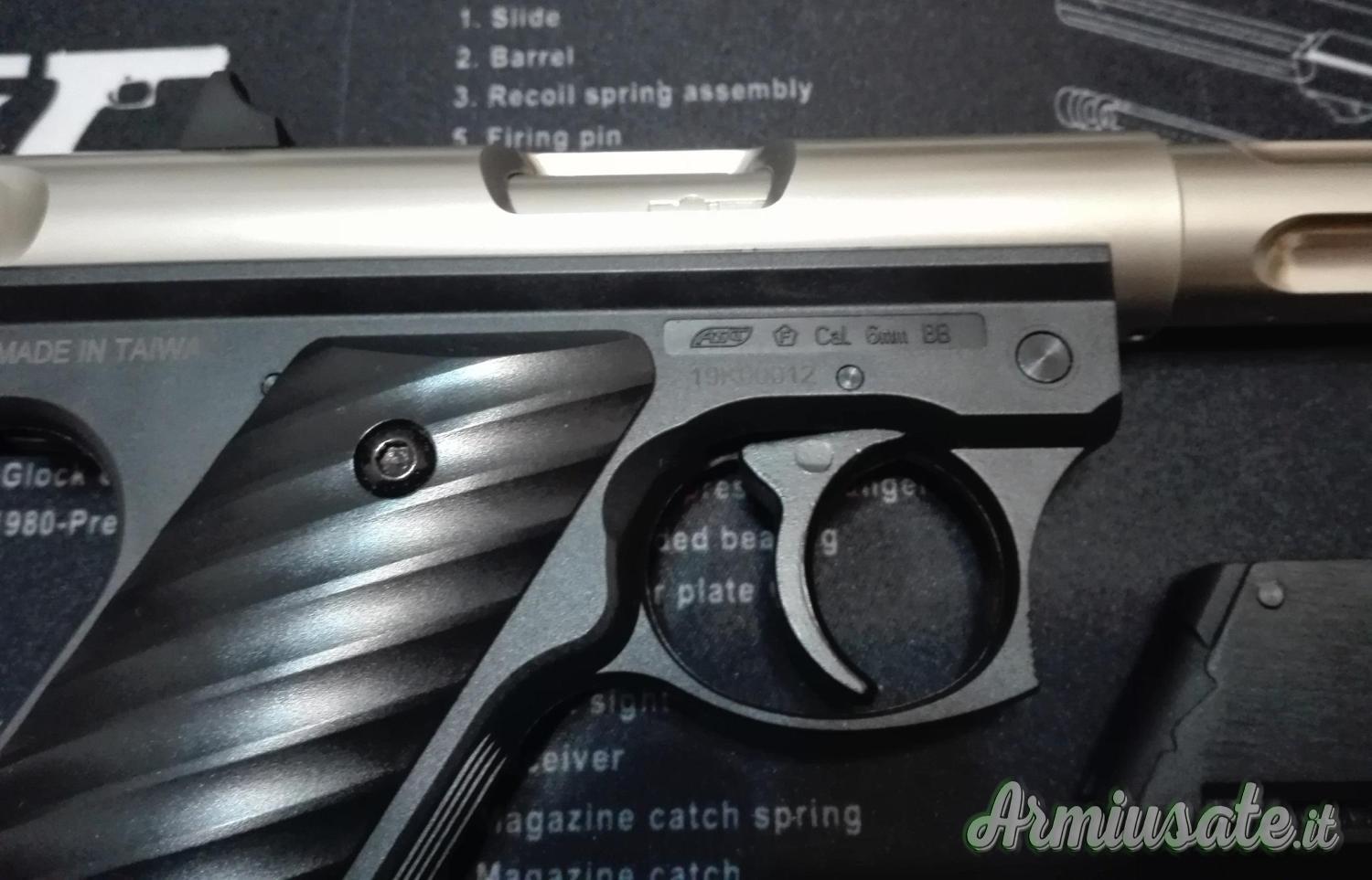 Venduta dalla ASG, la fornisco completa della sua scatola e del manuale d'uso originali e nuovi. Compreso nel prezzo anche un ulteriore caricatore a greengas oltre al suo originario a CO2.