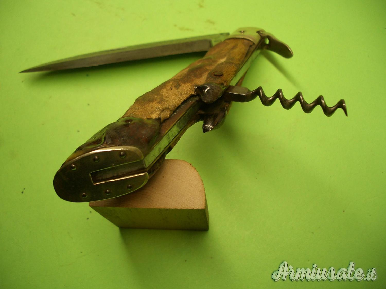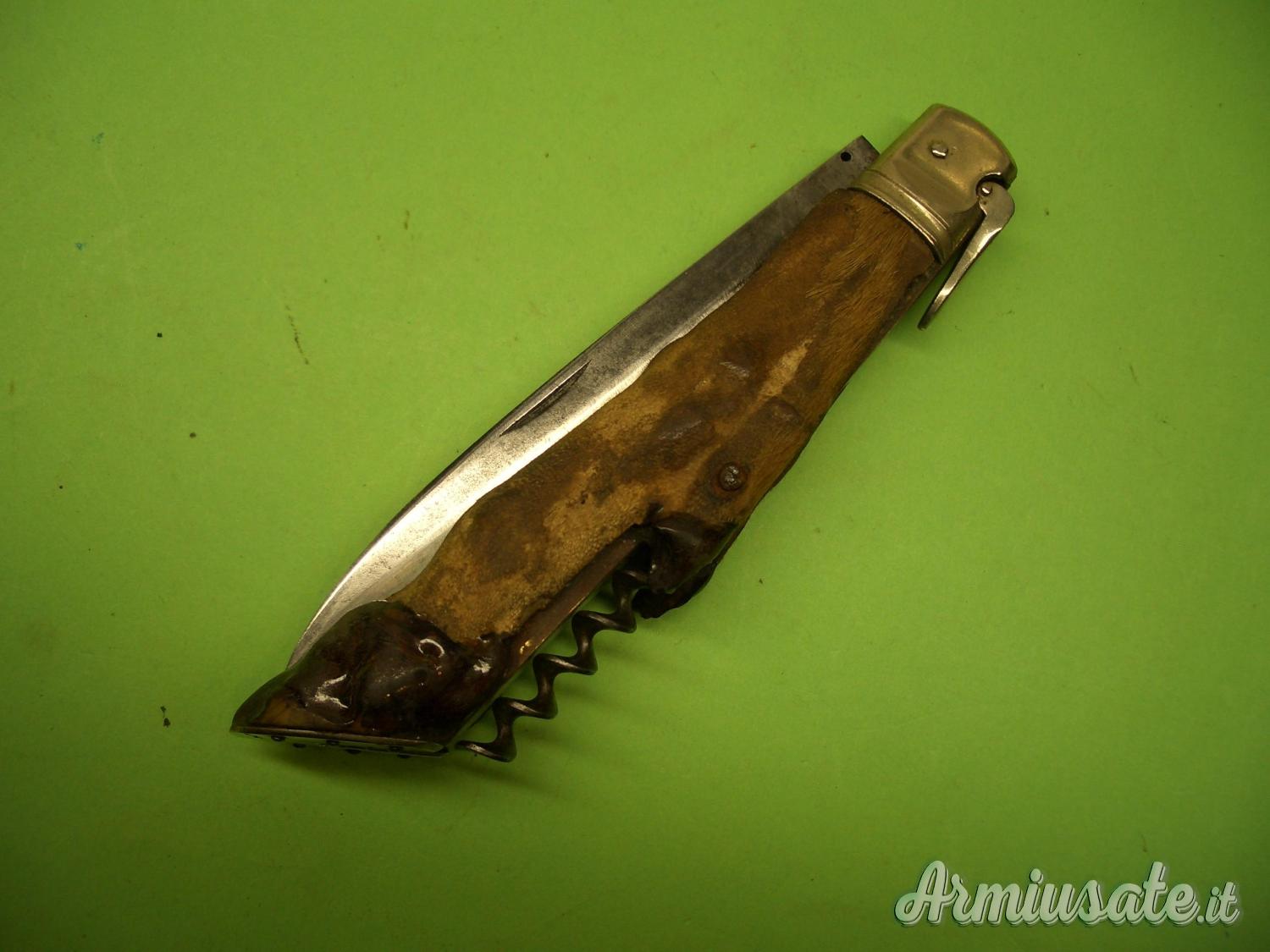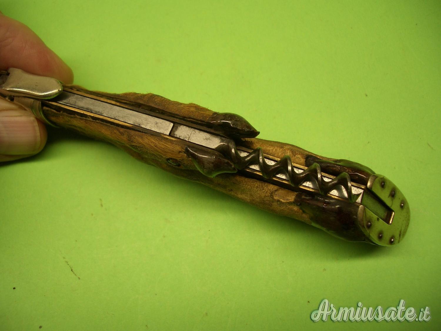 Impugnatura con guancette ricavate da una zampetta di Capriolo, ottimamente “ferrate” sullo zoccolo in Alpacca. Le testine e la leva sblocco lama sono anch’esse in Alpacca. Coltello corredato di cavatappi a vermicello.