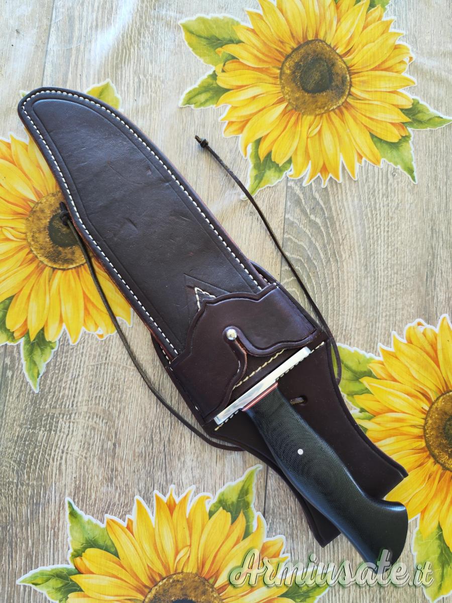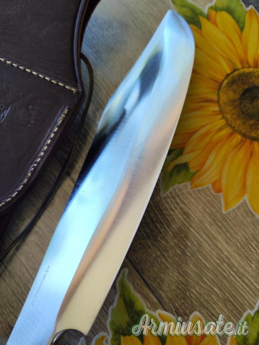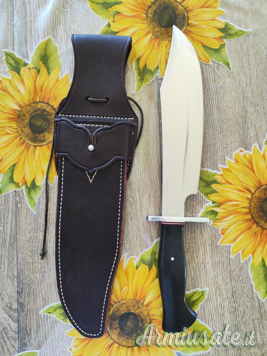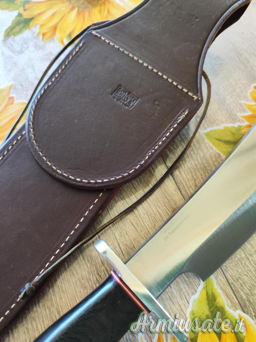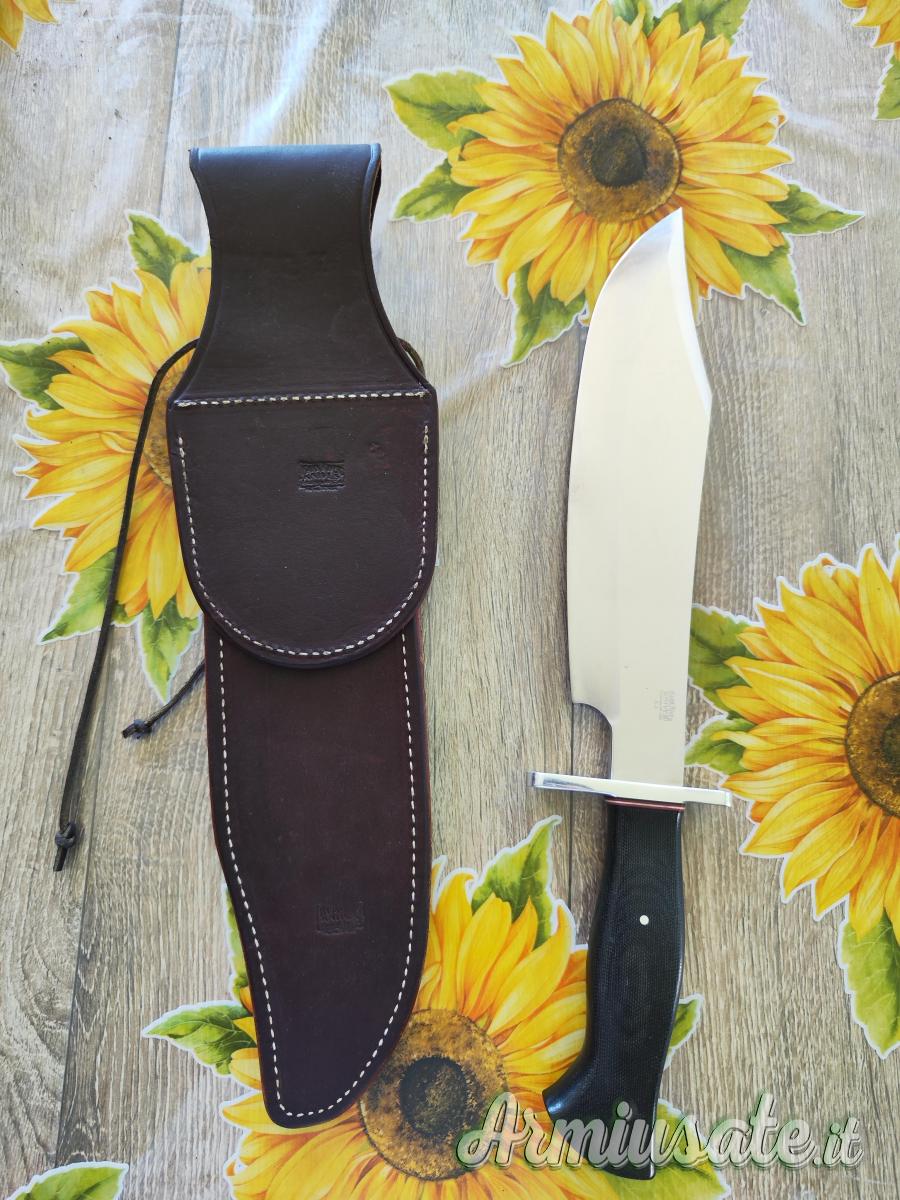 Coltello completo di fodero in pelle marrone ingrassata e impermeabilizzata, non c'è la scatola. Il coltello è stato usato e riaffilato, pertanto presenta dei segni di utilizzo sulla lama e sul bisello. Si tratta di una rara versione dello Shining Mountain Bowie (usato nel film bastardi senza gloria di Tarantino, dal personaggio interpretato da Brad Pitt) con il manico in black Canvas micarta.