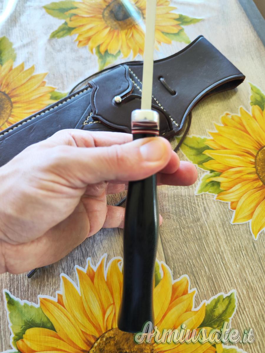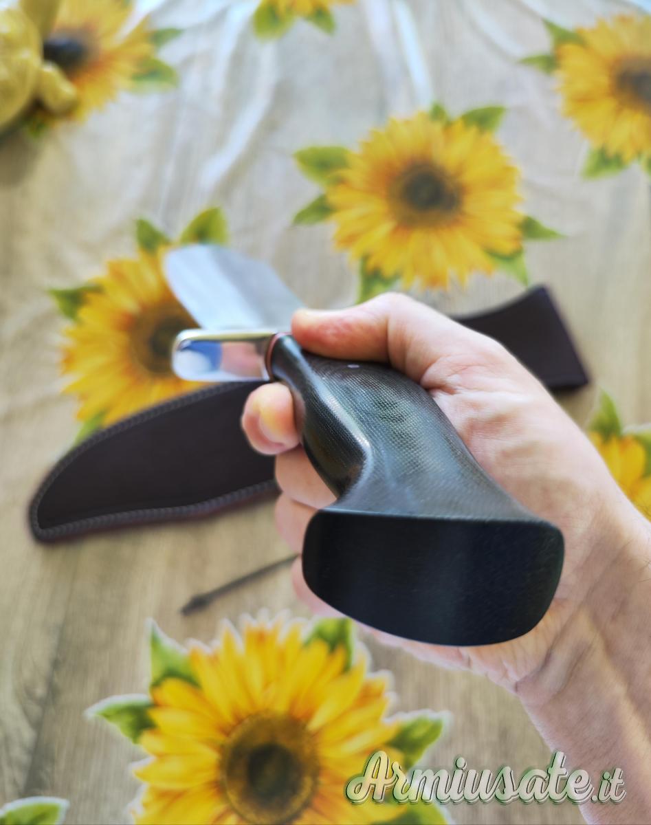 Hidden tang, doppia guardia, bisello convesso a zero, acciaio A2, 40 cm totali, 26 cm di lama, 23 cm di filo utile, 6 mm di spessore, 2,3 cm altezza del bisello, bilanciamento avanzato e peso del solo coltello di 684 grammi.