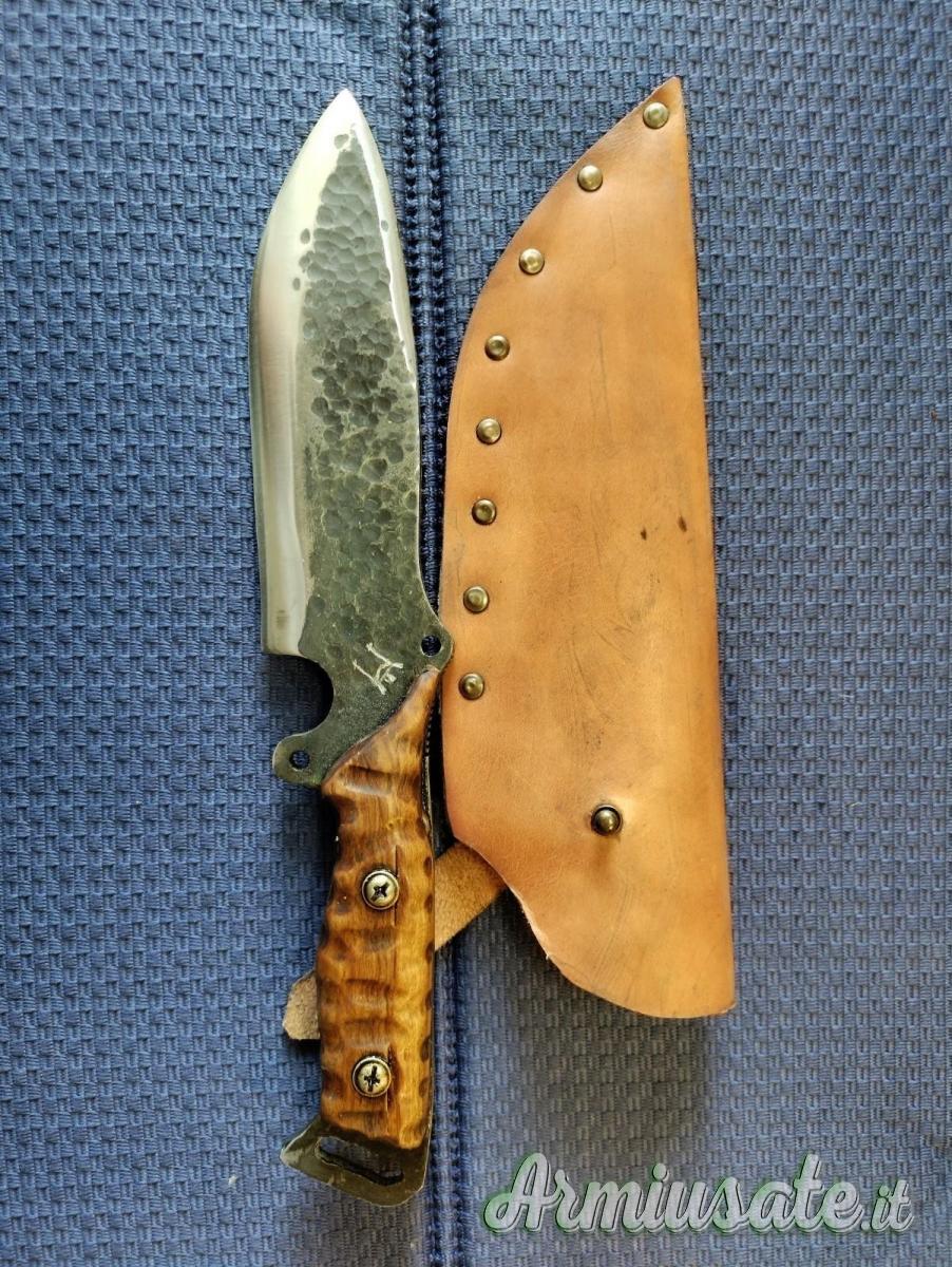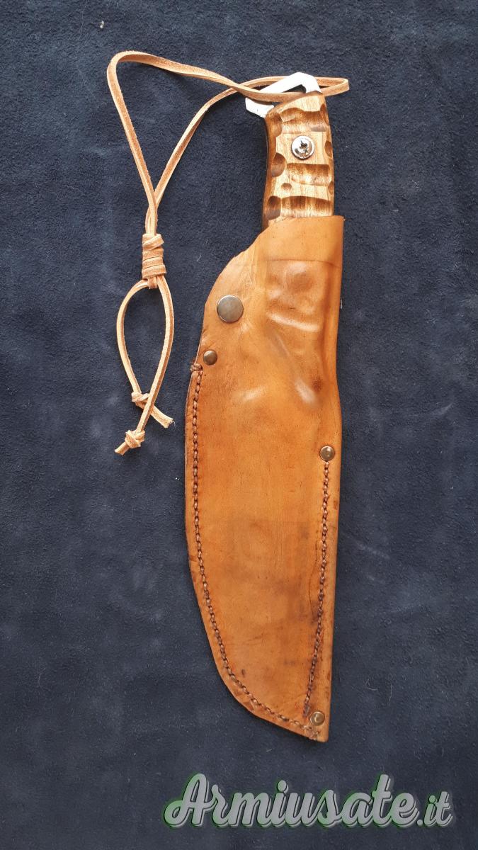 Impugnatura in legno di olivo trattato ad olio o in alternativa ebano ,osso o corno di cervo; rivetti in ottone.