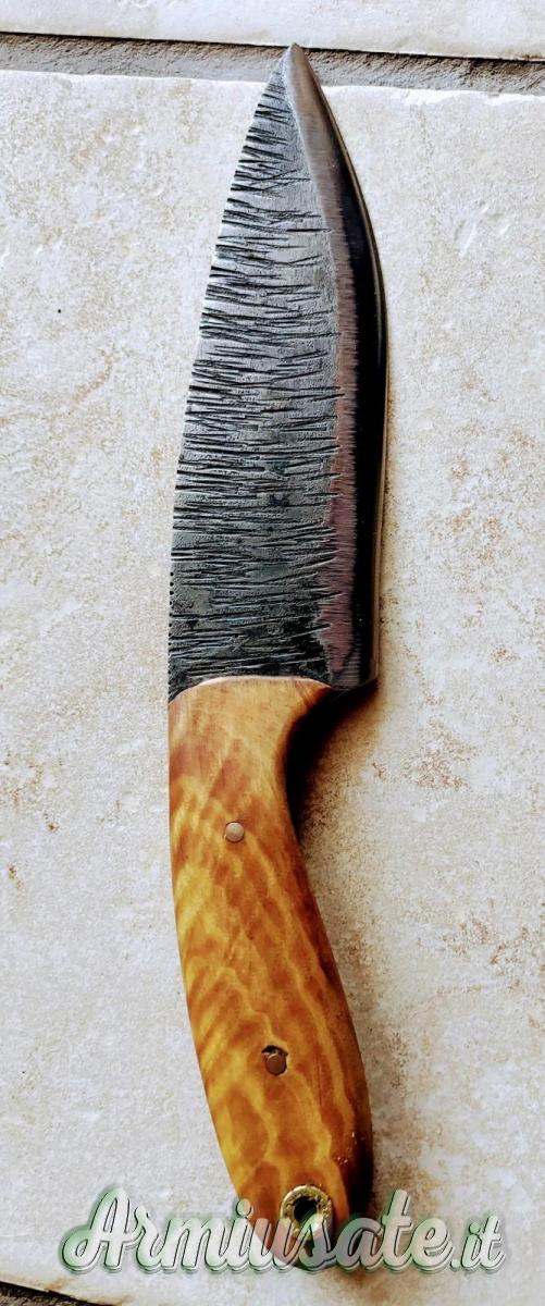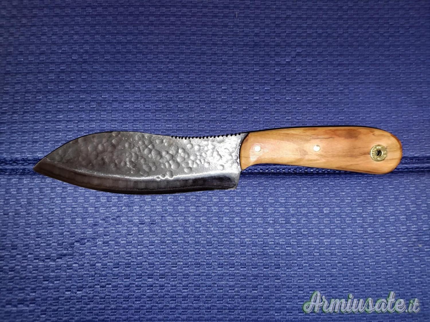 Impugnatura in legno di olivo trattato ad olio o in alternativa ebano ,osso o corno di cervo; rivetti in ottone.