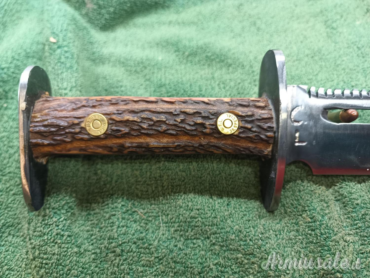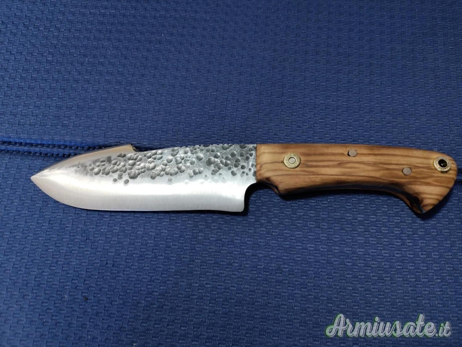 Impugnatura in legno di olivo trattato ad olio o in alternativa ebano ,osso o corno di cervo; rivetti in ottone.
