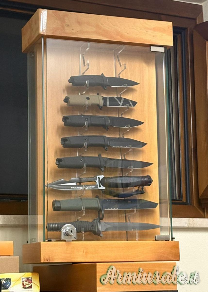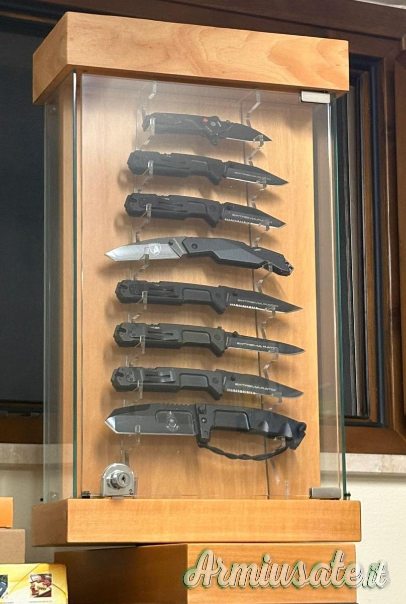 Propongo collezione di 16 coltelli fissi e chiudibili Extrema Ratio in vetrinetta girevole doppio espositore.