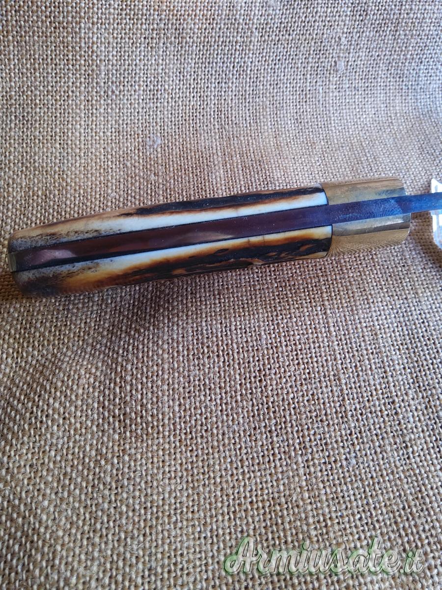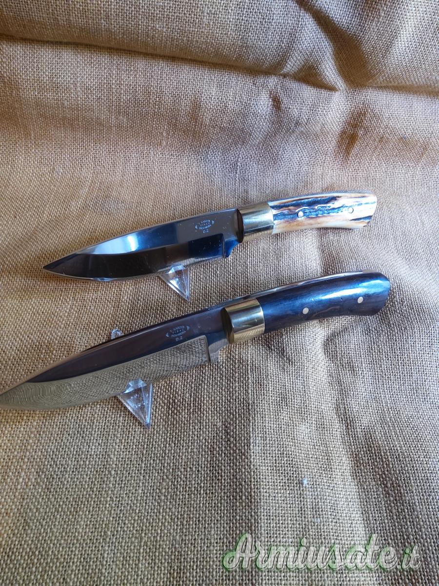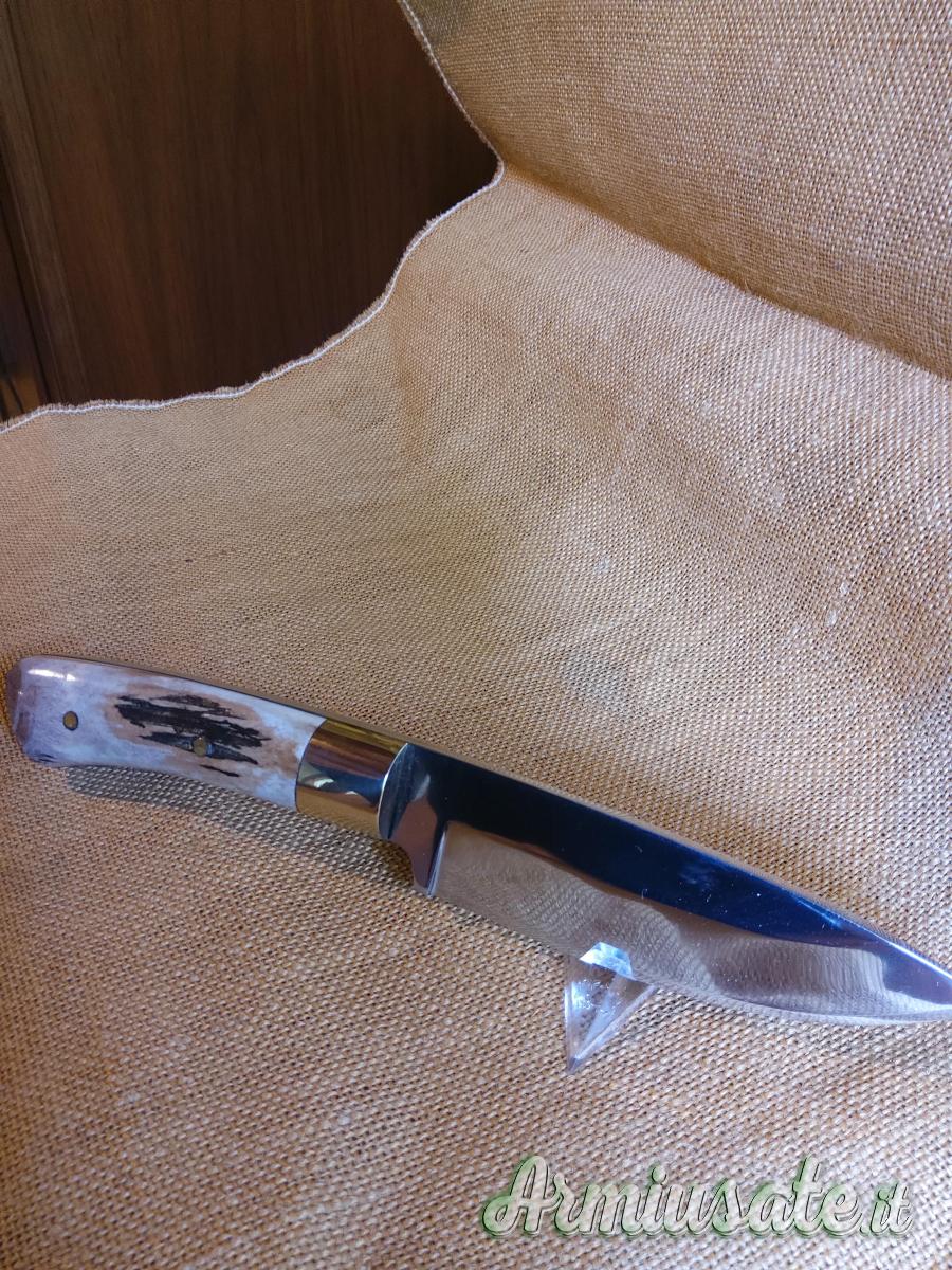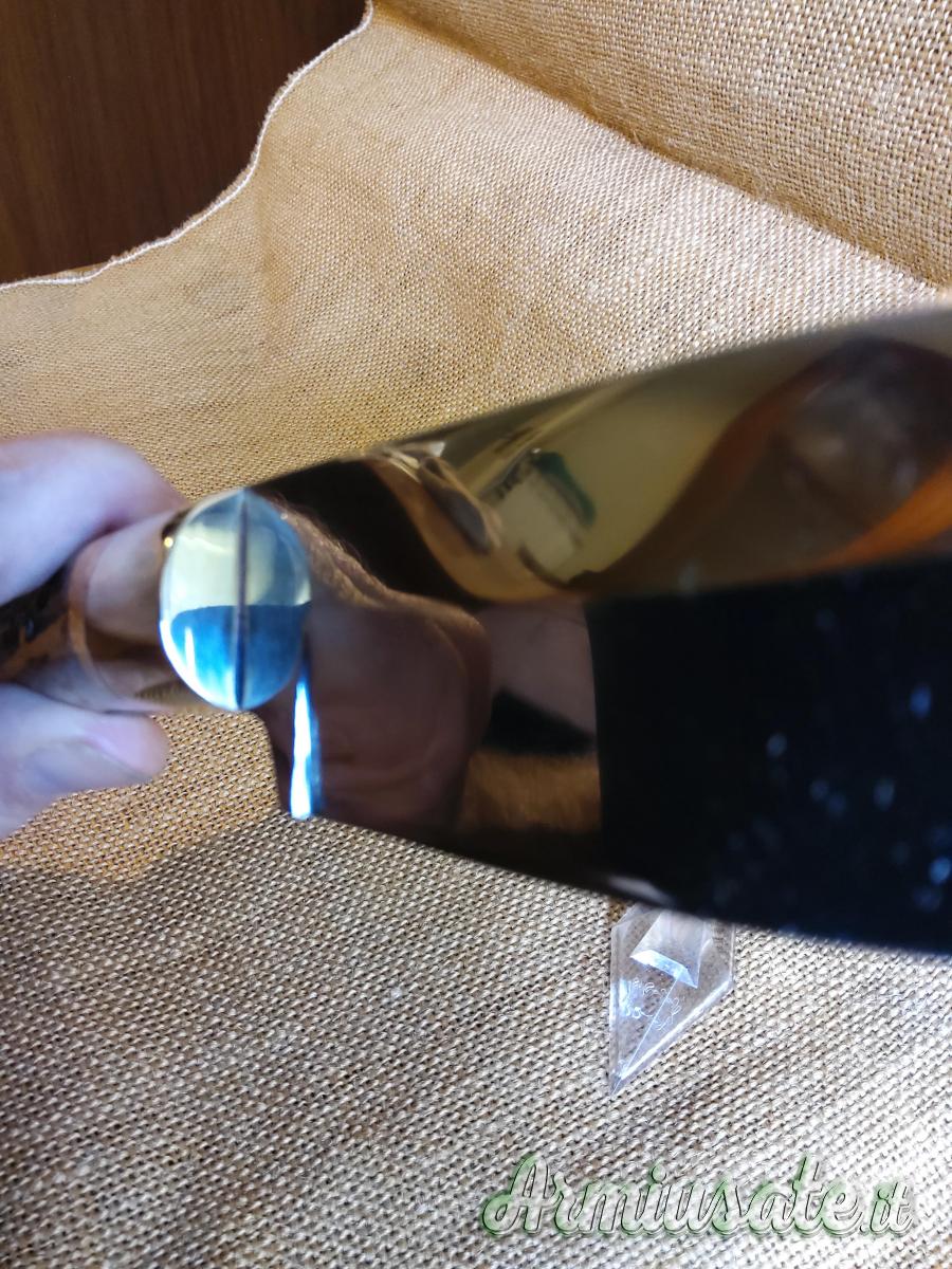 Lama full tang in acciaio D2 spessa 4 mm., lucidata a specchio. Bolster in ottone. Lunghezza cm 22. Con fodero in cuoio.