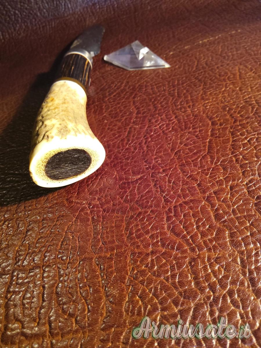 Con fodero in cuoio decorato a sbalzo.