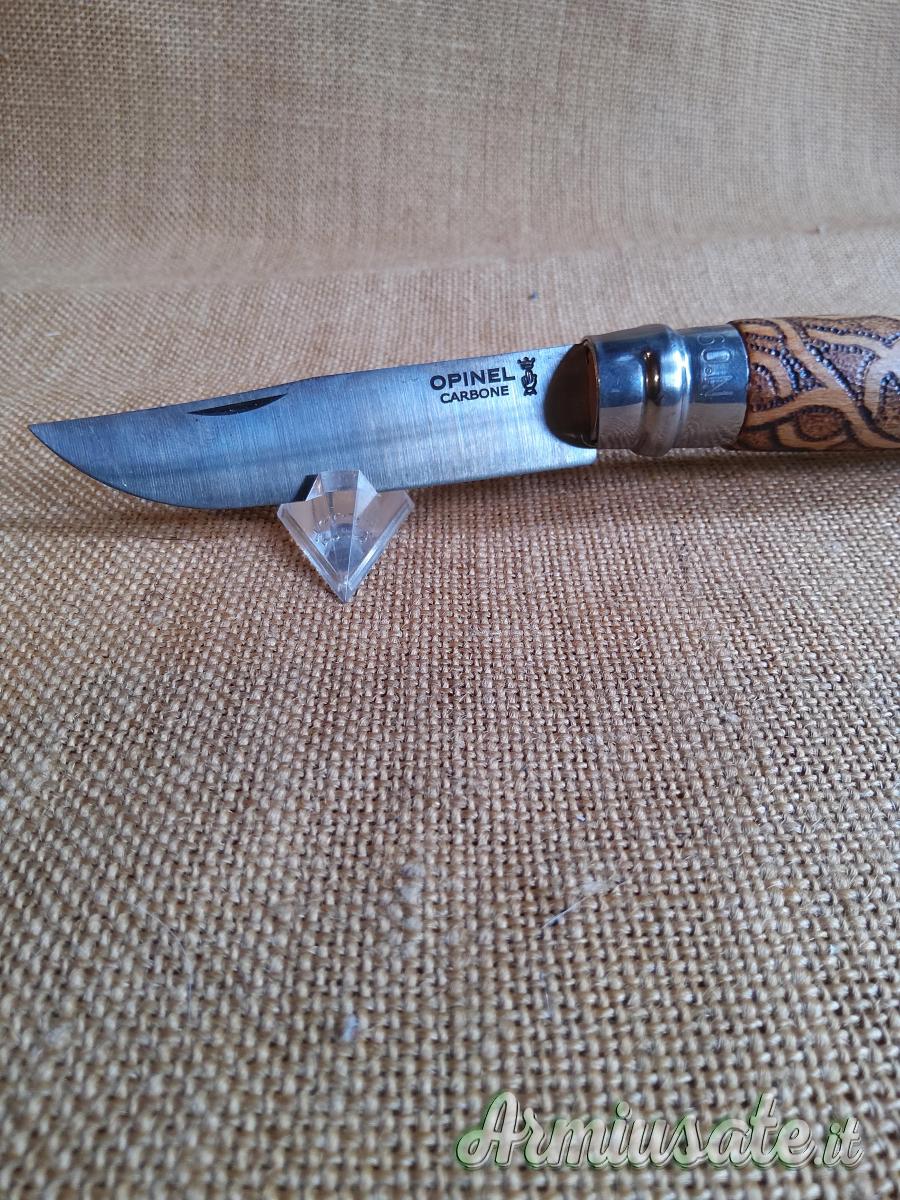 Vendo coltello Opinel nr. 9 con il manico pirografato manualmente. Lama in acciaio inox.