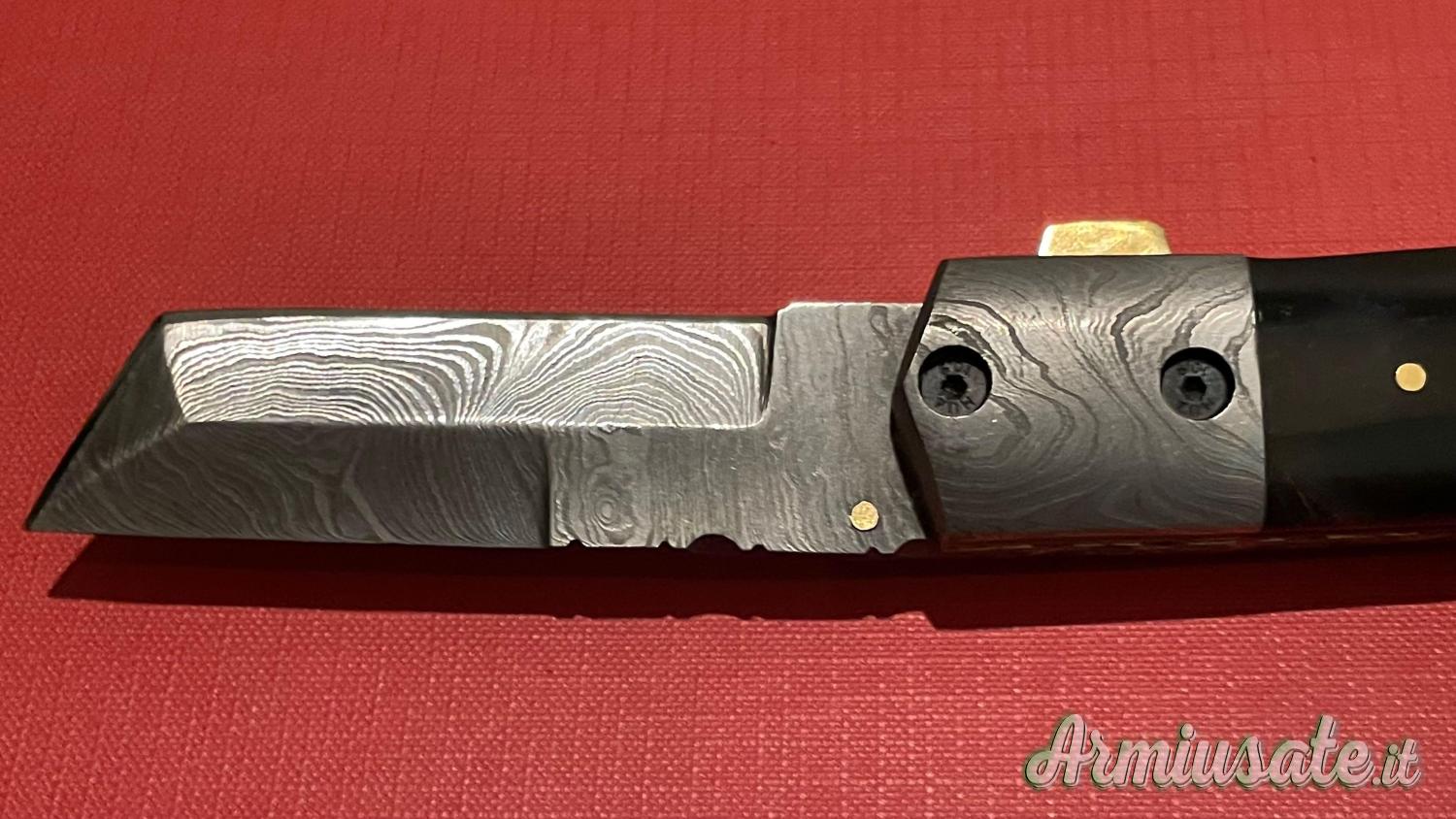 Lama : profilo American Tanto in acciaio damasco con venature ben visibili e definite.