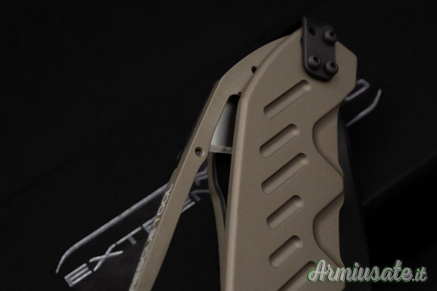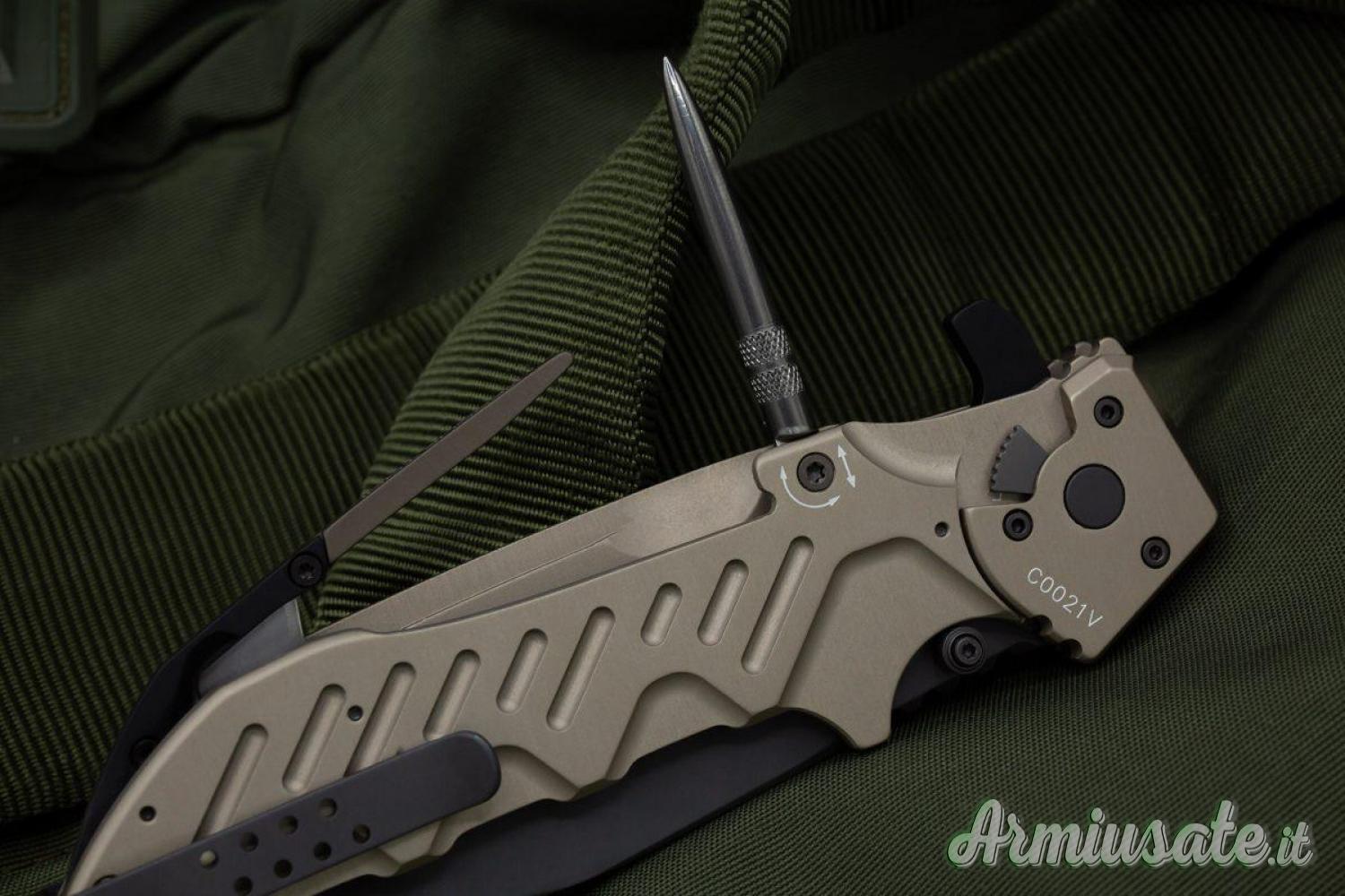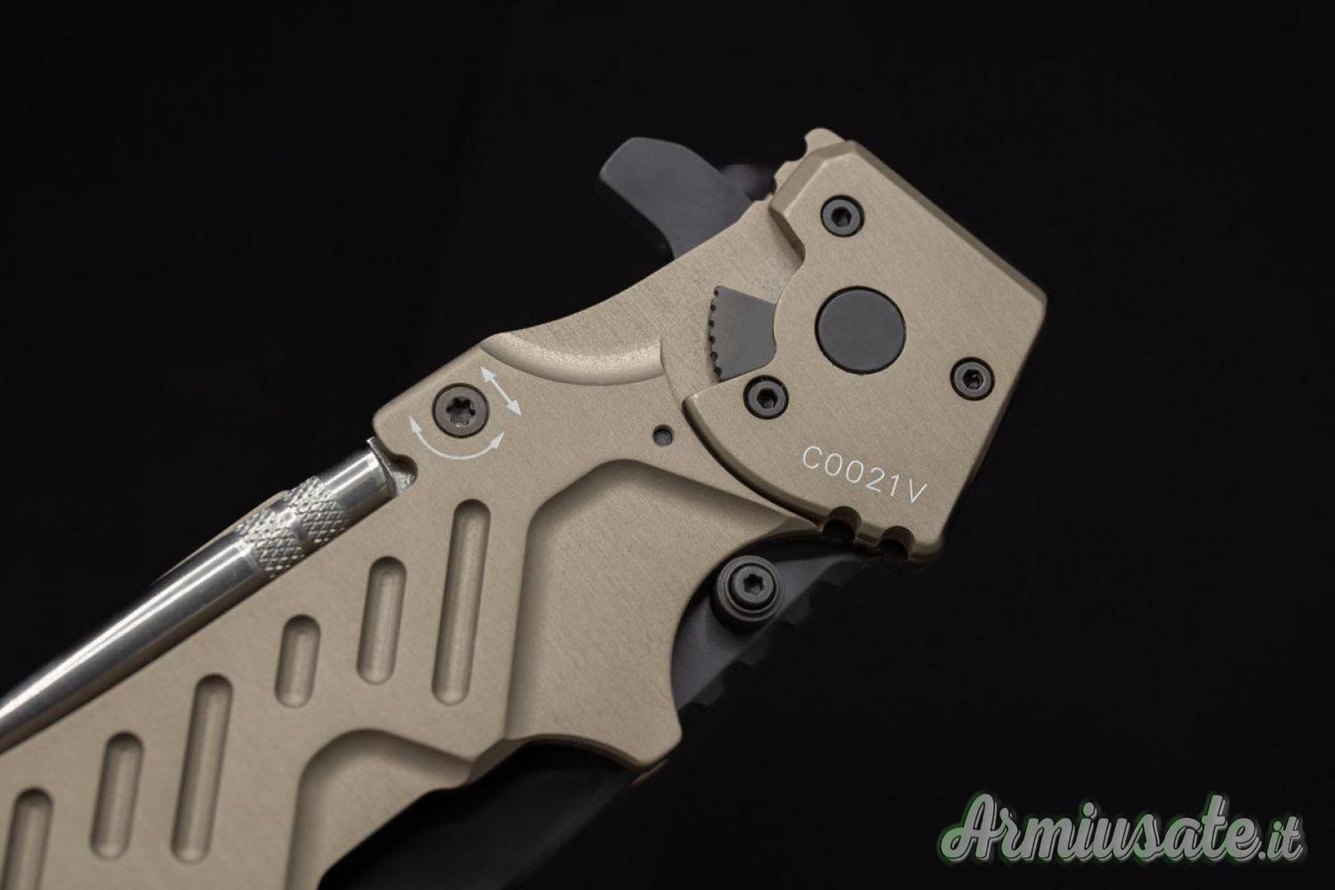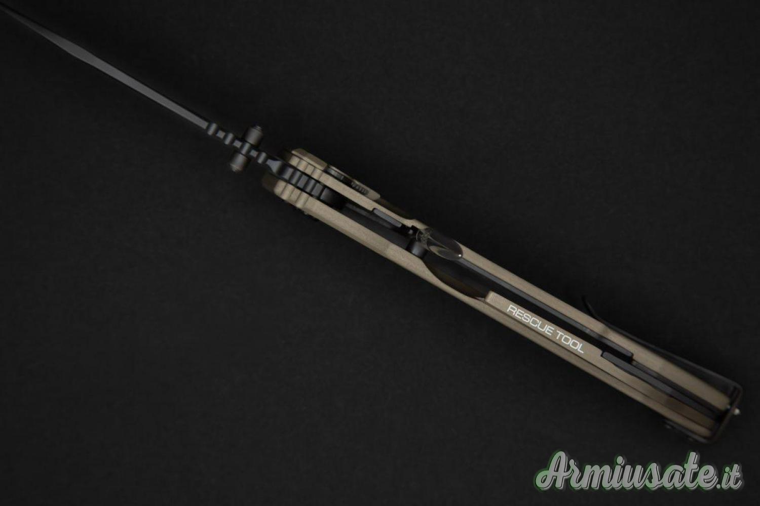 ll sistema di blocco della lama è il collaudato LINER-LOCK al quale si aggiunge un secondo meccanismo di sicura da azionare manualmente. La lama, a punta drop, è prodotta in acciaio Böhler N690 temprato a 58 HRC con la classica finitura nera Extrema Ratio MIL-C-13924.