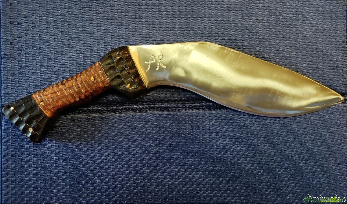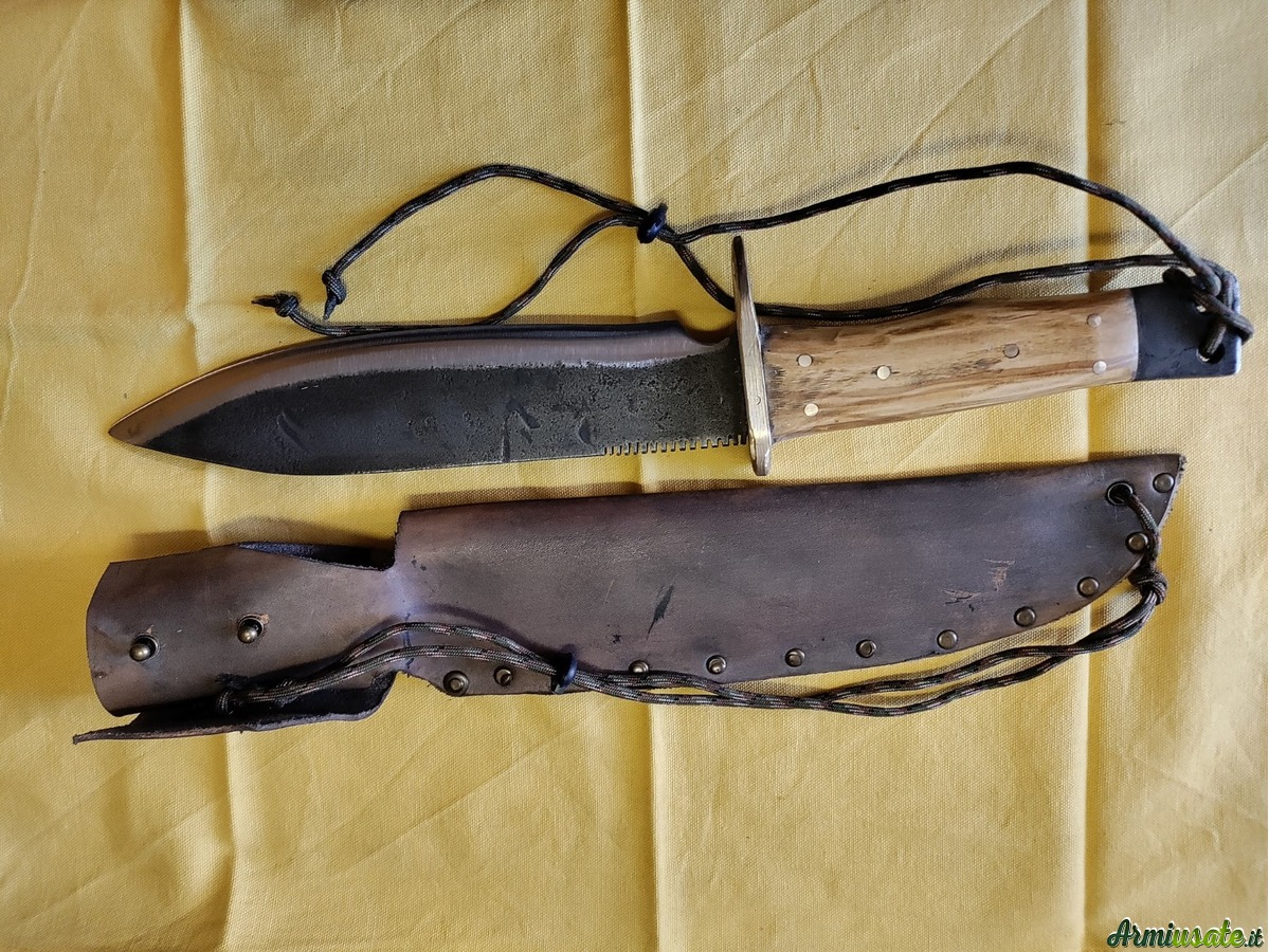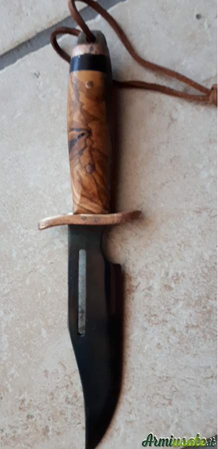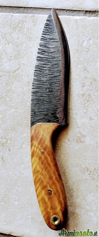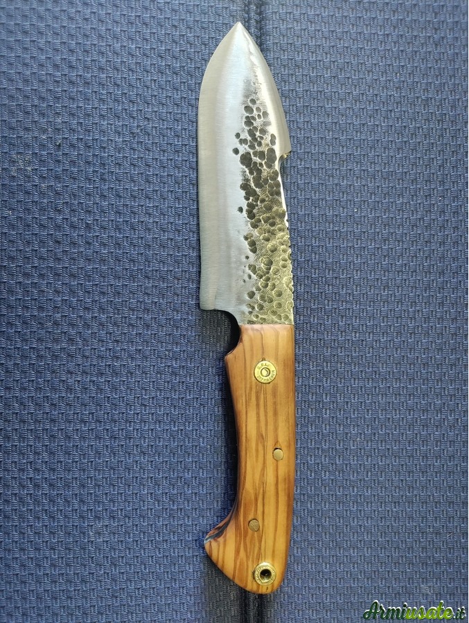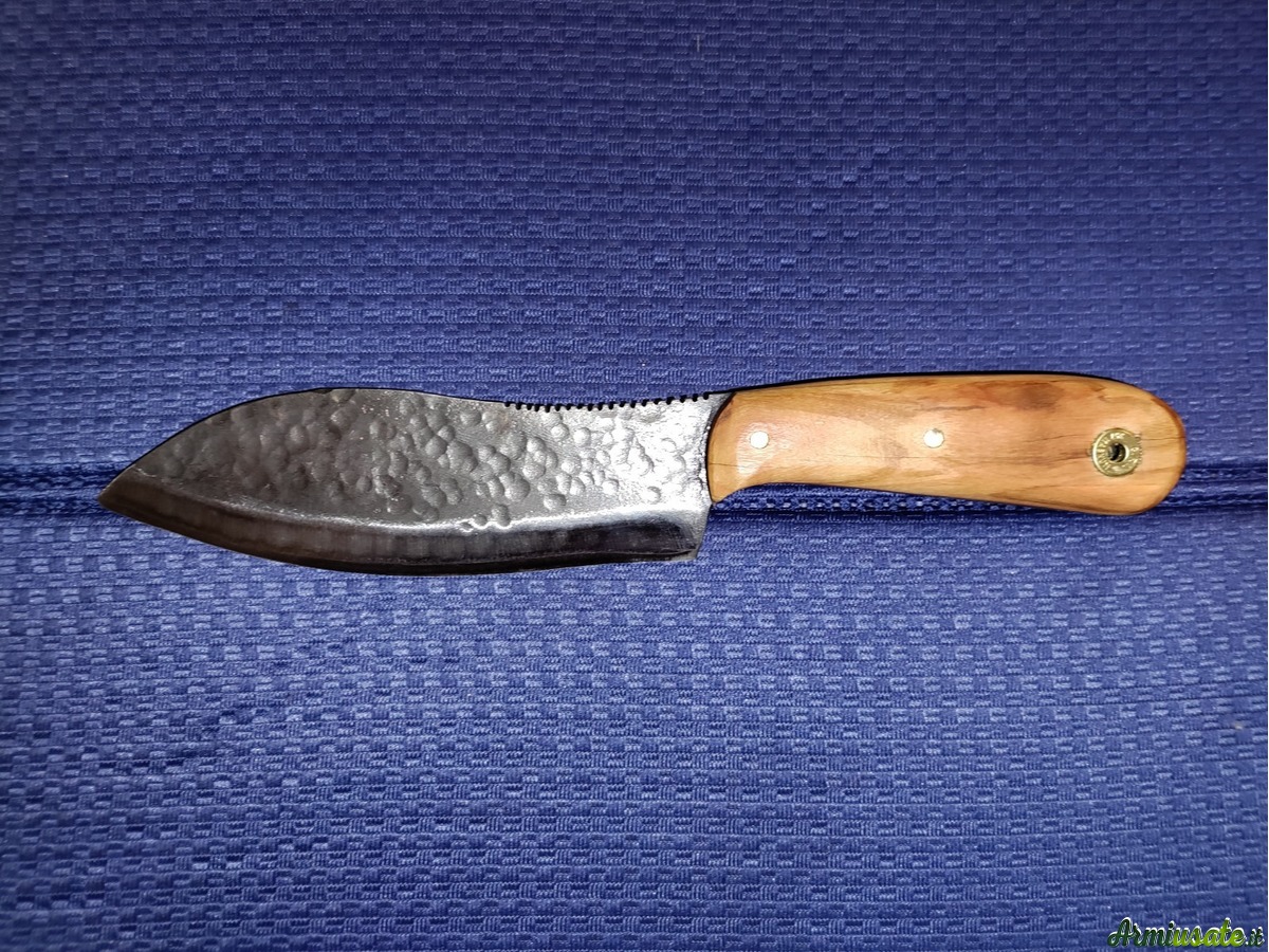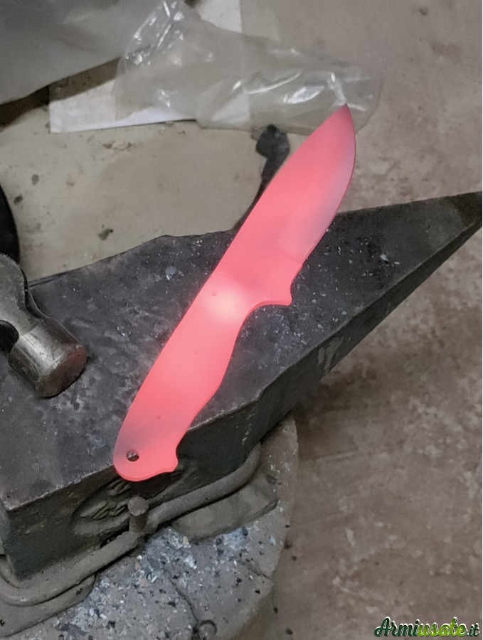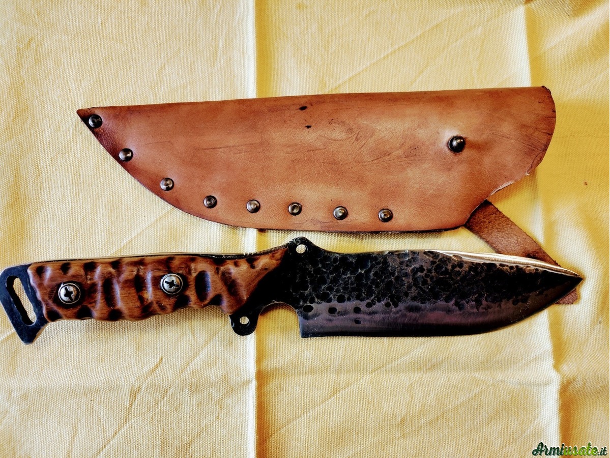 Il punto di partenza sono vecchie balestre di auto o barre di acciaio al carbonio C70 o K720. Lavoro principalmente a mano utilizzando una levigatrice a nastro e una levigatrice a mano con disco da taglio; la tempra avviene in una forgia alimentata a gas che mi consente di raggiungere i 1400 gradi , quindi ben oltre la normale temperatura di tempra .Spegnimento in olio caldo e rinvenimento in forno a 200 gradi per 75 minuti induriscono la lama , le danno flessibilità e tenuta del filo. Posso realizzare lame su disegno o su fotografie fornitemi dall'appassionato e fino a uno spessore di 6/7 mm. I manici possono essere realizzati in varie essenze di legno o in materiali compositi realizzati in micarta o resina bicomponente . I Foderi, su richiesta ,, in cuoio grezzo , sempre fatti a mano , non sono un granchè , ma fanno il loro mestiere .....