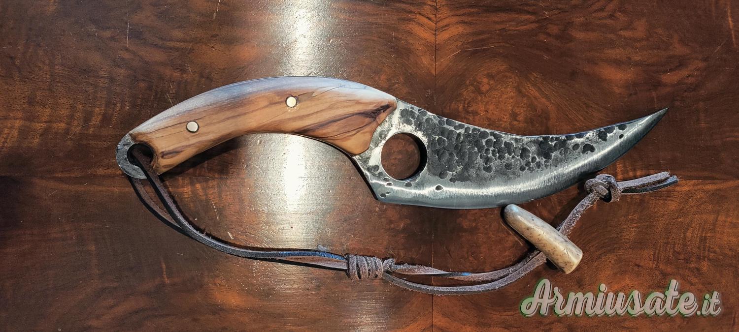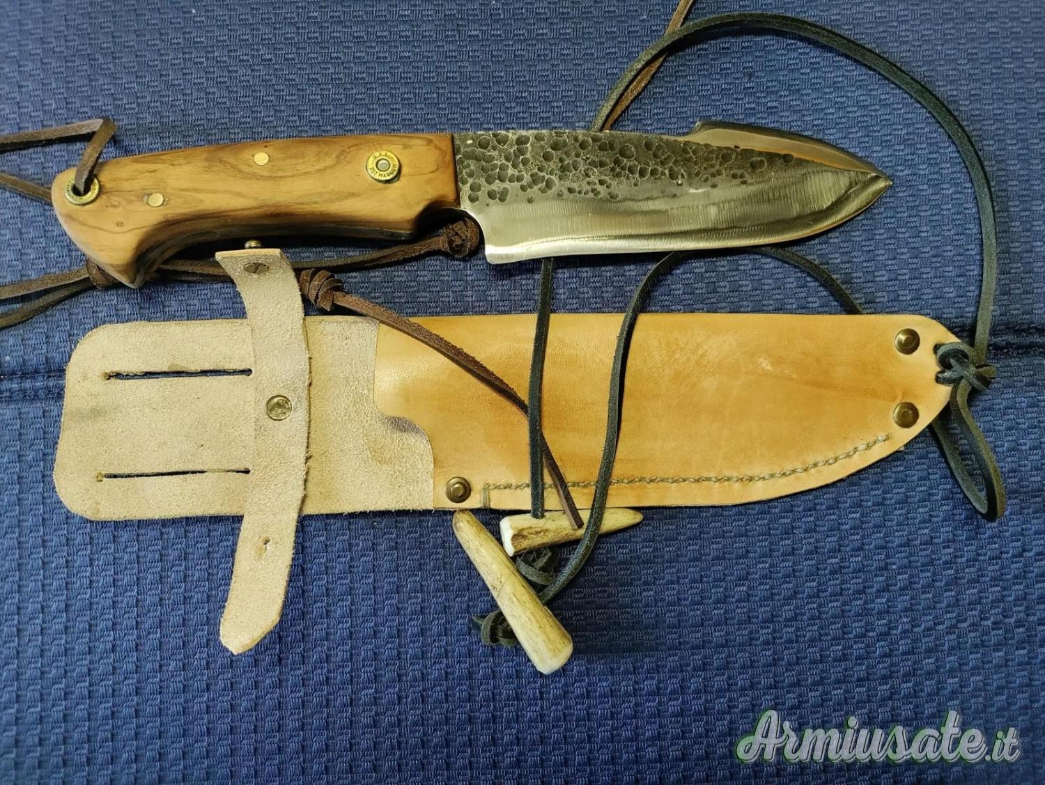Il punto di partenza sono vecchie balestre di auto o barre di acciaio al carbonio C70 o K720. Lavoro principalmente a mano utilizzando una levigatrice a nastro e una levigatrice a mano con disco da taglio; la tempra avviene in una forgia alimentata a gas che mi consente di raggiungere i 1400 gradi , quindi ben oltre la normale temperatura di tempra . Spegnimento in olio caldo e rinvenimento in forno a 200 gradi per 75 minuti induriscono la lama , le danno flessibilità e tenuta del filo. Posso realizzare lame su disegno o su fotografie fornitemi dall'appassionato e fino a uno spessore di 6/7 mm. I manici possono essere realizzati in varie essenze di legno o in materiali compositi realizzati in micarta o resina bicomponente oppure in corno di cervo . I Foderi, su richiesta ,, in cuoio grezzo , sempre fatti a mano , non sono un granchè , ma fanno il loro mestiere .....