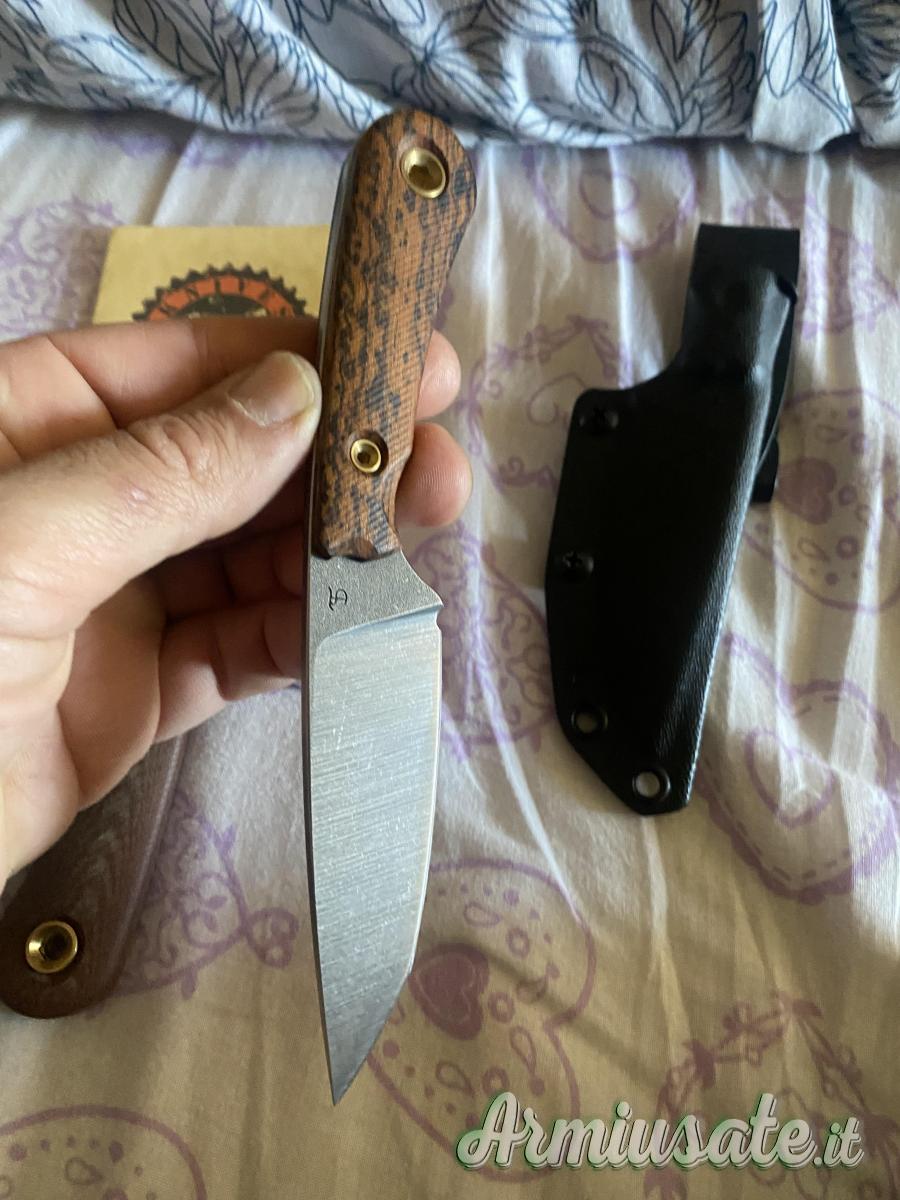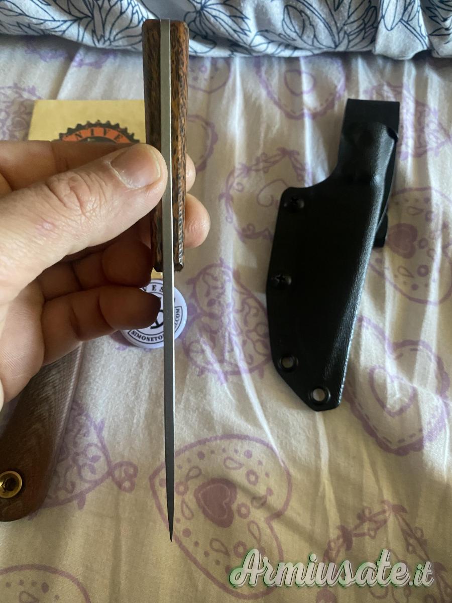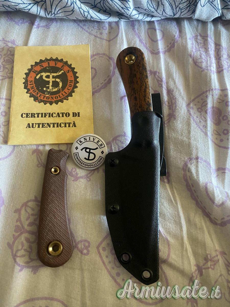 Vedo ruk di Simone Tonolli lama in niolox,manicatura in legno bocote più una manicatura in micarta naturale,finitura della lama richiesta raw,nuovo mai usato