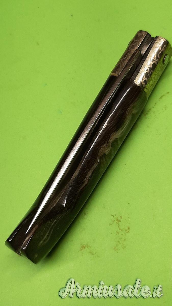 “DOMUS DE MARIA-A.CHERCHI” . L’impugnatura ha bellissime guancette in corno di montone lucidate e la ghiera è in alpacca incisa. Manufatto molto curato ! Misura aperto cm 19,5 – lama cm 8,7