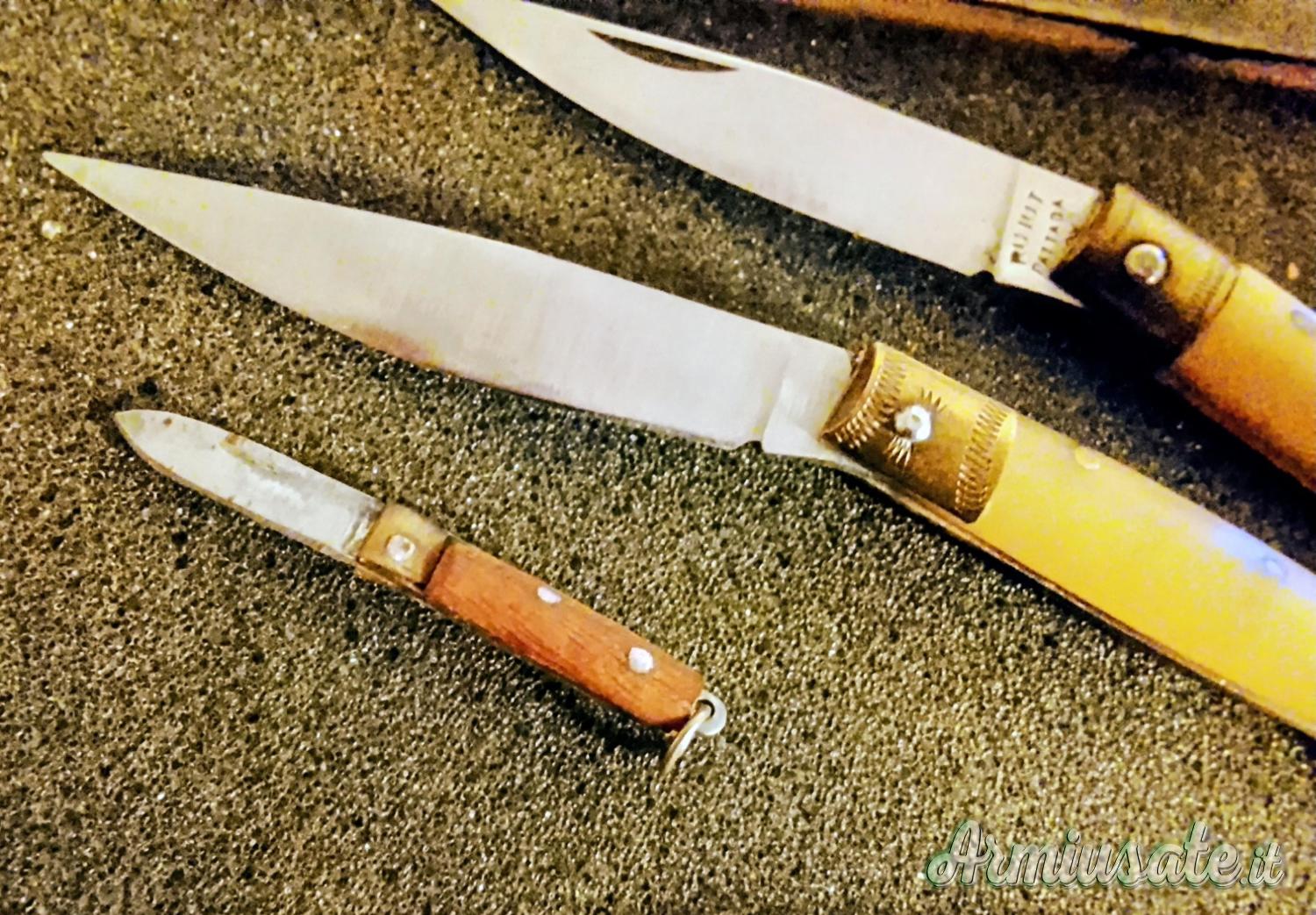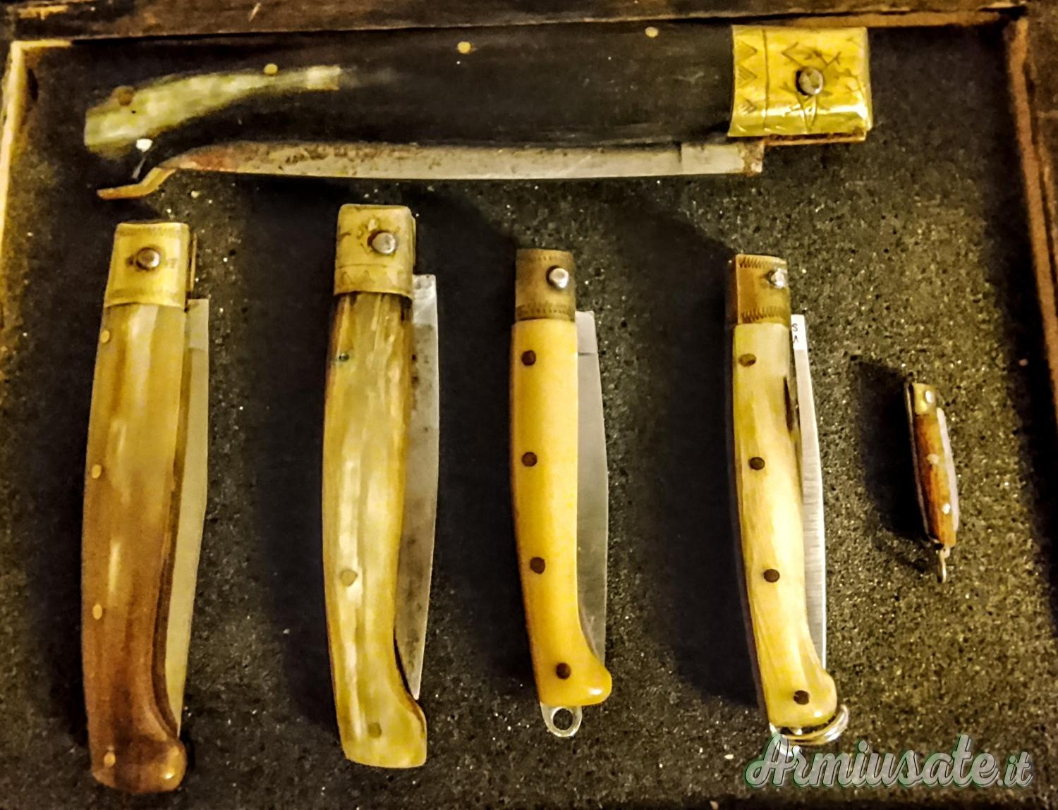 6 pattadesi di varie misure con manico in osso,ruiu,vittorio mura e pattada in originale cofanetto in legno