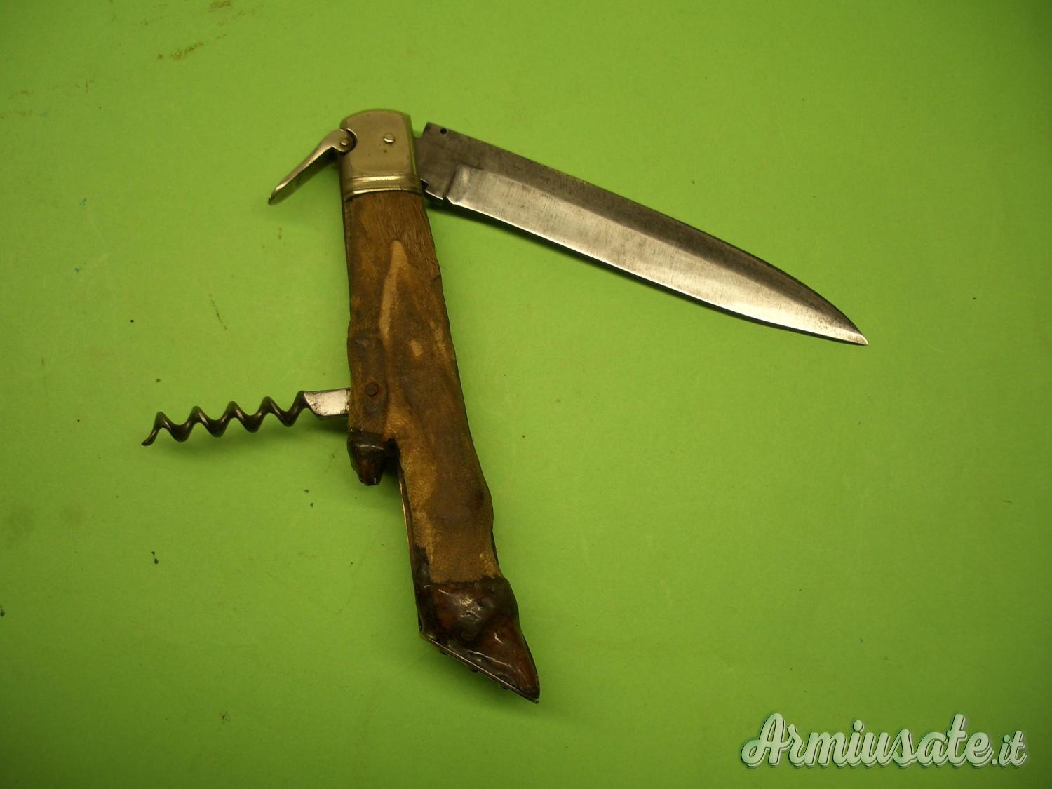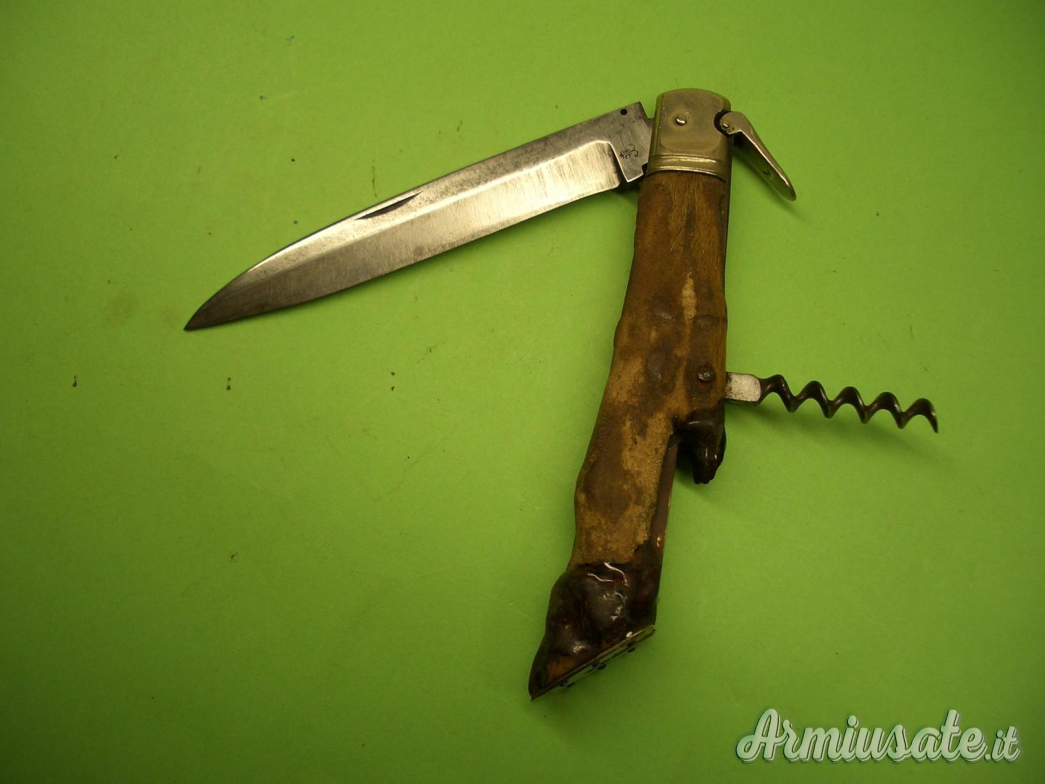 Impugnatura con guancette ricavate da una zampetta di Capriolo, ottimamente “ferrate” sullo zoccolo in Alpacca. Le testine e la leva sblocco lama sono anch’esse in Alpacca. Coltello corredato di cavatappi a vermicello.