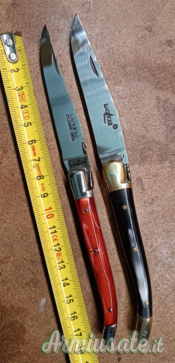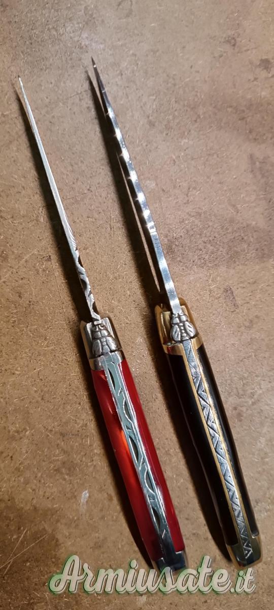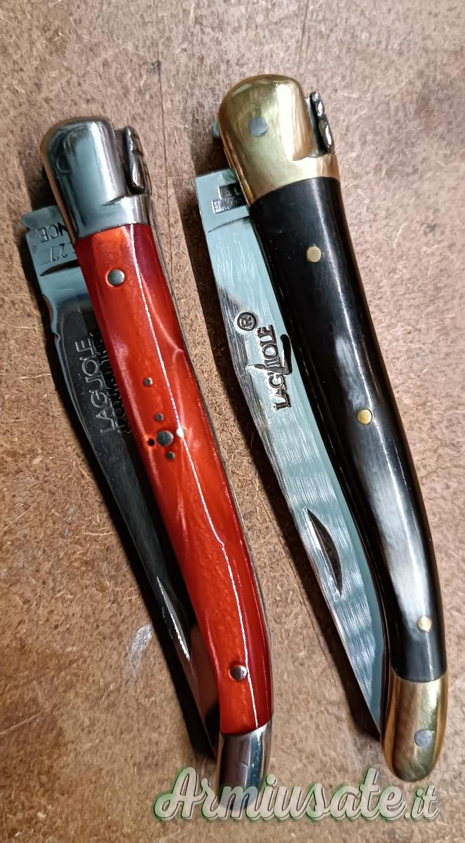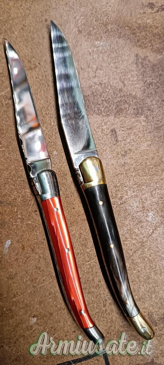 Vendo laguiole JP Couvert lama in 12c27, piastre inox e manico in materiale sintetico, ed un Forge de Laguiole lama in T12 piastre ottone e manico in corno, piccola incisione sul retro lama,(vedi foto),molla potente e tenuti molto bene. Il prezzo è cadauno.