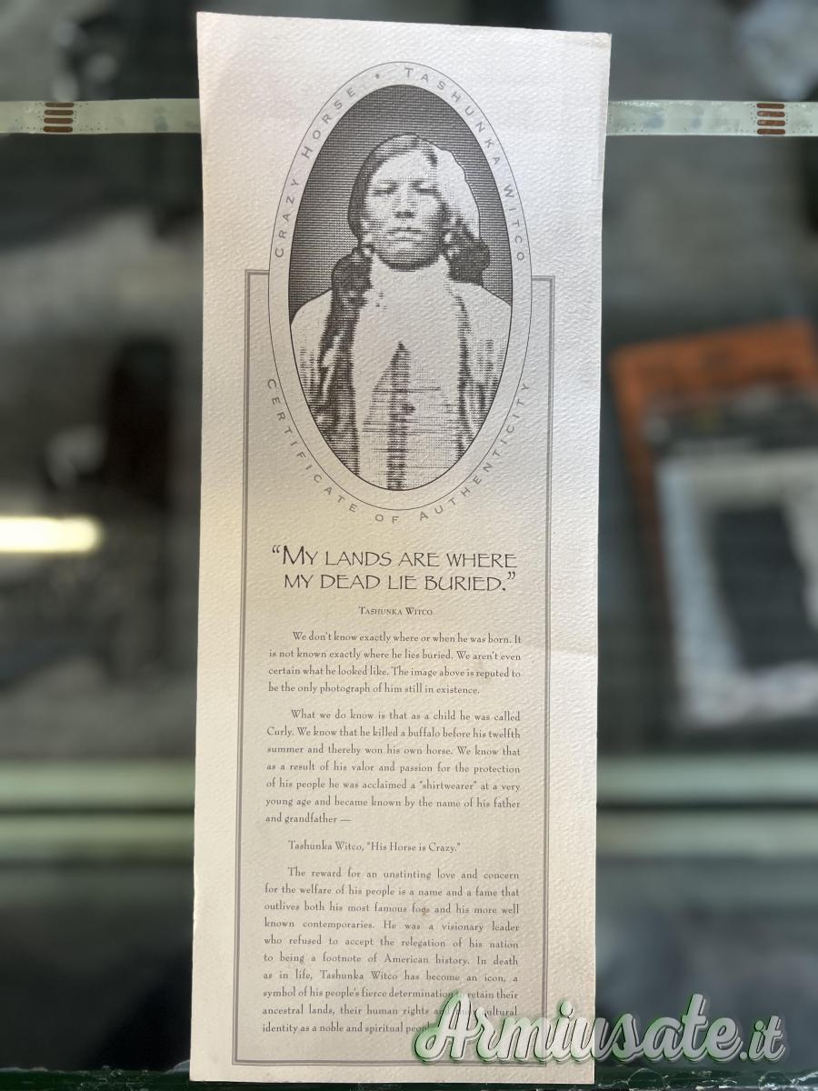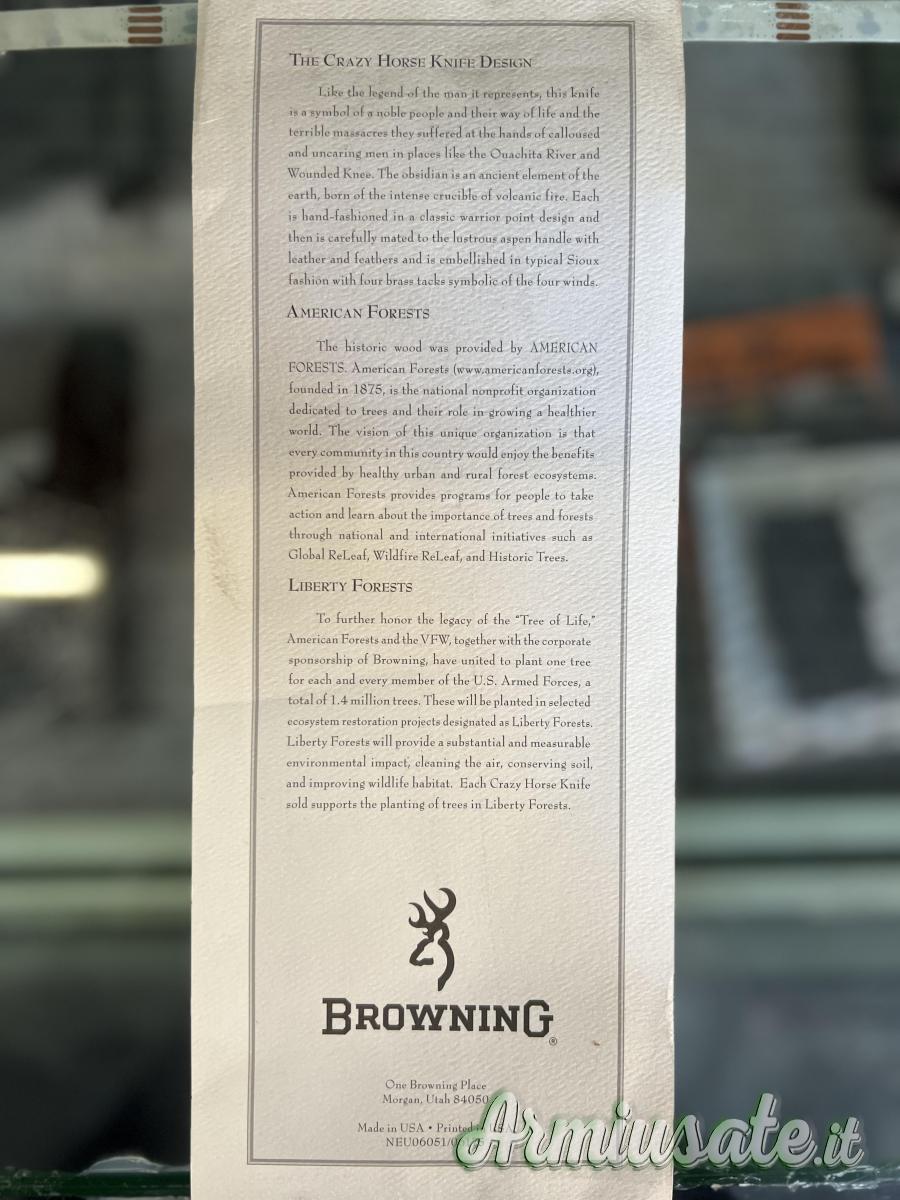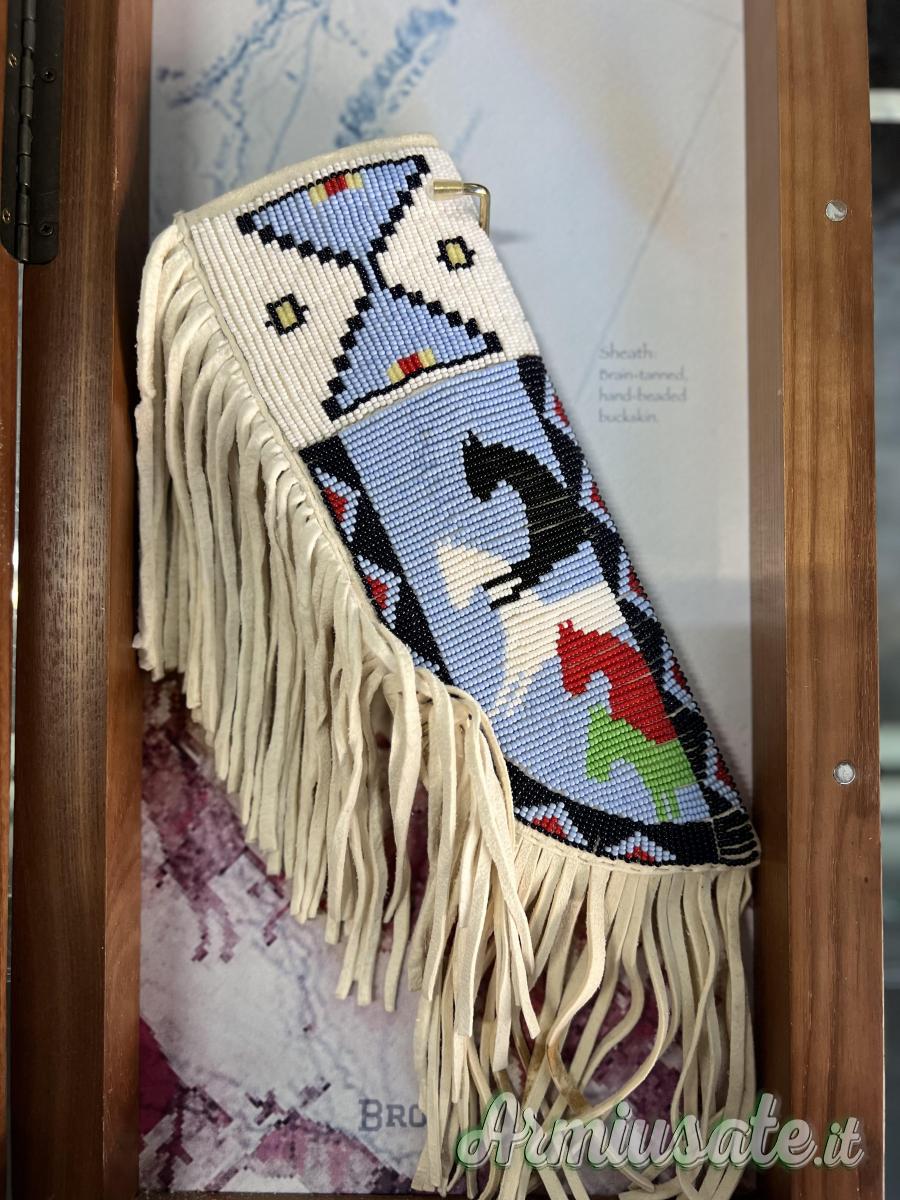 Il coltello è dotato di una lama in ossidiana della Colline Nere (Crazy Hills), incastonata ad un manico d’osso e affrancata con legamenti e tendini di specie animale.