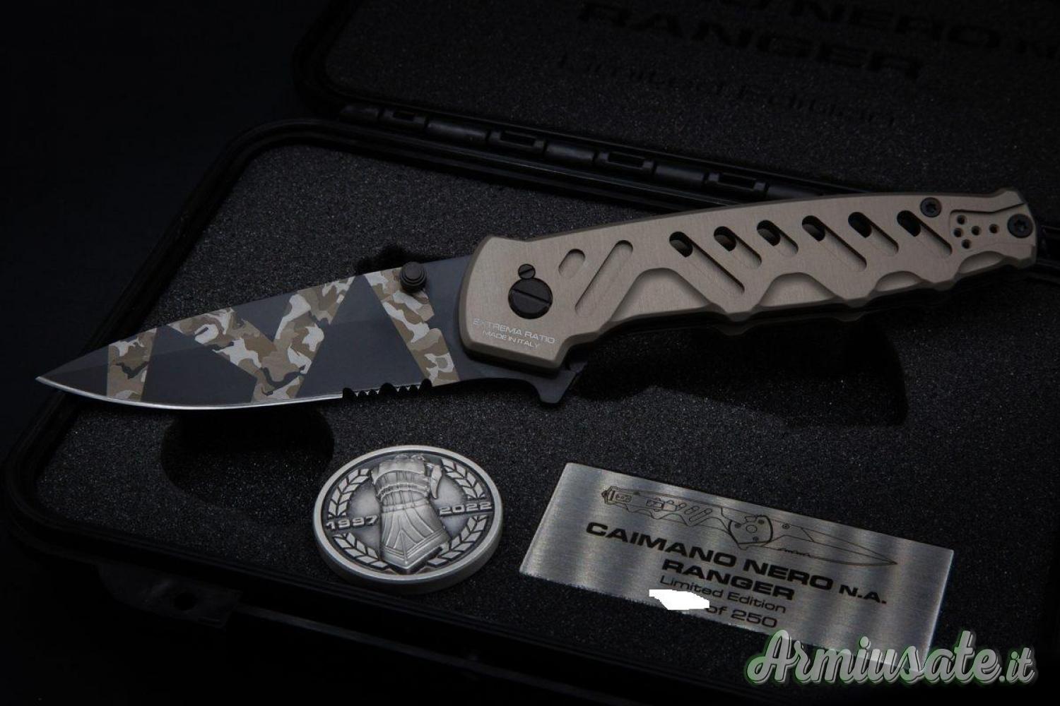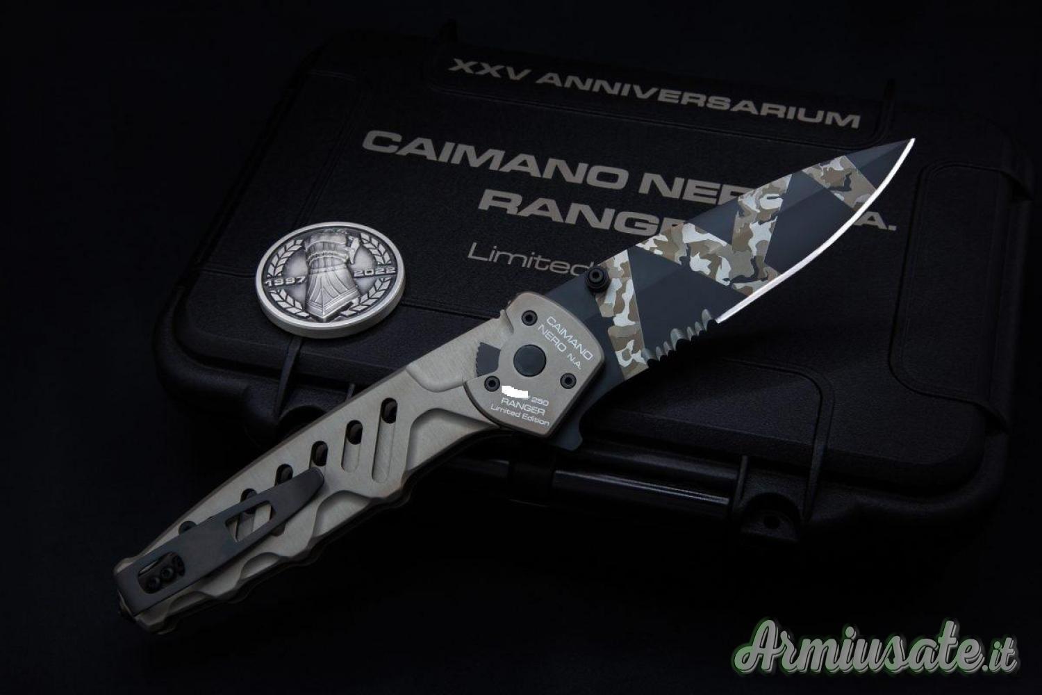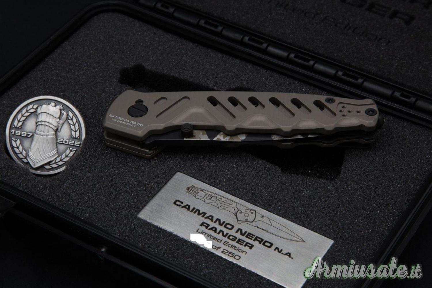 Extrema Ratio Caimano Nero N.A. Ranger XXV Anniversarium Limited Edition è una versione in serie limitata a soli 250 esemplari che conserva intatte tutte le caratteristiche del celebre modello Caimano Nero N.A., versione non automatica del coltello tattico che Extrema Ratio ha consegnato al G.O.I. (Gruppo Operativo Incursori) della Marina Militare Italiana.