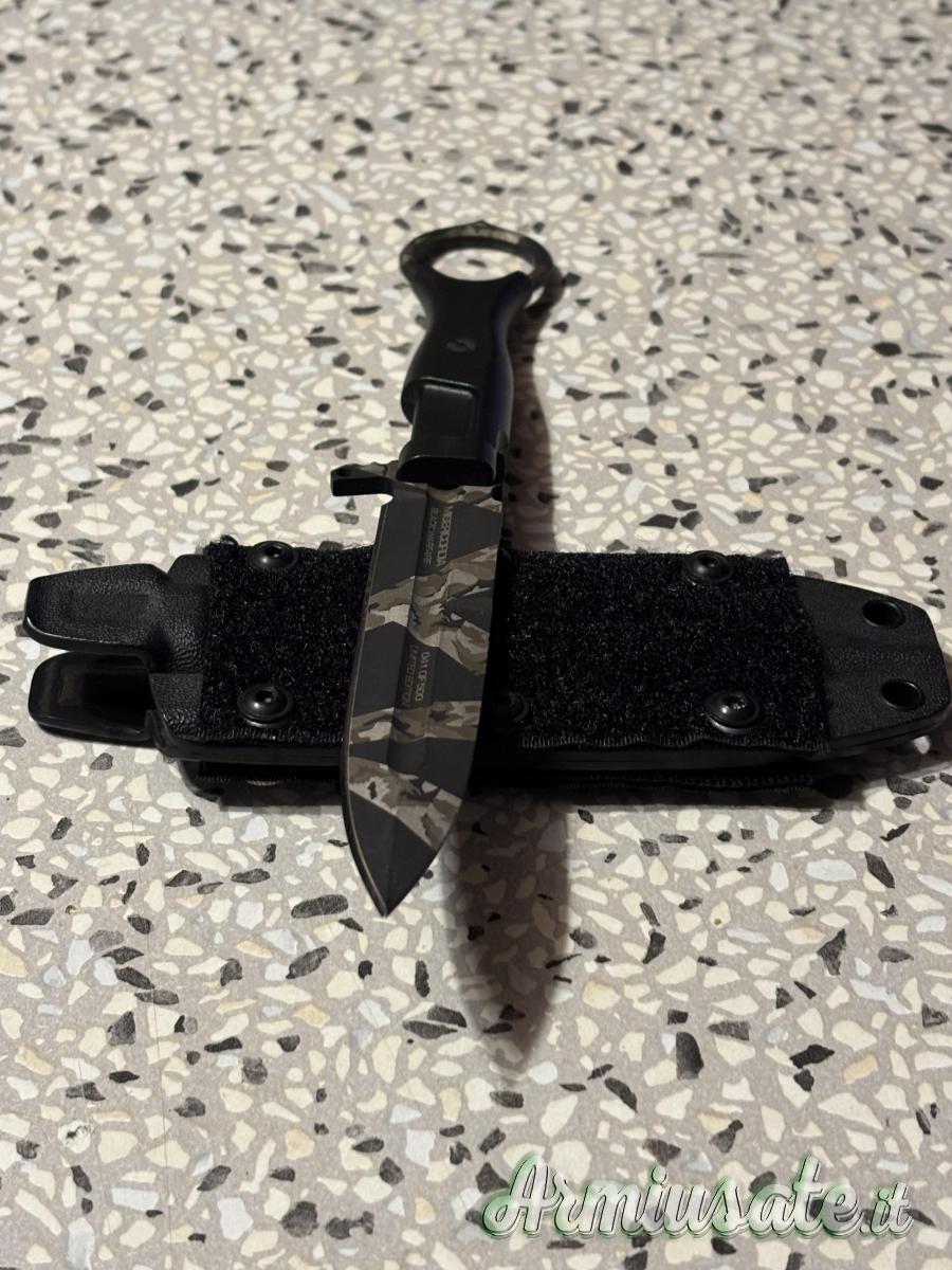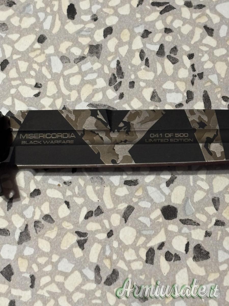 The Kydex sheath offers the possibility of hooking via belt-clip, ulti-clip and malice-clip. In addition, it is possible to hook the sheath to the M.O.L.L.E. system by braiding the paracord cord. An optional high-strength Nylon sheath is also available with 2 adjustable loops that allow it to be fixed on M.O.L.L.E. systems. The Misericordia Black Warfare is supplied in a technical case in IP67 certified waterproof Polypropylene, with a pressurization valve, resists atmospheric agents, dust and shocks, inside which are also the Kydex sheath, the double UTLICLIP, the double-grain sharpening plate (ceramic abrasive and synthetic diamond) and the metal plate with the progressive number of the limited series.