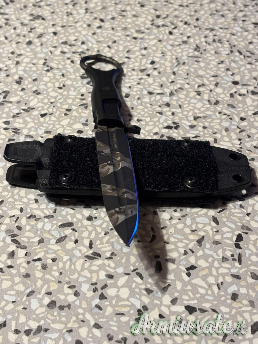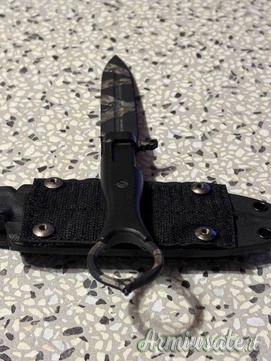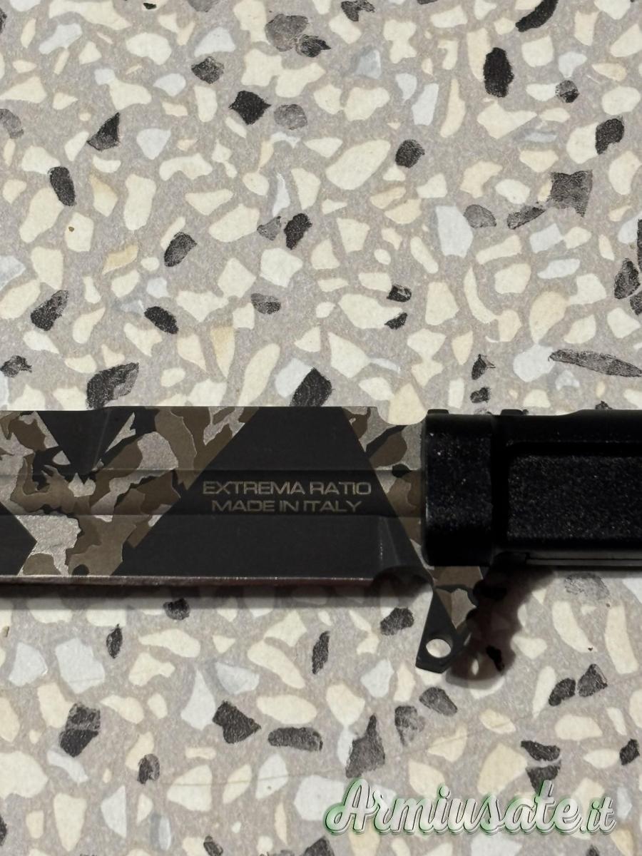 The blade is milled from Böhler N690 steel, hardened to 58 HRC for the best balance between wire tightness and strength, it is 118 mm long, 4 mm thick and has a flat wire. The weight of the knife is just 87g. The profile is of the spear-point type, with a full-length shell that makes it even lighter, characterized by a false ¾ long counterwire and equipped with a Black Warfare finish, with the innovative and original Extrema Ratio Geotech Camo pattern, made by laser engraving.