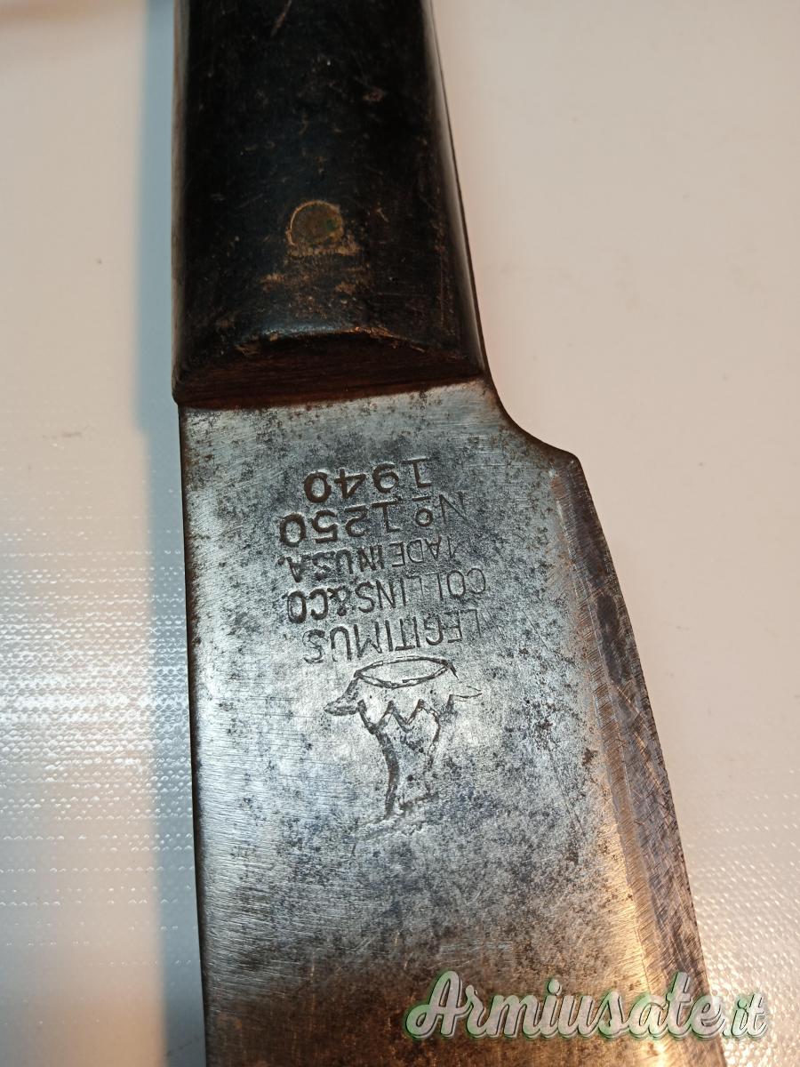 Autentico machete statunitense della Seconda Guerra Mondiale, usato, lama da cm 37, completo di fodero in pelle. Marchio del produttore Legitimus Collins & Co. "Made in U.S.A." N. 1250, datato 1940.