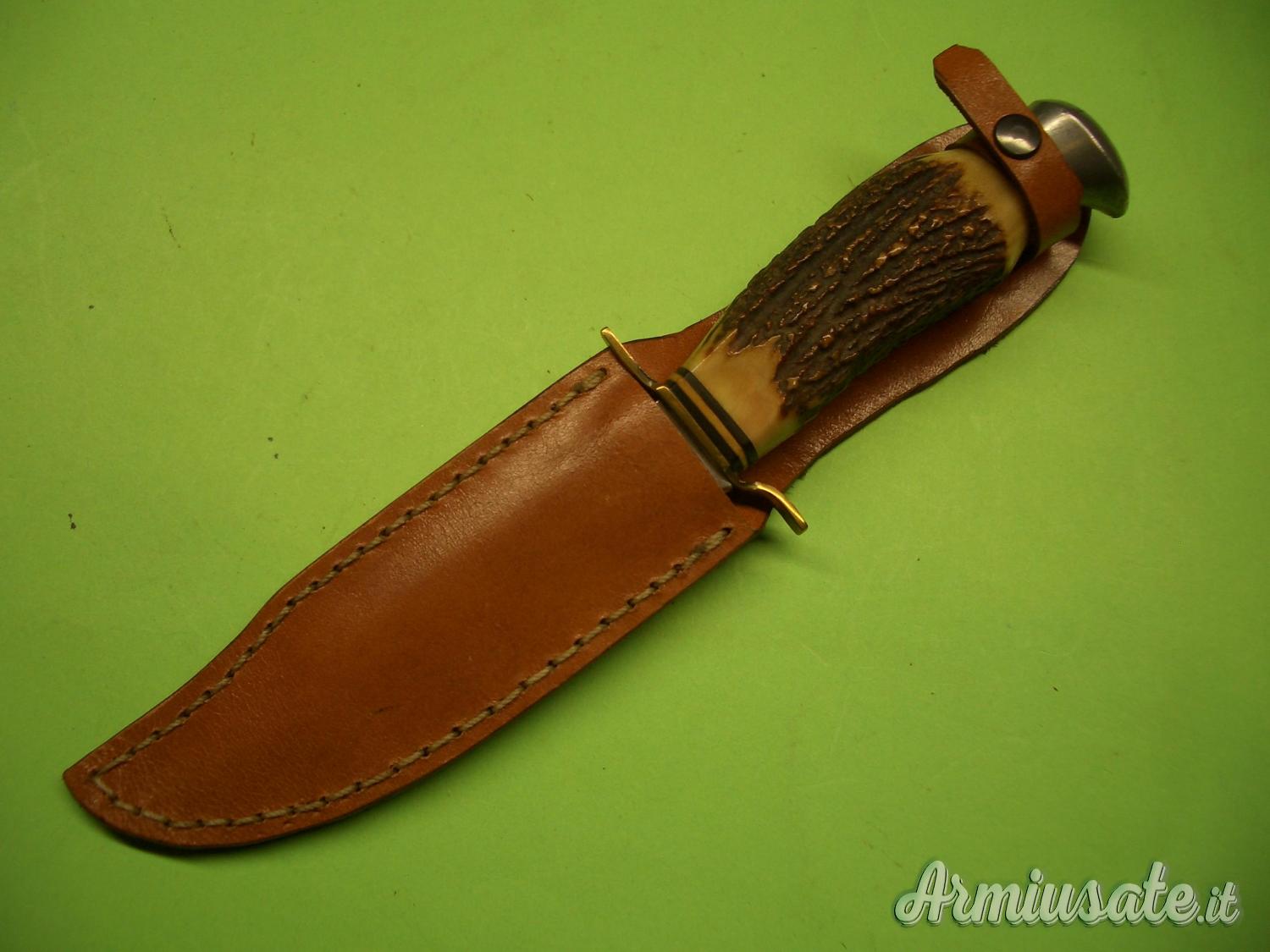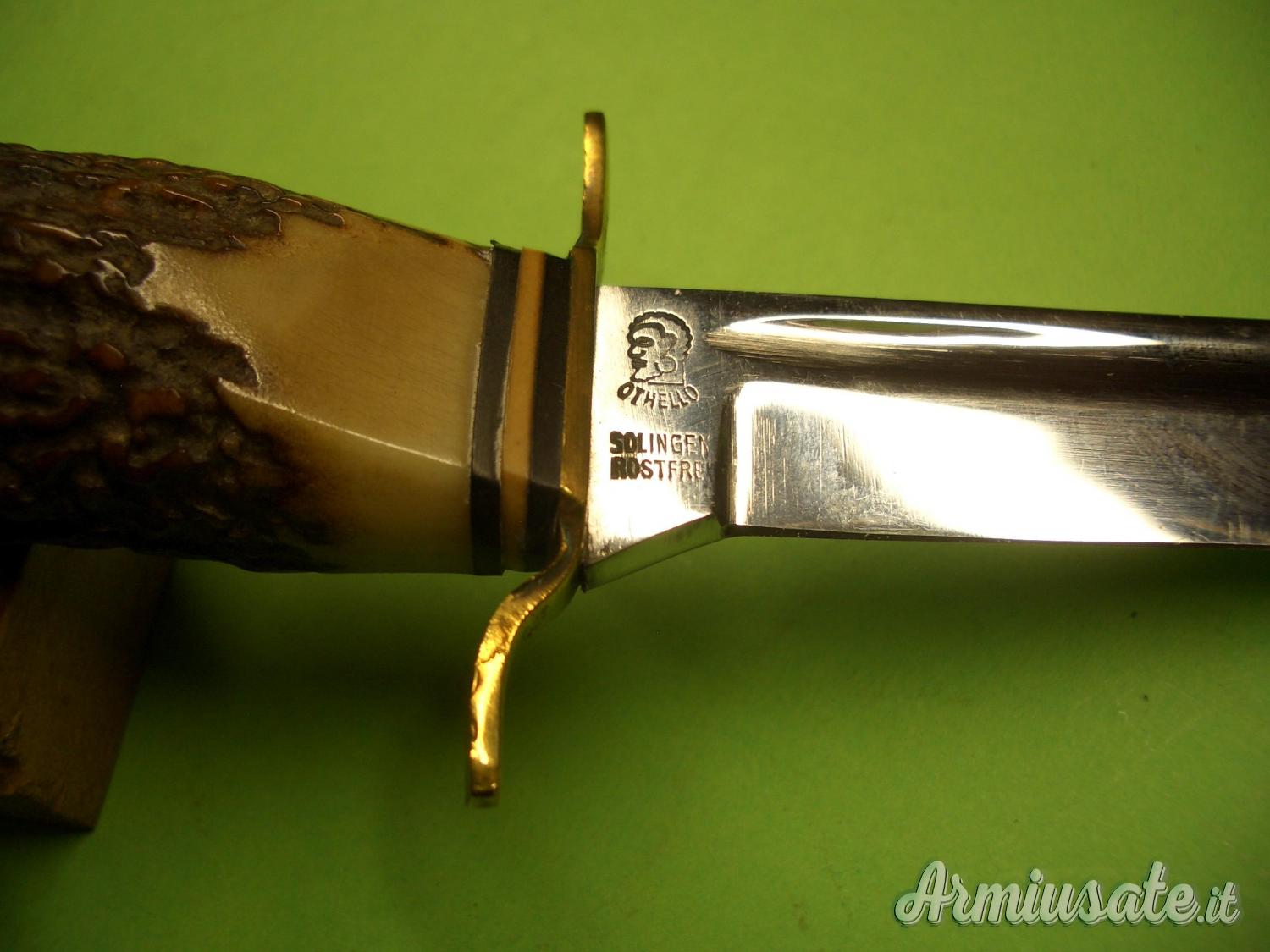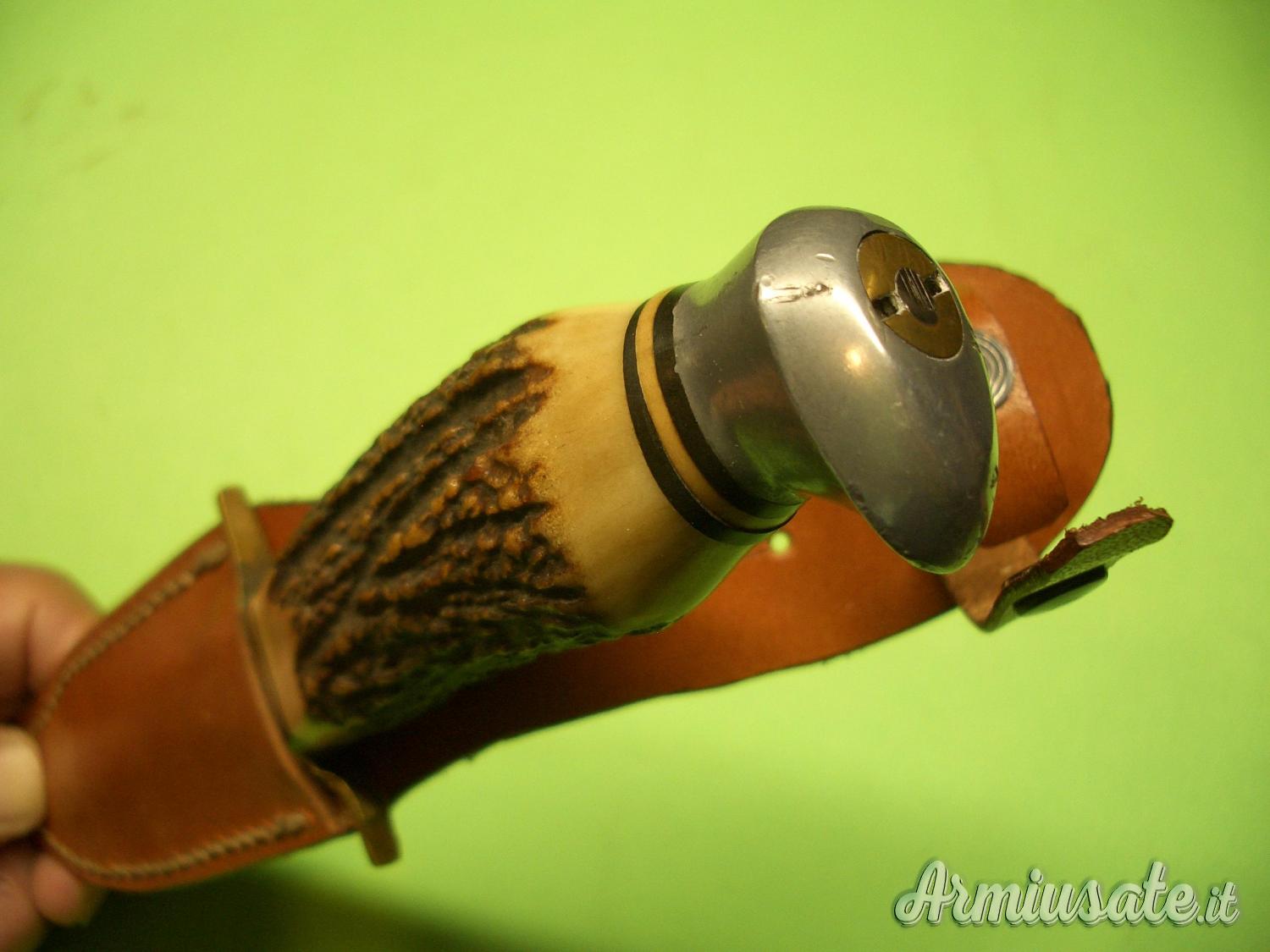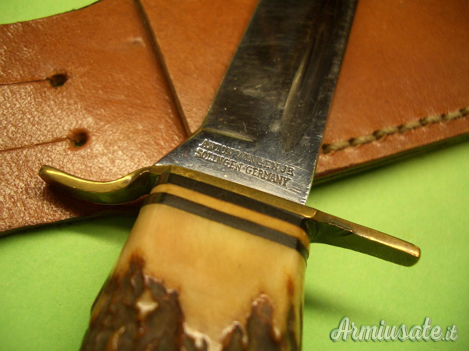 e ANTON WINGEN Jr-SOLINGEN-GERMANY”. L’impugnatura è in un sol pezzo di corno di Cervo trapassato dal codolo della lama fino al pomolo in alluminio. La guardia è in ottone.