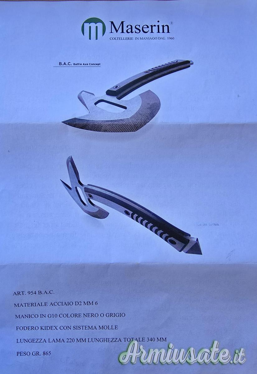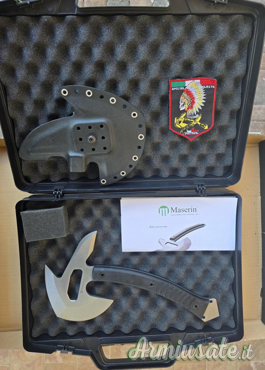 Da collezione privata vendo Maserin B.A.C. 954 Ax, come nuova, mai usata, sempre tenuta in collezione, acciaio D2 spessore mm.6, lama lunghezza cm.22, lunghezza totale cm.34, manico nero in G10, fodero in Kidex con sistema MOLLE, dotata di pach, valigetta e documentazione. Consegna a mano gratuita o spedizione nazionale euro 15,00, spedizione Unione Europea al costo di euro 20,00.