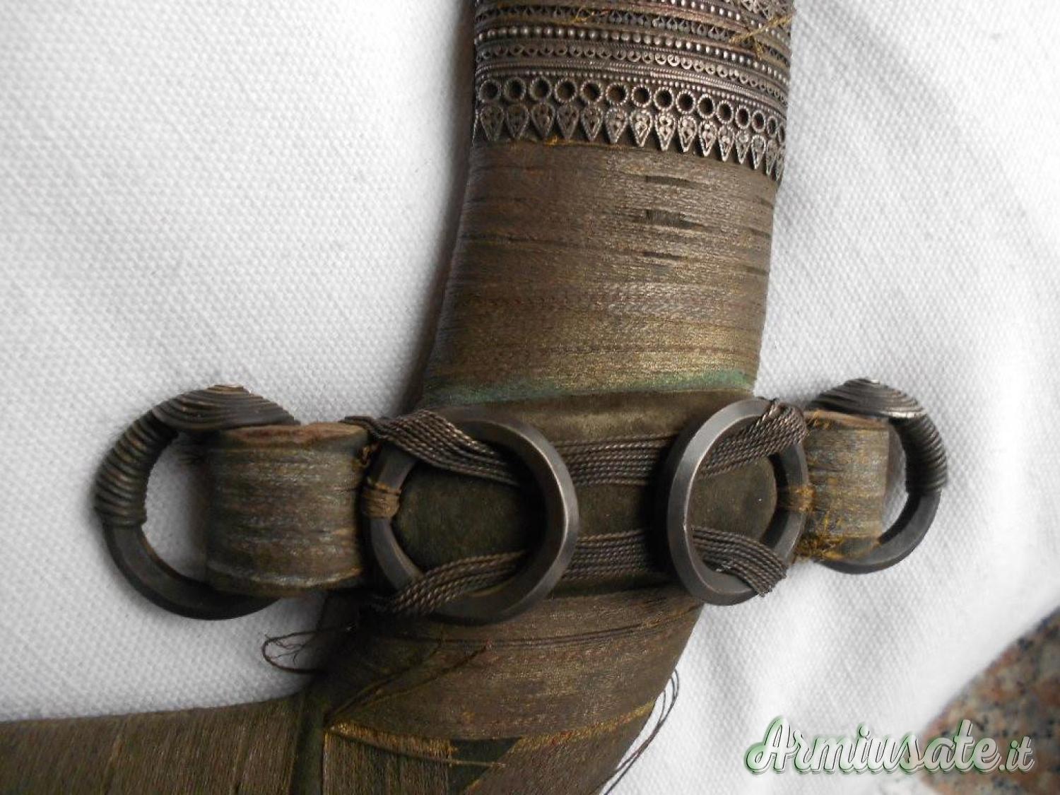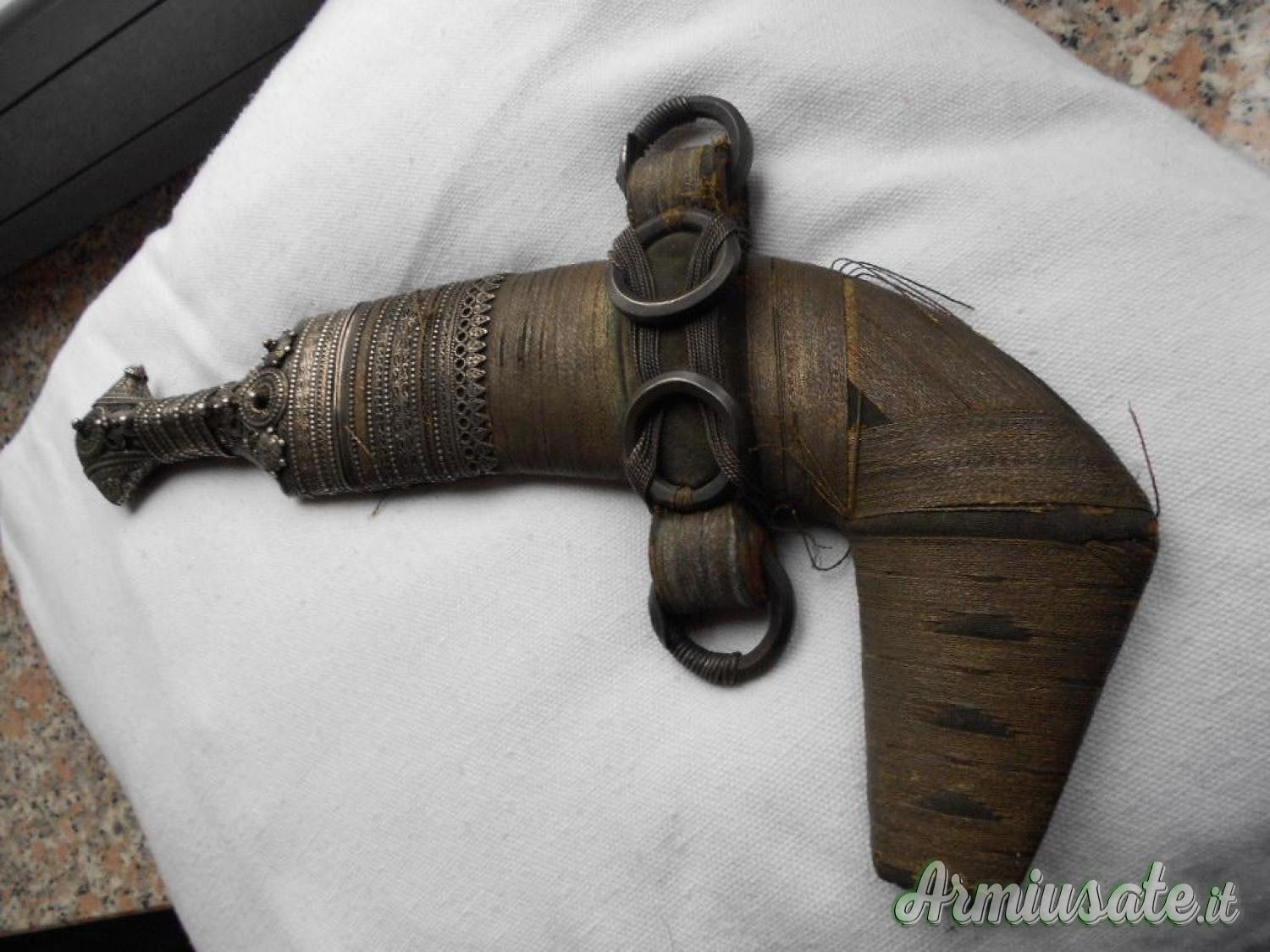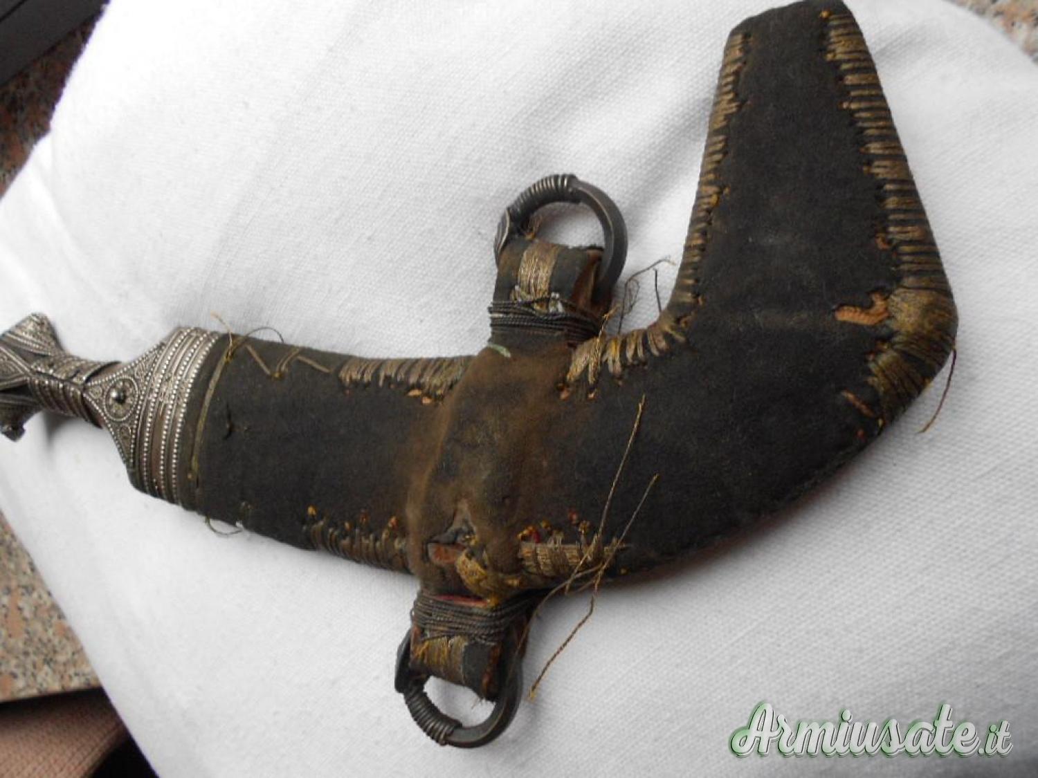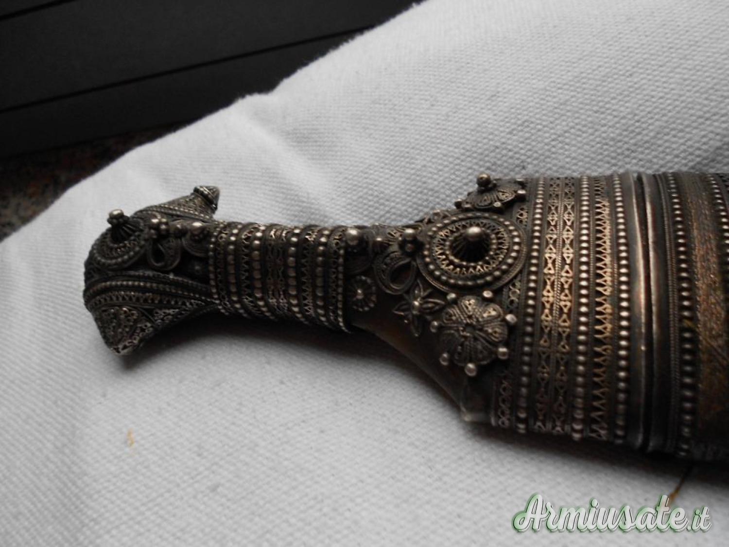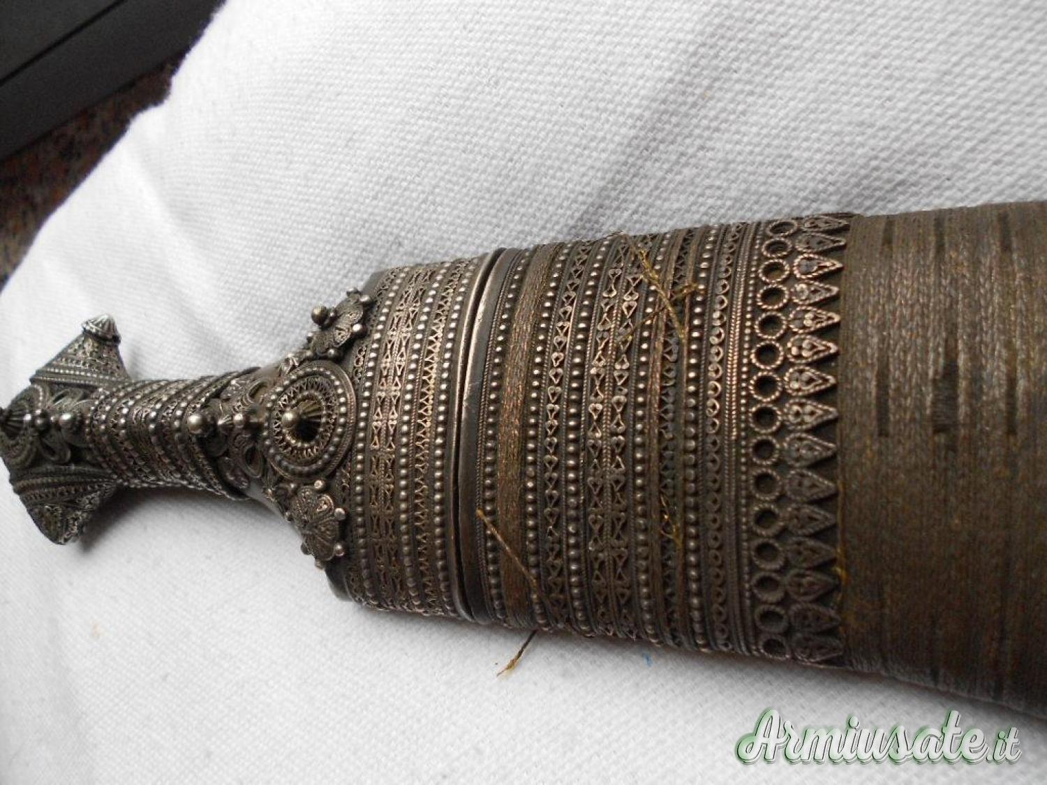 Cedo pugnale arabo JAMBYIA , tipica lama curva a due fili co nervatura centrale piccola ossidazione, fornimenti impugnatura in argento riccamente decorato a fili perlinati fodero in legno rivestito in filo dorato al centro attacchi per la cintura,la parte posteriore ricoperto di pelle. Lung. totale cm. 32-