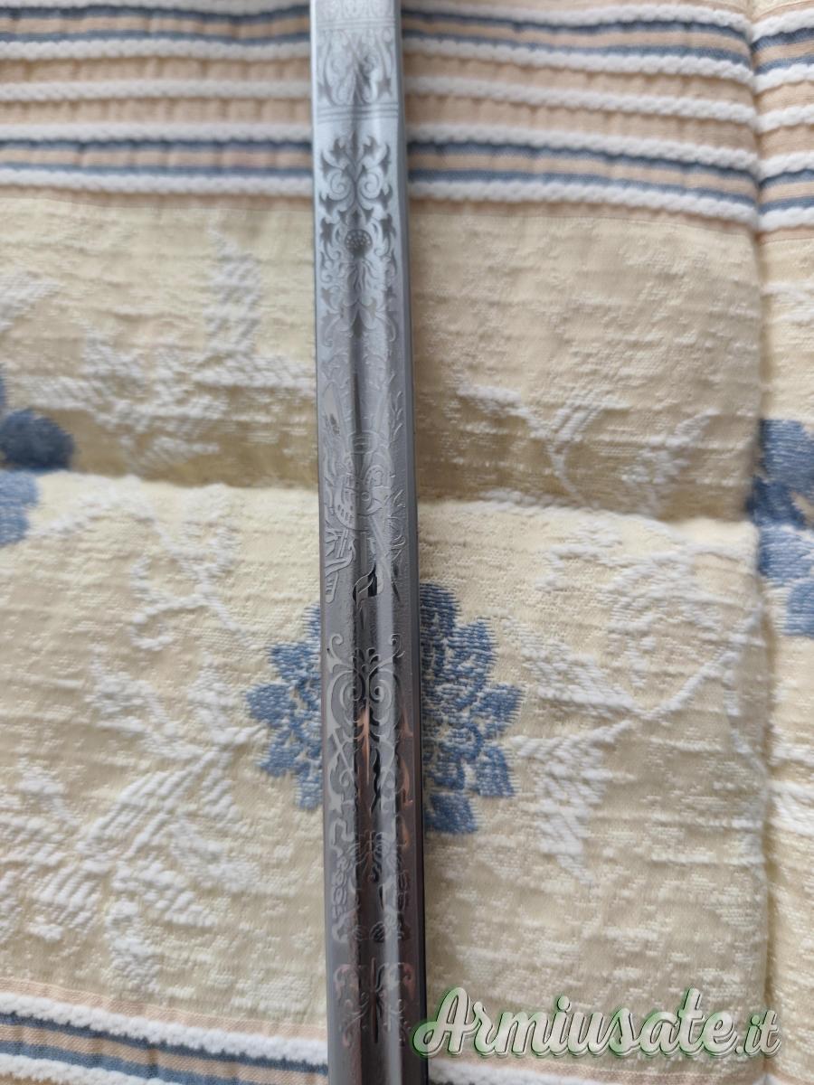 Vendo sciabola d'ordinanza della Marina Militare della ditta Sartore. Lama serigrafata. Completa di dragona per Sottufficiali. Lunghezza totale 107 cm. Eccellenti condizioni.