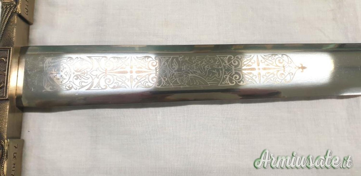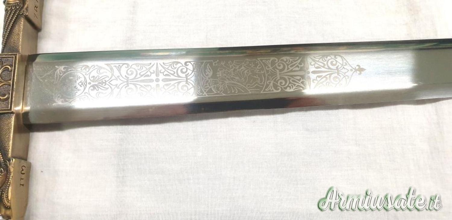 Lama in acciaio 420, non affilata, con decorazioni eseguite a laser, impugnatura in metallo bronzato. Lunghezza totale 98 cm, Lunghezza lama 80 cm, spessore lama 5,20 mm, peso 1.850 g