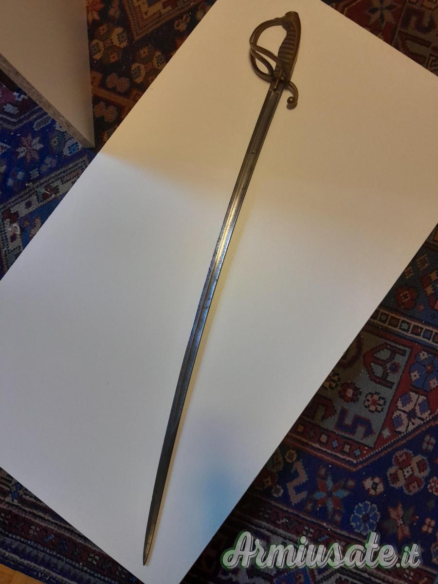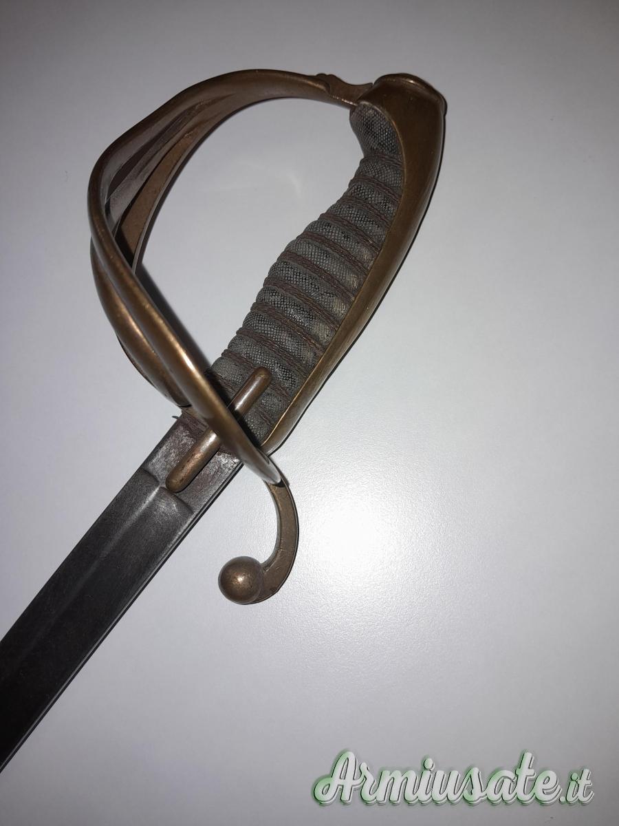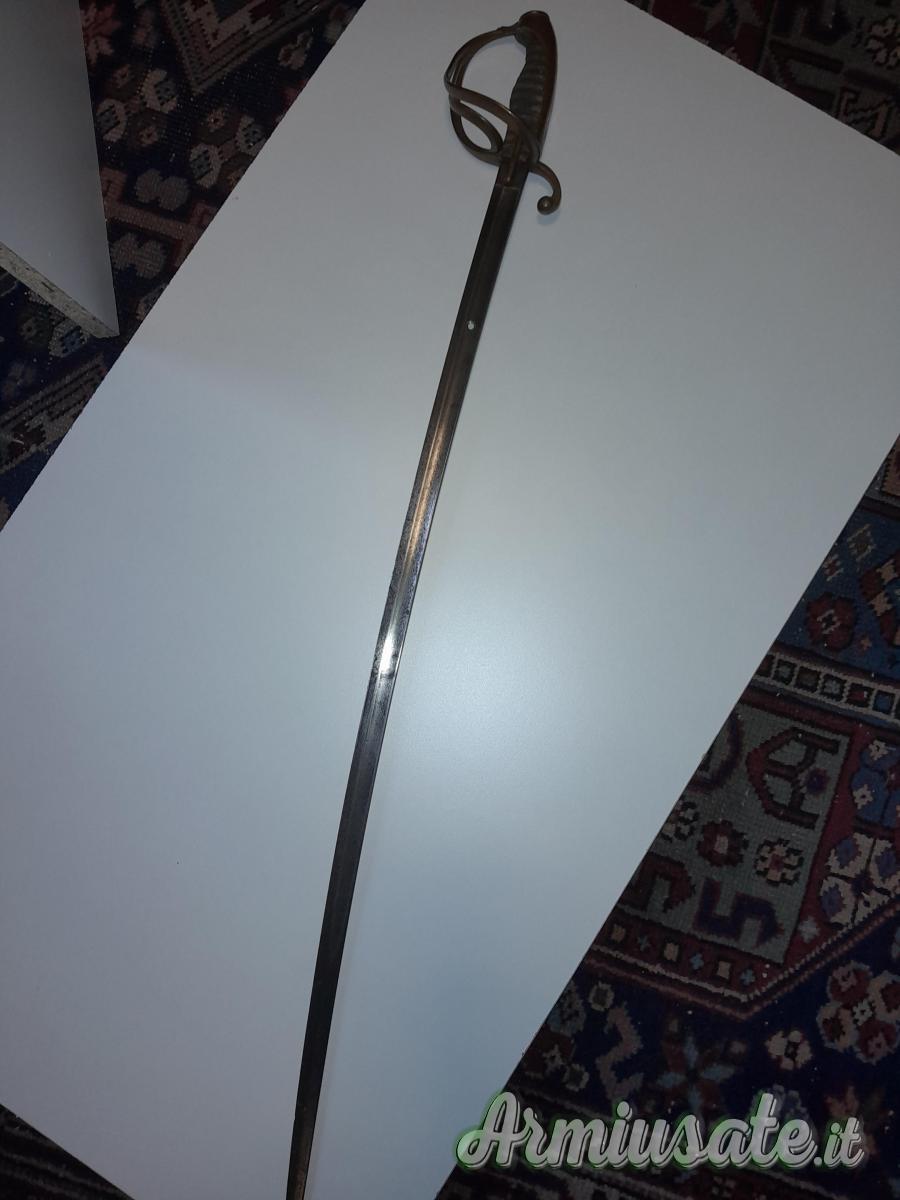 Sciabola di dimensioni ridotte con impugnatura identica a quella da marina del Regno Sardo per ufficiali del battaglione Real Navi mod. 1821. (Lupo pag. 511 e ss).Senza fodero. La lama presenta un foro di mm 4 a 20 cm dal tallone. Da bambino? Da rappresentanza? Lama fatta a Solingen. Lung. lama 75.5 cm. Impugnatura lunga 12 cm. È in denuncia.