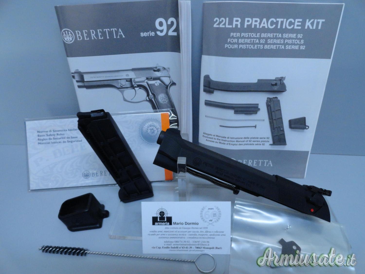 Kit originale Beretta di conversione in calibro 22 Long Rifle utilizzabile sulla pistola Beretta serie 92/98 ( e sue varianti ). Il kit ( che è NUOVO ) è soggetto a denuncia d’acquisto ma ovviamente non rientra nel quantitativo delle armi detenibili, comprende: assieme carrello/otturatore ( la cui tacca di mira, peraltro, è del tipo registrabile sia in elevazione che in derivazione ), assieme canna, asta con relativa molla di recupero, caricatore la cui capacità è per 10 cartucce, carichino, scovolo, chiavi regolazione tacca di mira, manuale d’uso della pistola Beretta serie 92, manuale d’uso del Practice kit, valigetta. ( Cod.: 309 ) Vendesi € 720,00